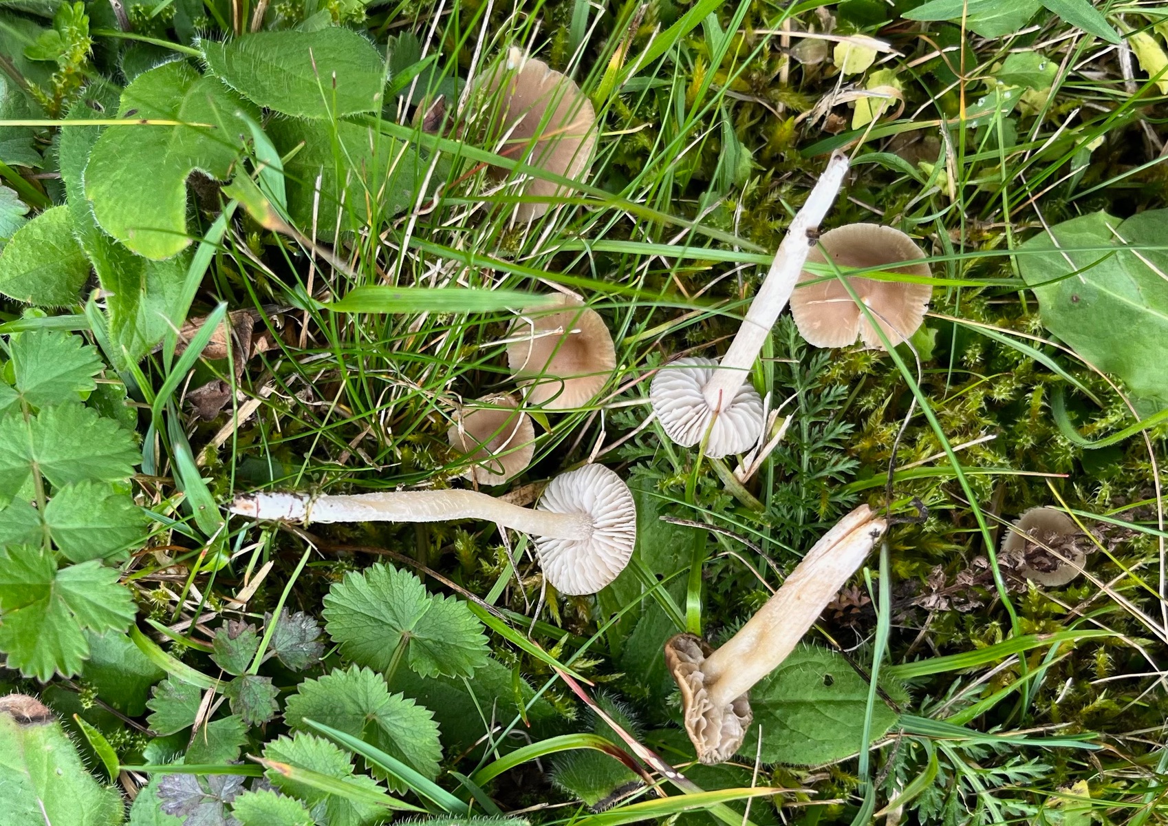 die Wiesenpilze rocken doch noch den Herbst. Zig Saftlingsarten, Keulen, Korallen und alles, was das Herz begehrt. Als Beifang fand ich diese kleinen unscheinbaren Pilze. Sogleich hatte ich die Hoffnung, endlich auch einmal Dermolomas gefunden zu haben. Aber es sieht eher nicht danach aus. Jetzt bin ich einigermaßen ratlos, wo ich nach den kleinen Pilzen mit 1,5-2 cm Hutdurchmesser, dicken gesägten Lamellen ein bisschen nach Mehl riechend und die auf einer sauren Magerwiese standen, suchen soll. Habt Ihr einen Tipp für mich?