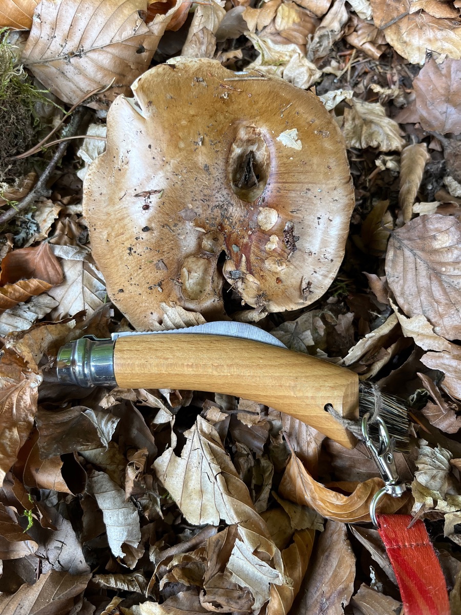 Das Schnittbild und die Seitenansicht des großen Pilzes kann ich nachreichen, wenn die Informationen und Fotos nicht ausreichen. Die Fotos sind unscharf geworden, aber der Pilz liegt noch vor Ort. Ich könnte einen zweiten Versuch unternehmen.