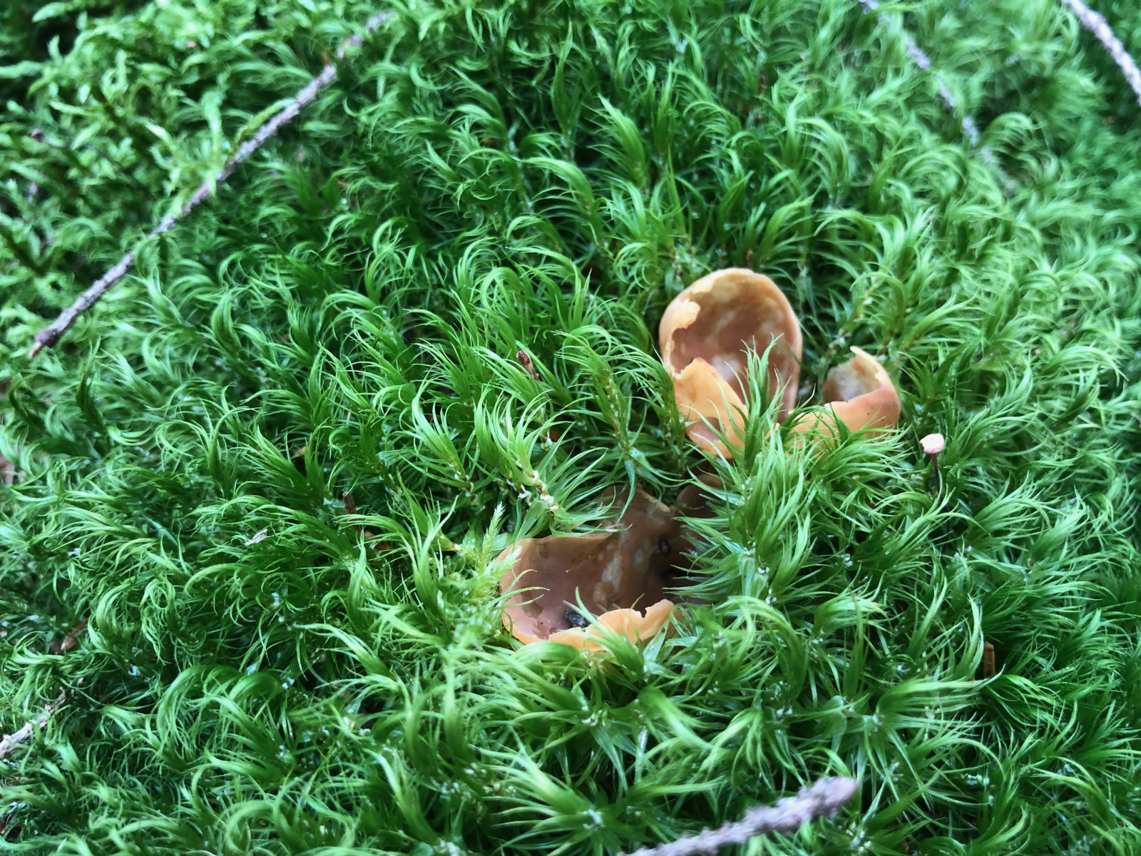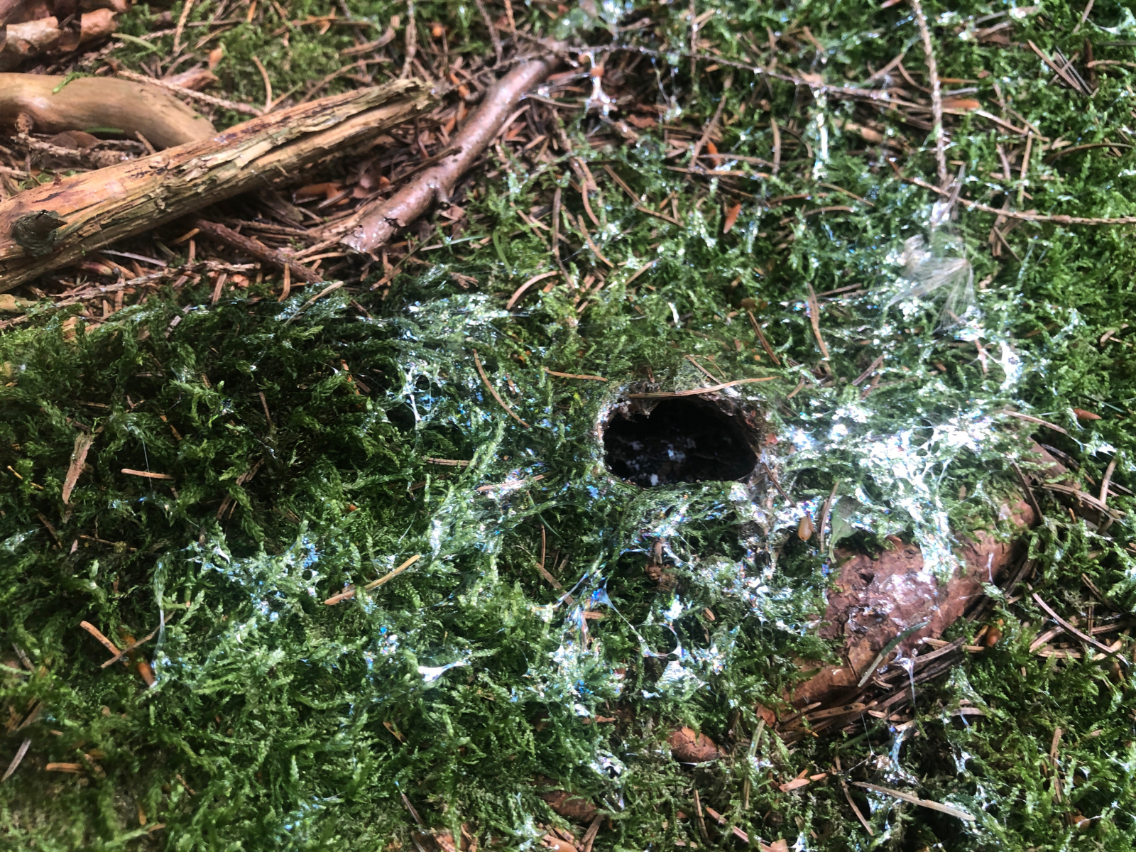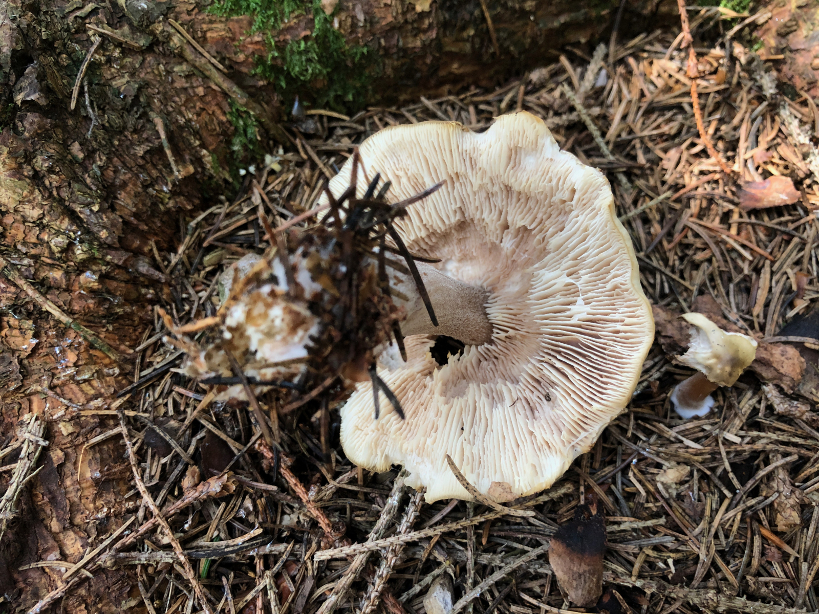 Hier ein typisches Pilzloch. Hier sollte eigentlich ein Steinpilz stehen. Offenbar sind die bei den Schleimern noch beliebter als die Täublinge. Zu 80% waren die schneller als ich. Aber für eine Mahlzeit hat es trotzdem gereicht.