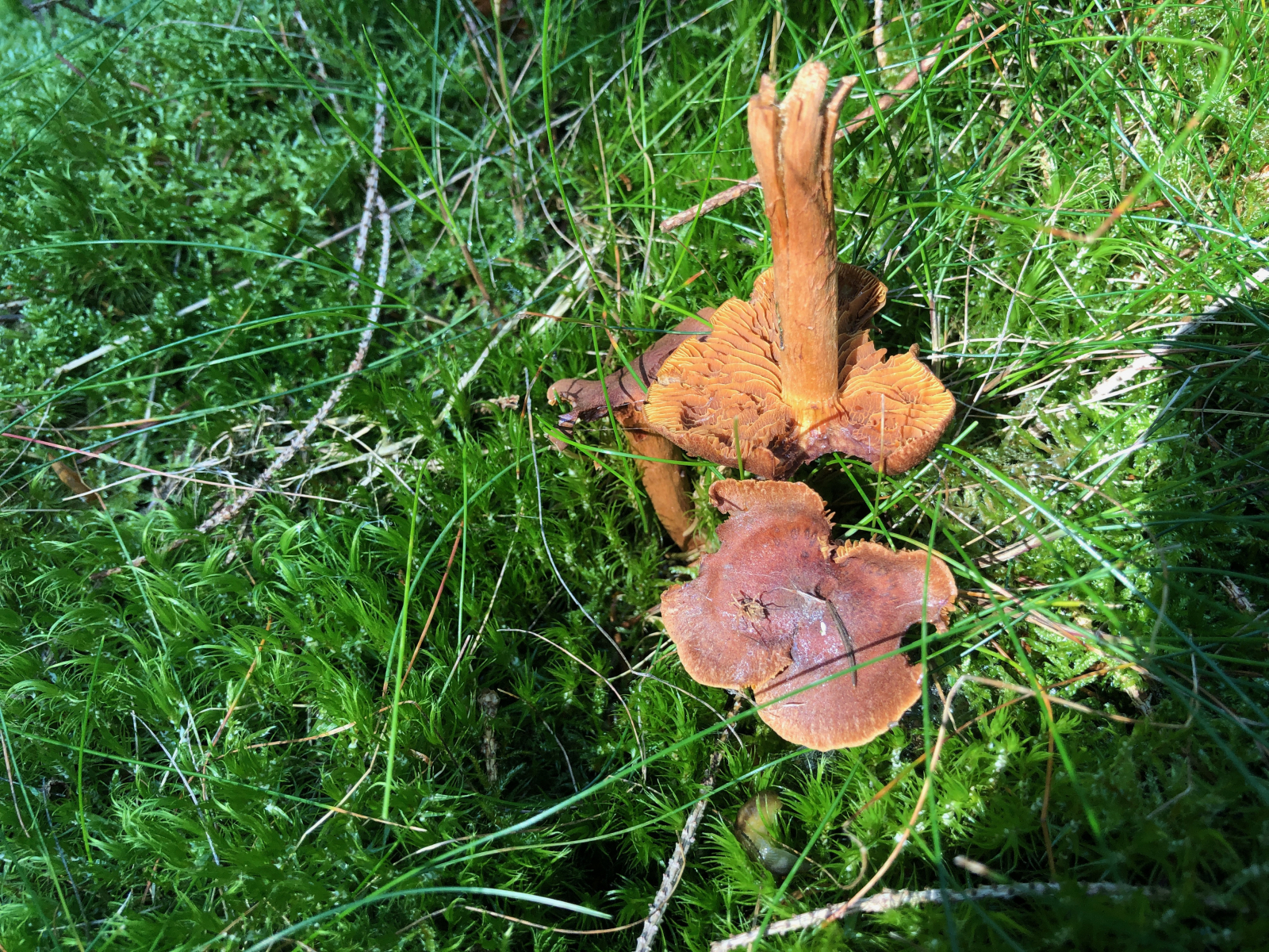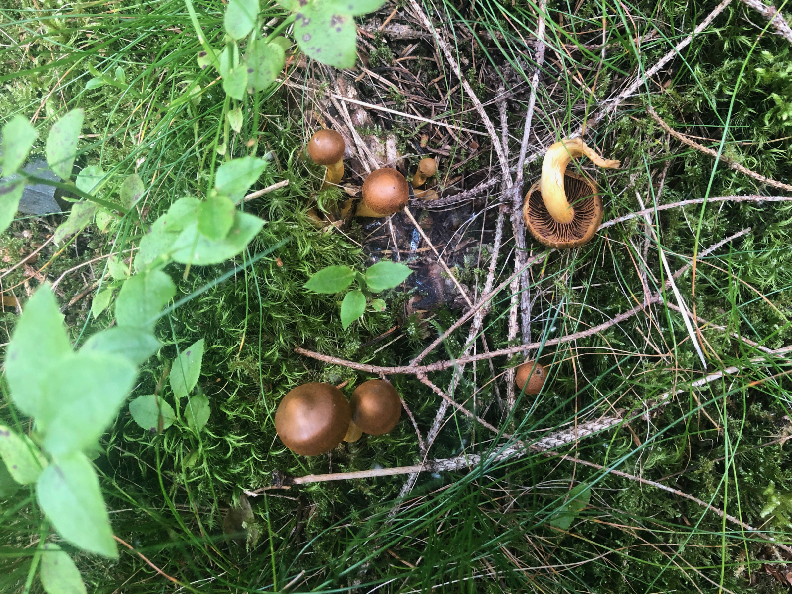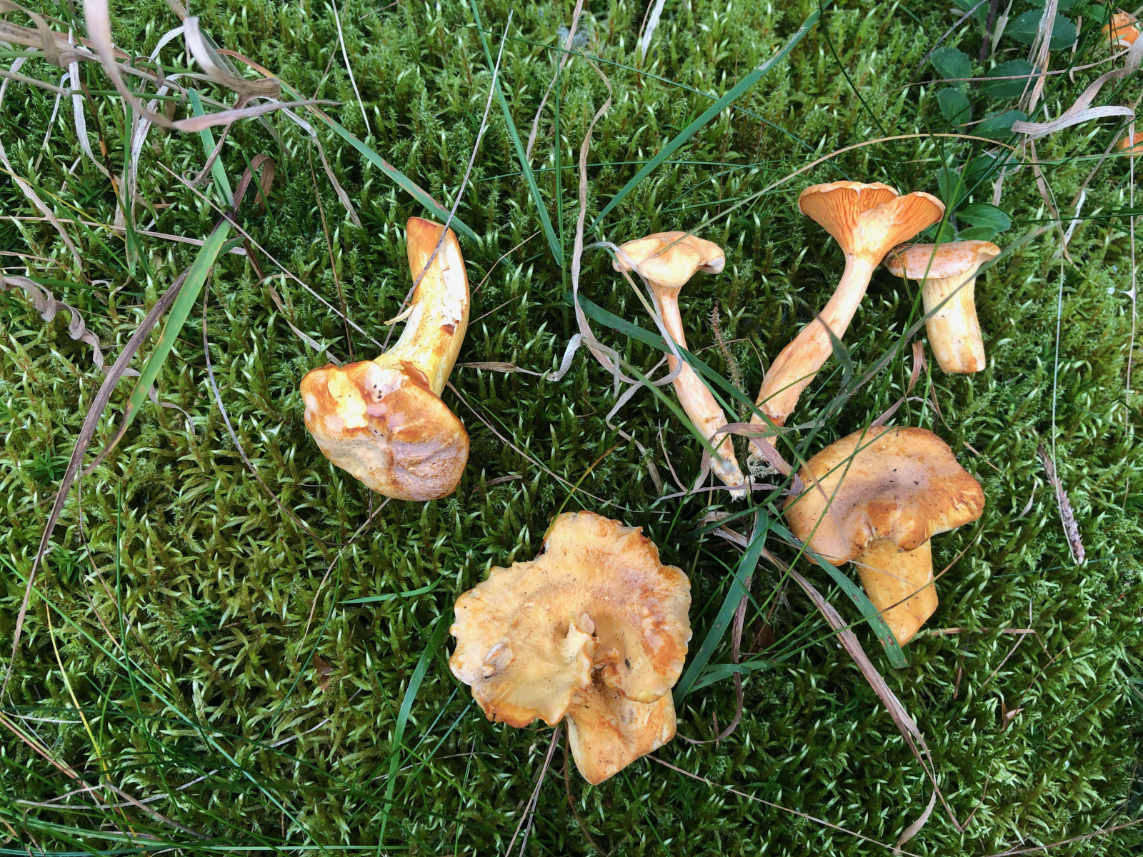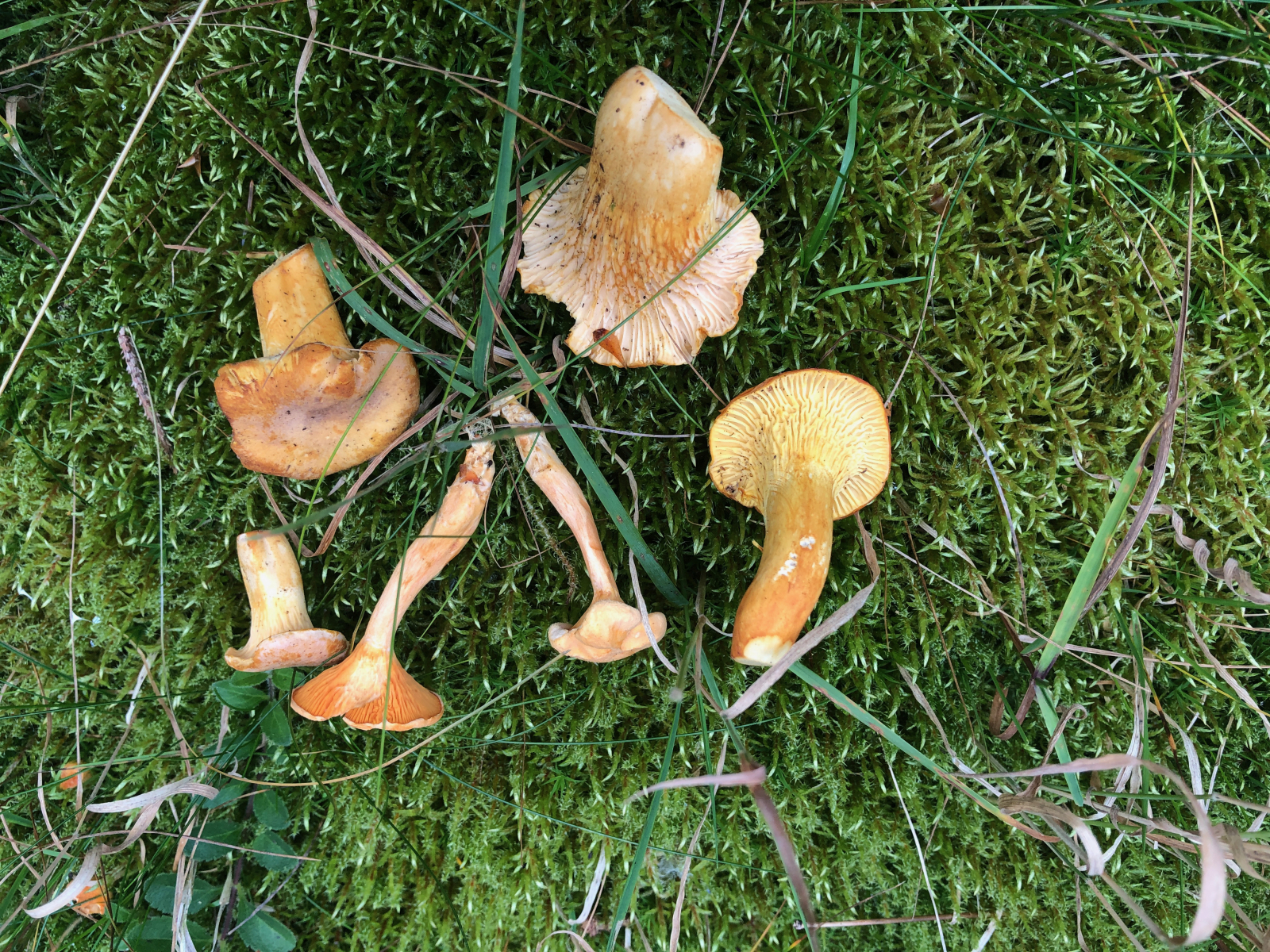 Hier habe ich einmal Pfifferlinge und einen Falschen nebeneinander fotografiert. Die bräunen alle, aber interessant finde ich den Grünstich bei dem Pilz rechts unten.