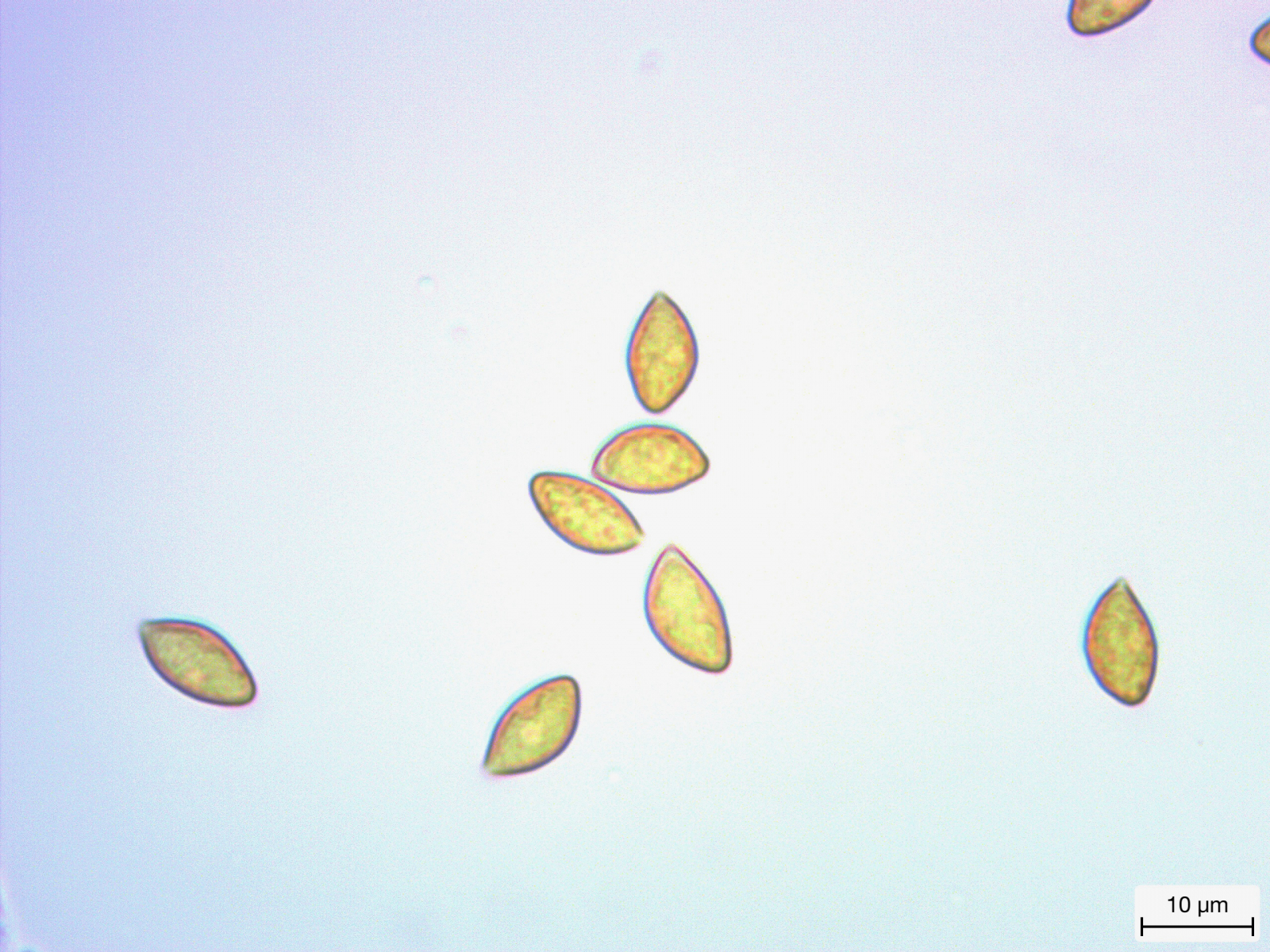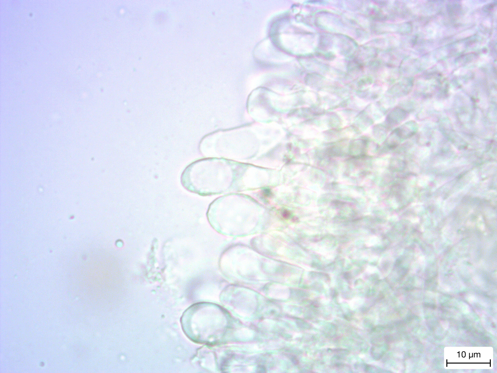 Ist vielleicht ein Schirmling oder eine Cystoderma, wenn es diese mit so hellem Stiel gibt. Vielleicht der Amianth-Körnchenschirmling, allerdings fiel mir der sonst auffällige Geruch nicht auf, was doch wieder dagegen spricht. Die Pilze waren noch sehr jung. Sporen waren noch nicht ausgebildet. Auffällig waren die dicken Cheilozystiden. Vielleicht passt ja ein anderer Name besser. Oder ich muss warten, bis es ein größeres Exemplar gibt.