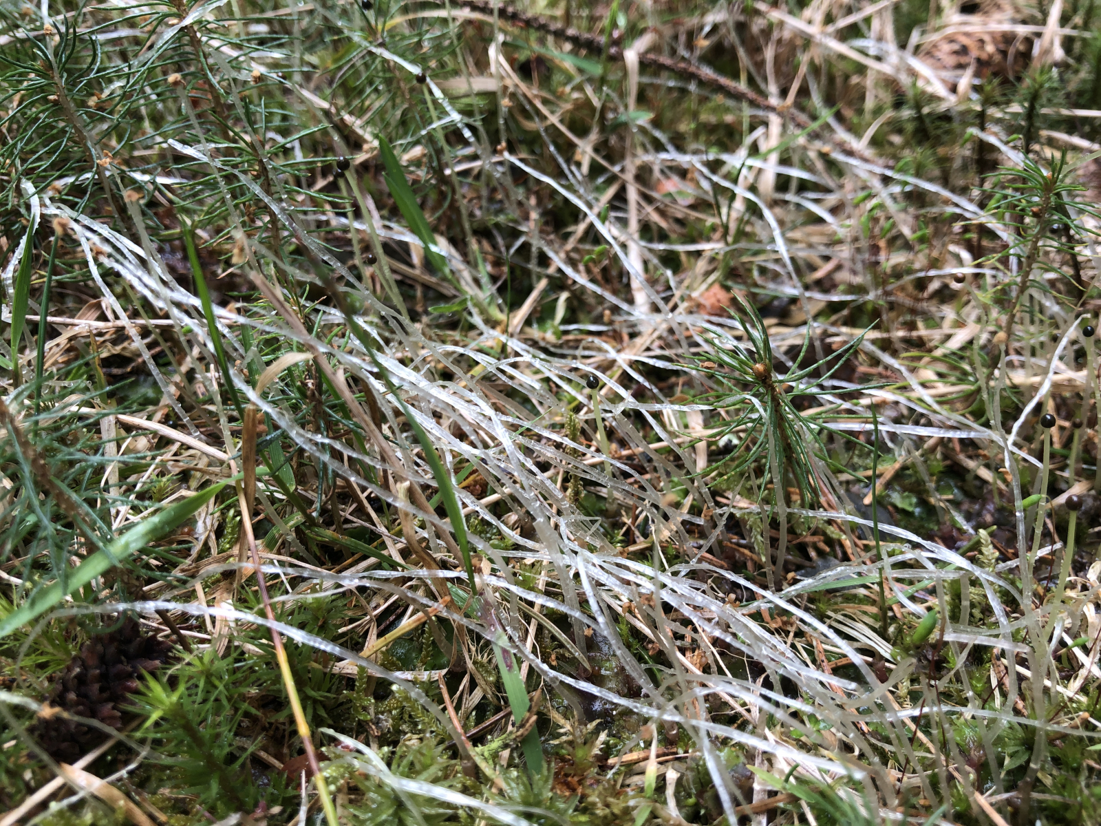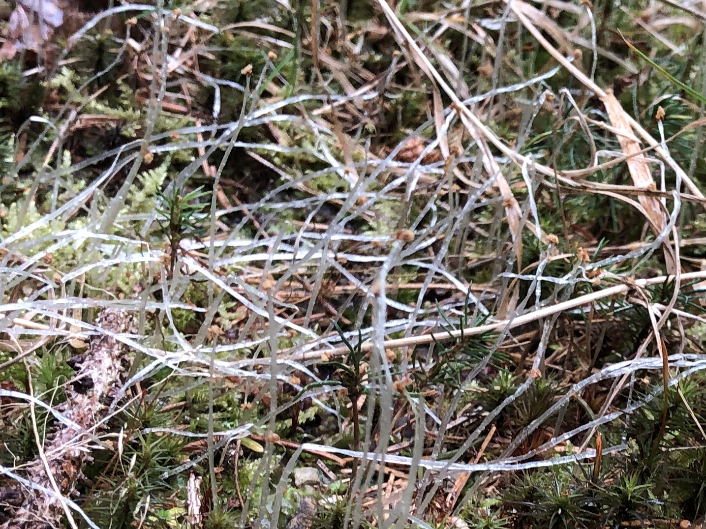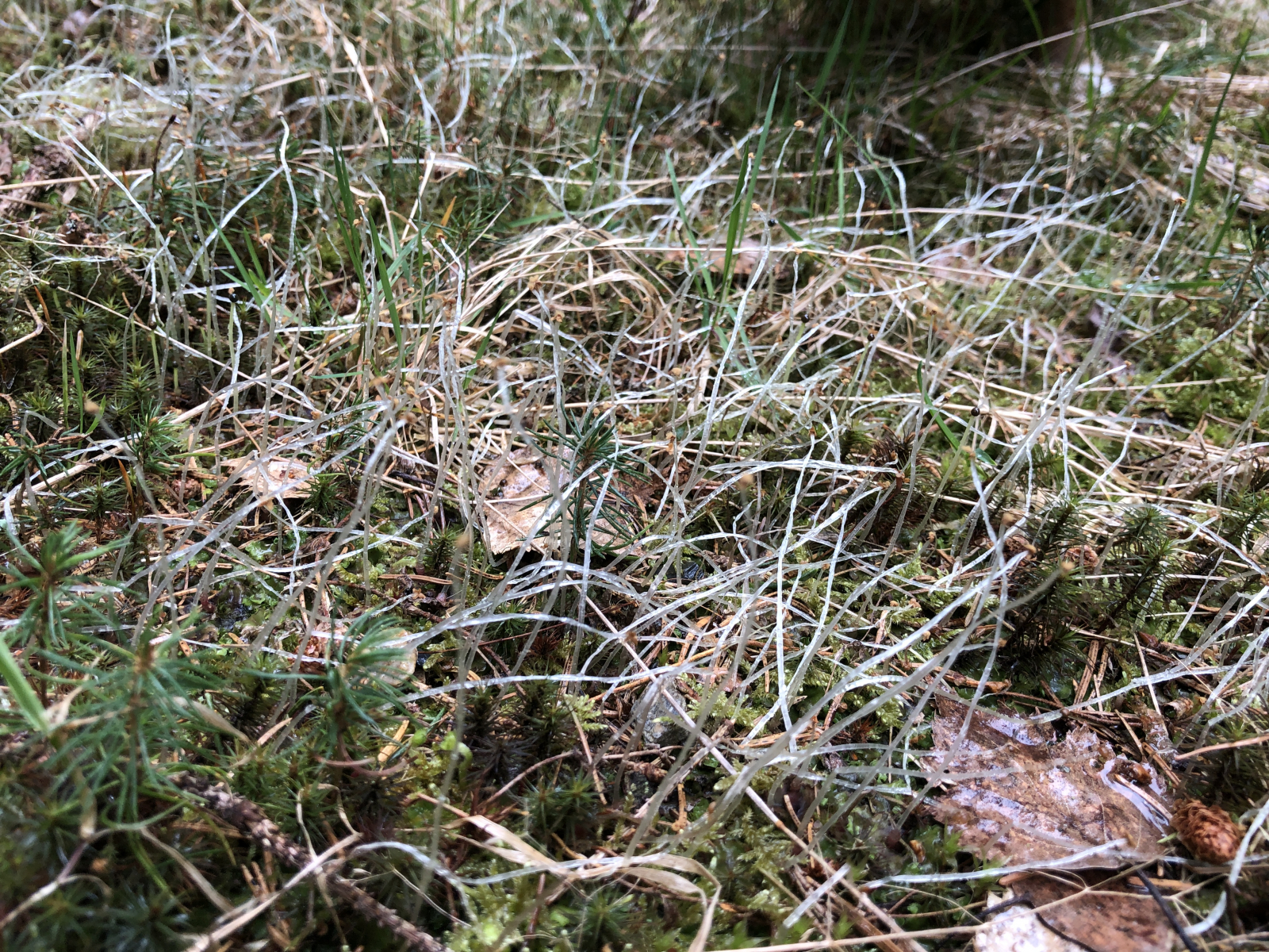 Zunächst hatte ich irgendetwas Mucor-ähnliches vermutet, aber da passt das Köpfchen nicht. Der Standort war ein Waldweg, ohne Fund. Also Kackpilze sind bei einer flächenhaften Verbreitung unwahrscheinlich.