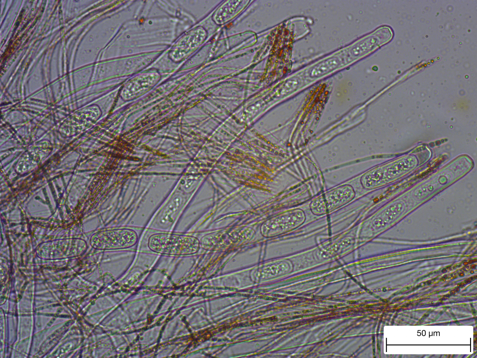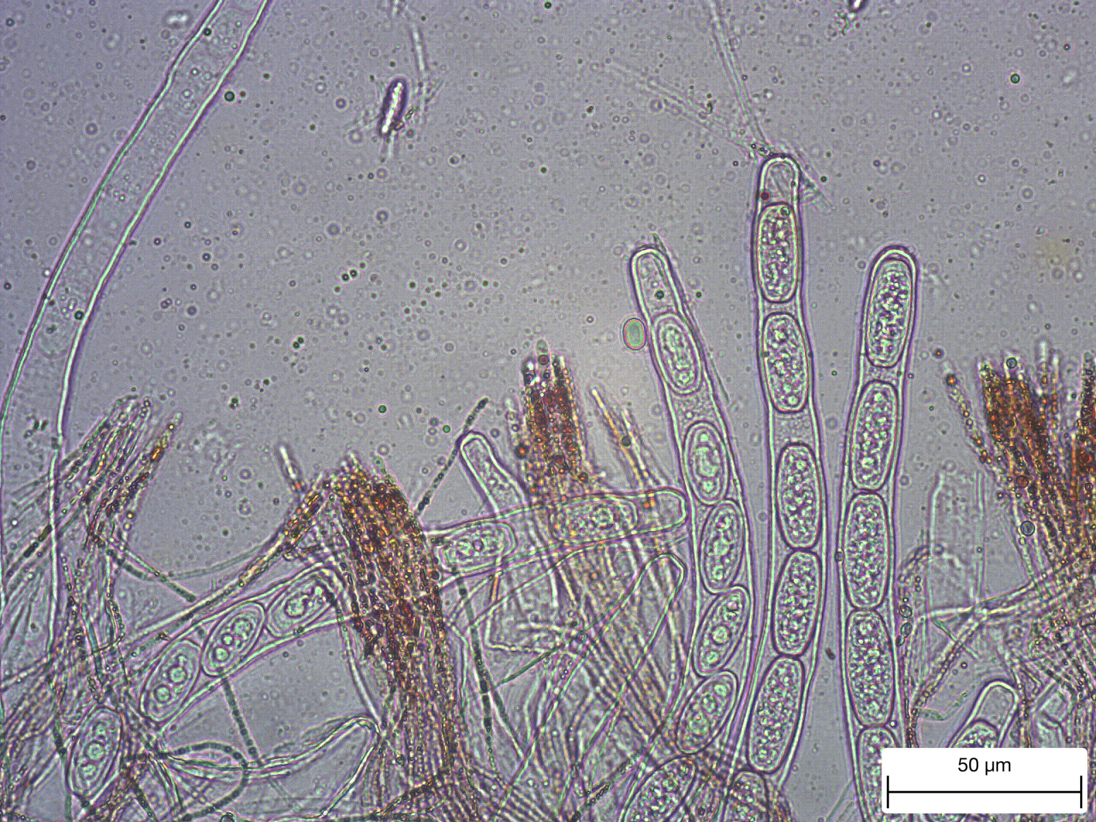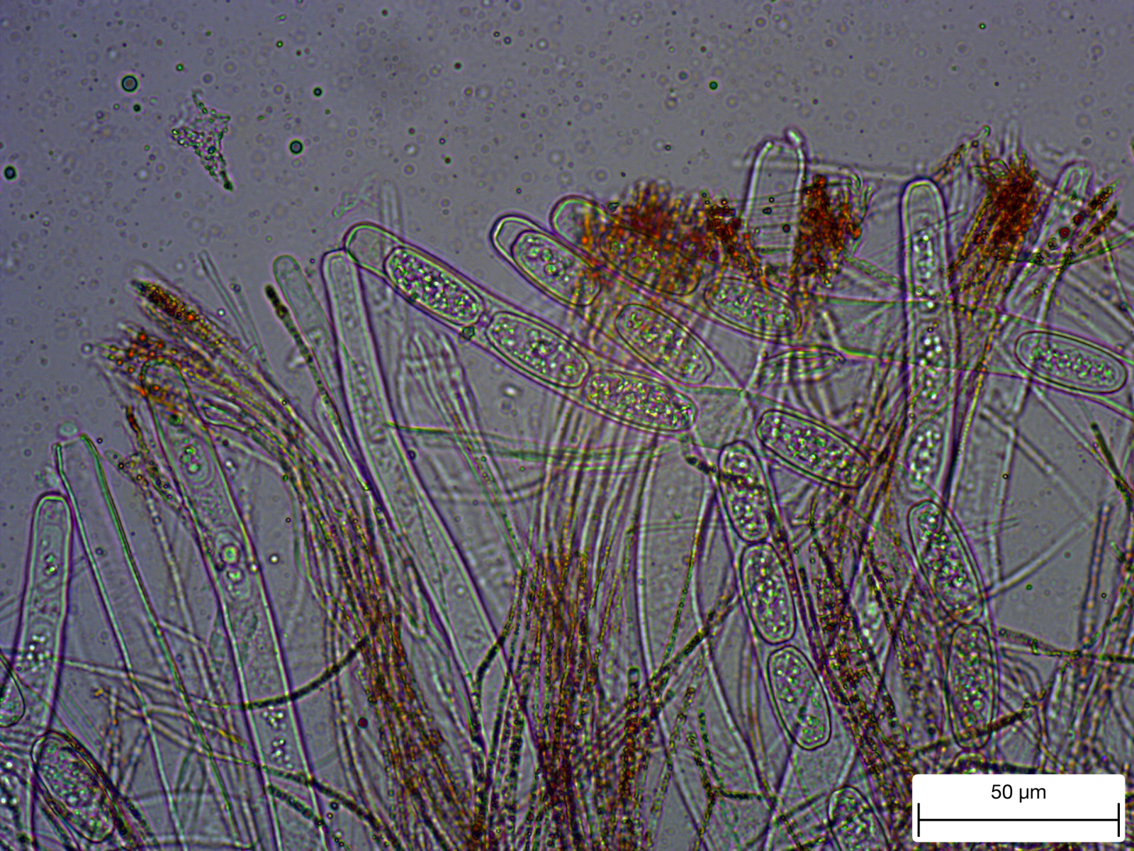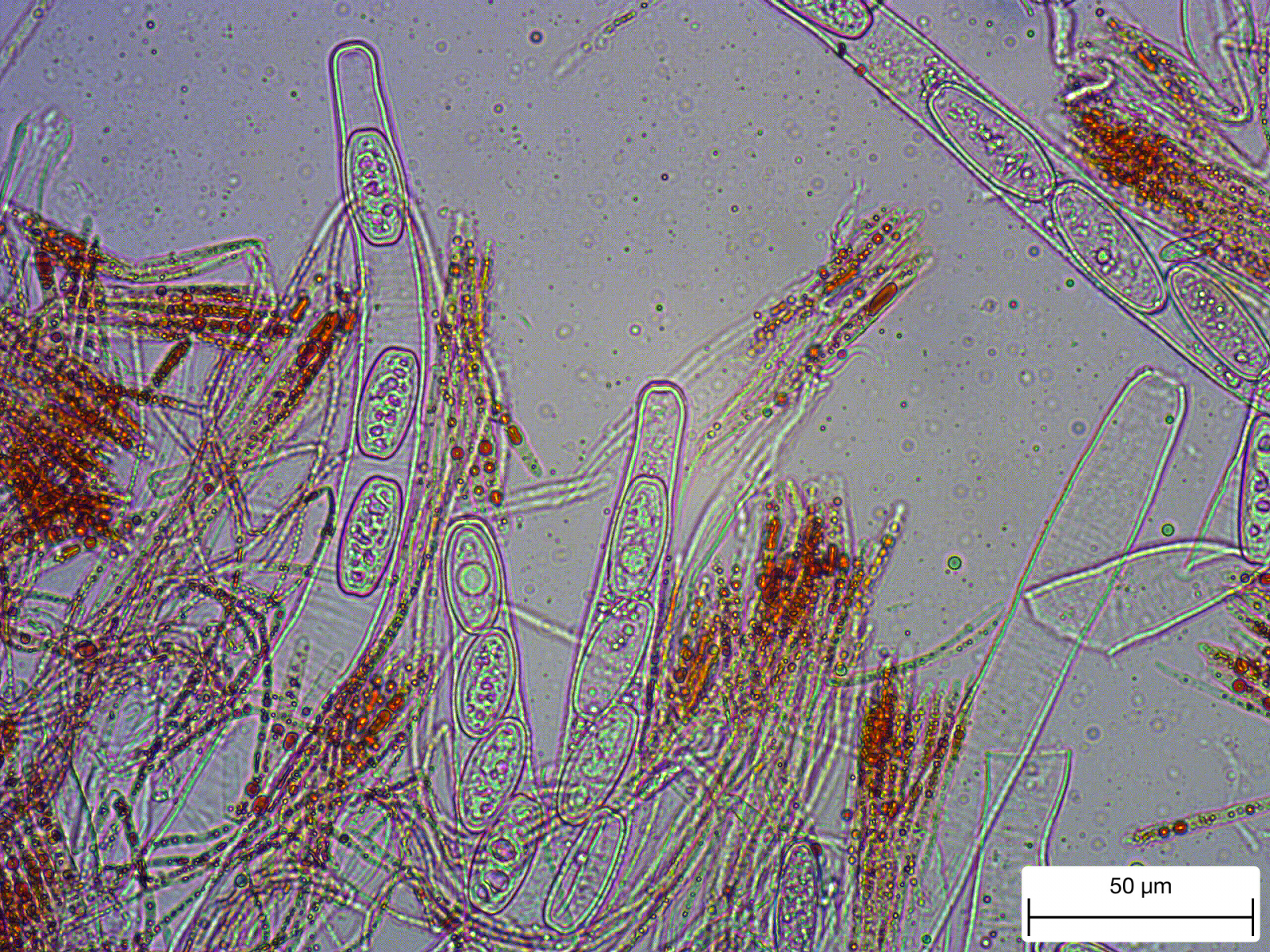 ich sehe hier auch S. austriaca. Was die Verdickung der Paraphysen betrifft, findet man die nur im unteren Bereich der Paraphysen. Da hat man dann natürlich immer mit dem Problem zu kämpfen, daß sich alles etwas knubbelt und man die Dinge nur schwer freigestellt bekommt.