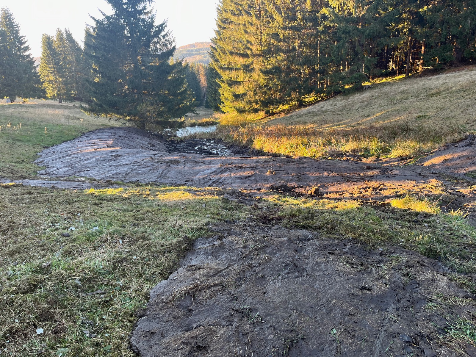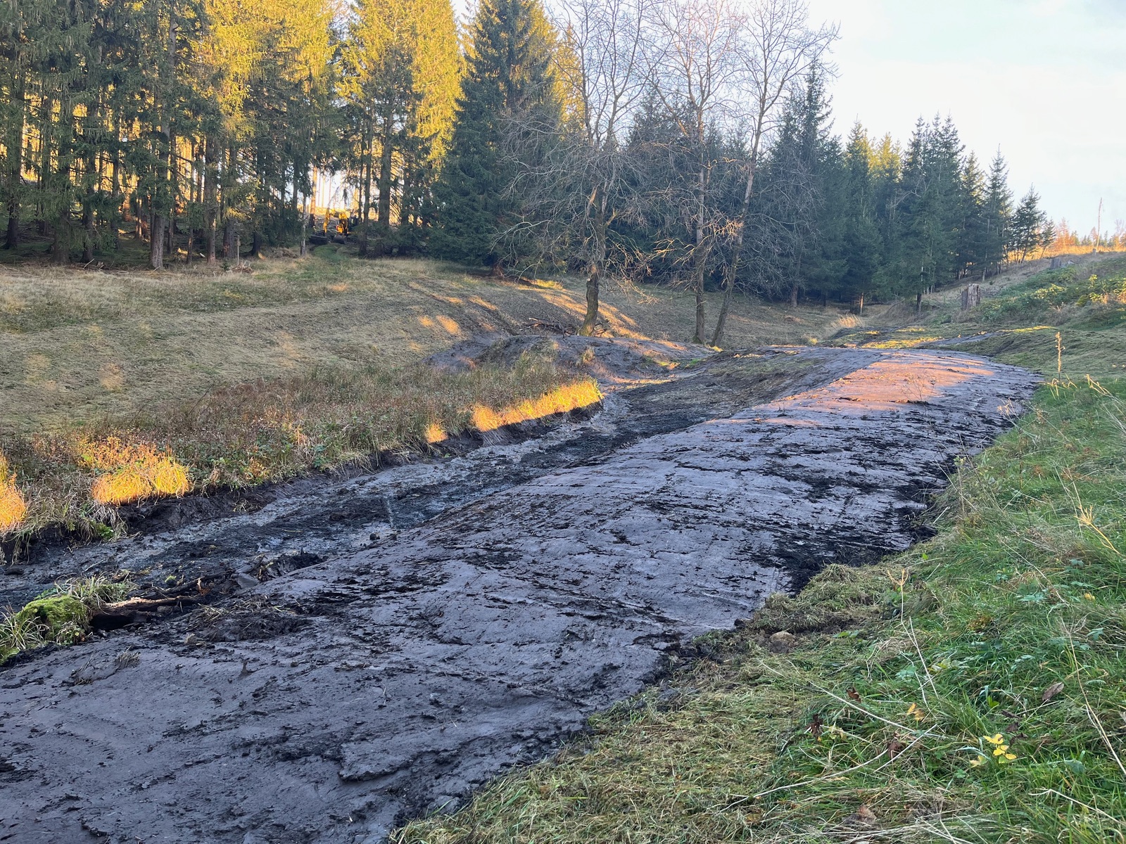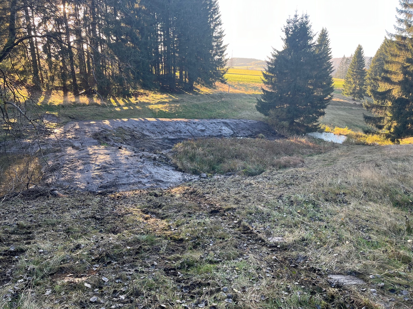Die Biotopzerstörer haben noch eins draufgesetzt. Jenseits des Schlamms wurde die Wiese beiderseits frisch gemulcht.