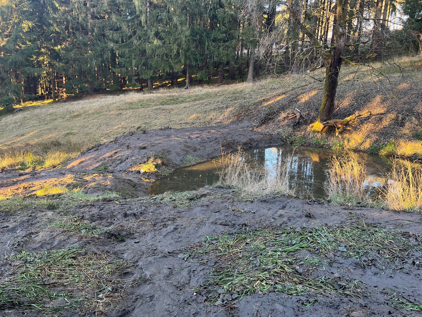 Irgendjemand hat sich wohl daran gestört, dass der kleine Teich verlandet war und ihn mit schwerer Technik ausgebaggert.