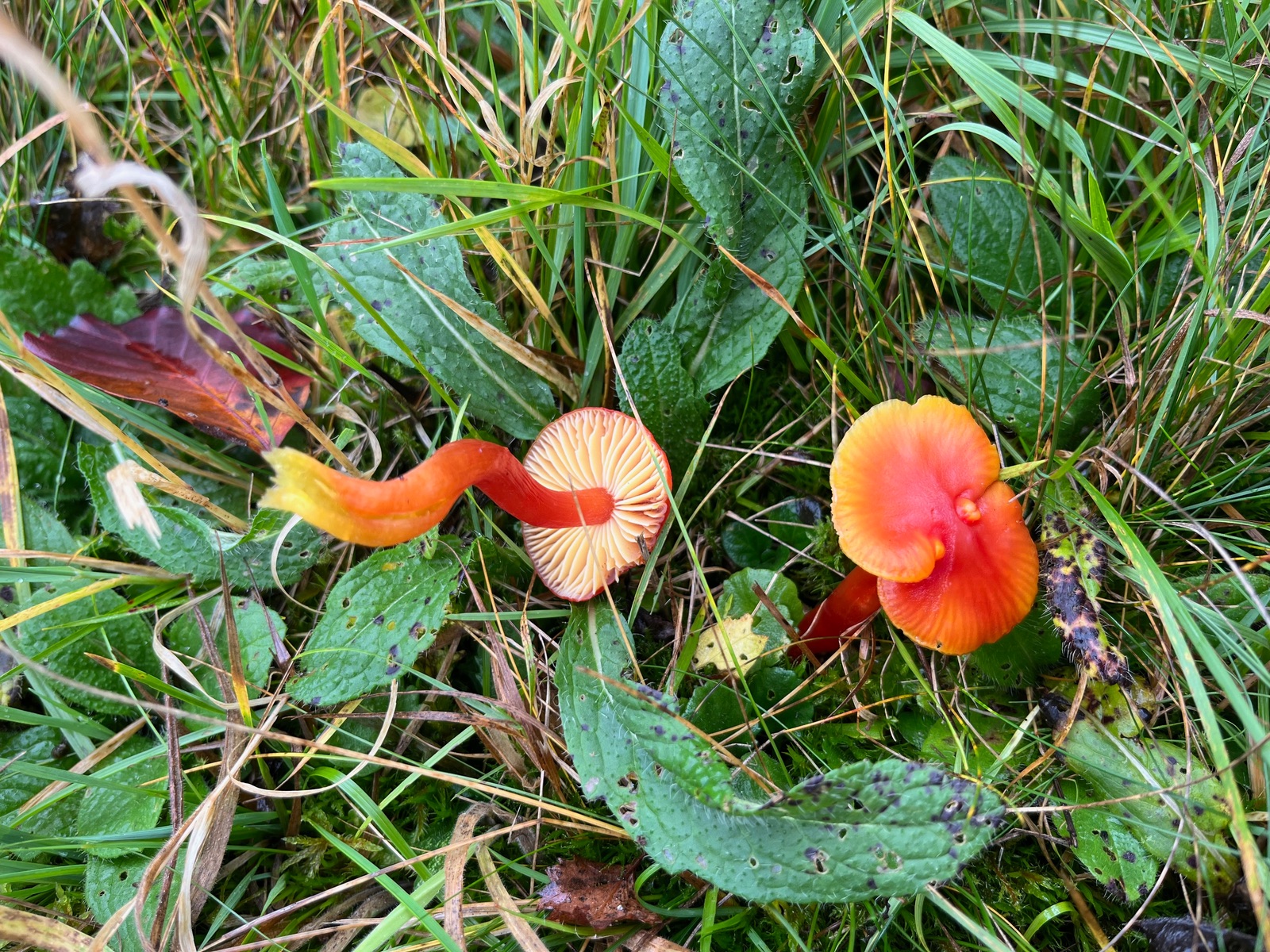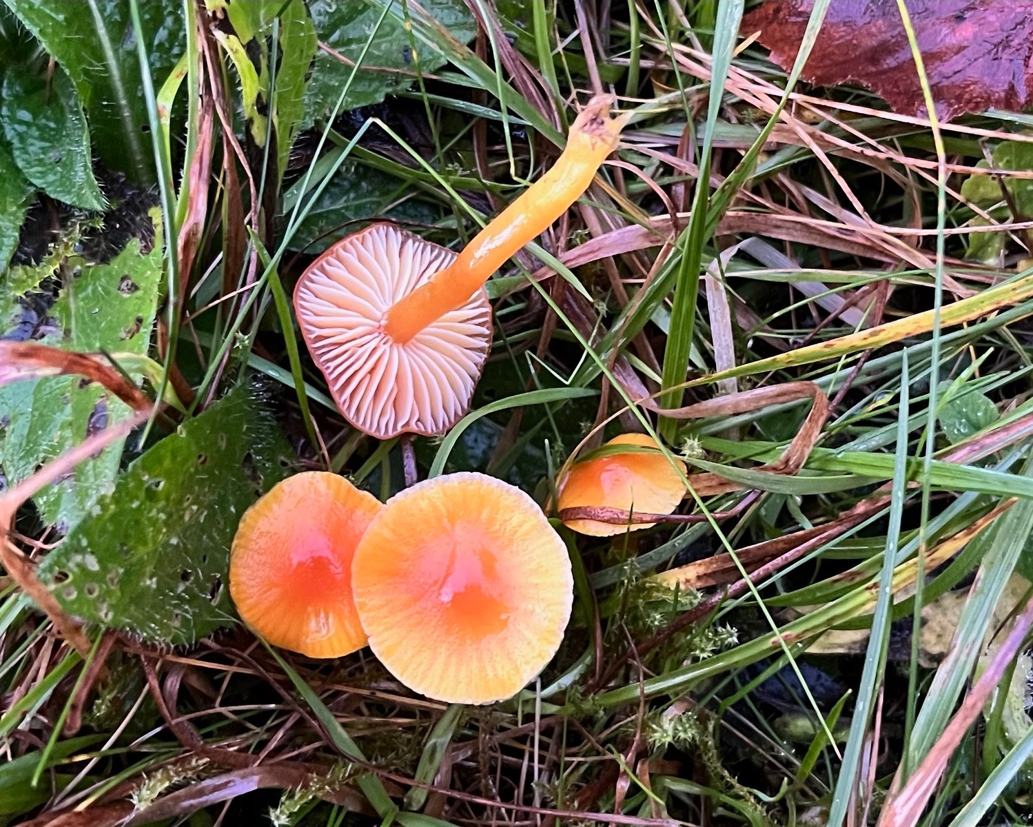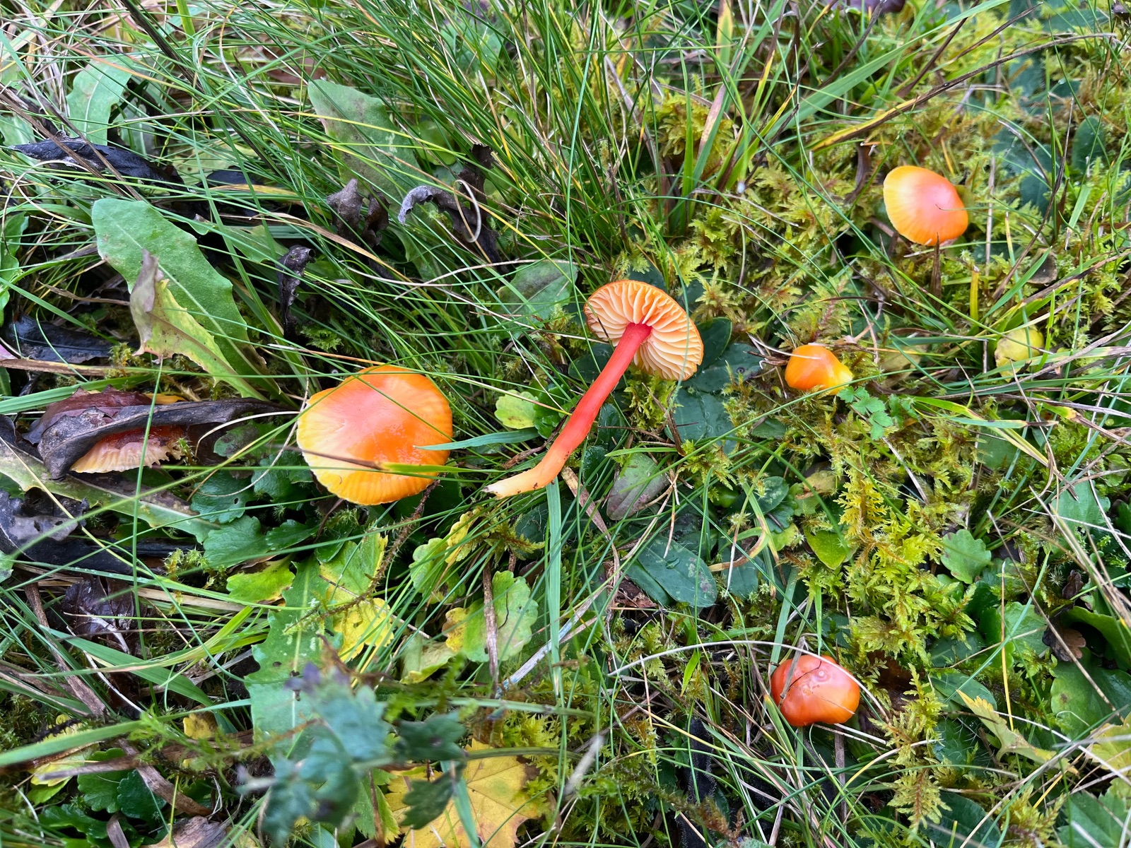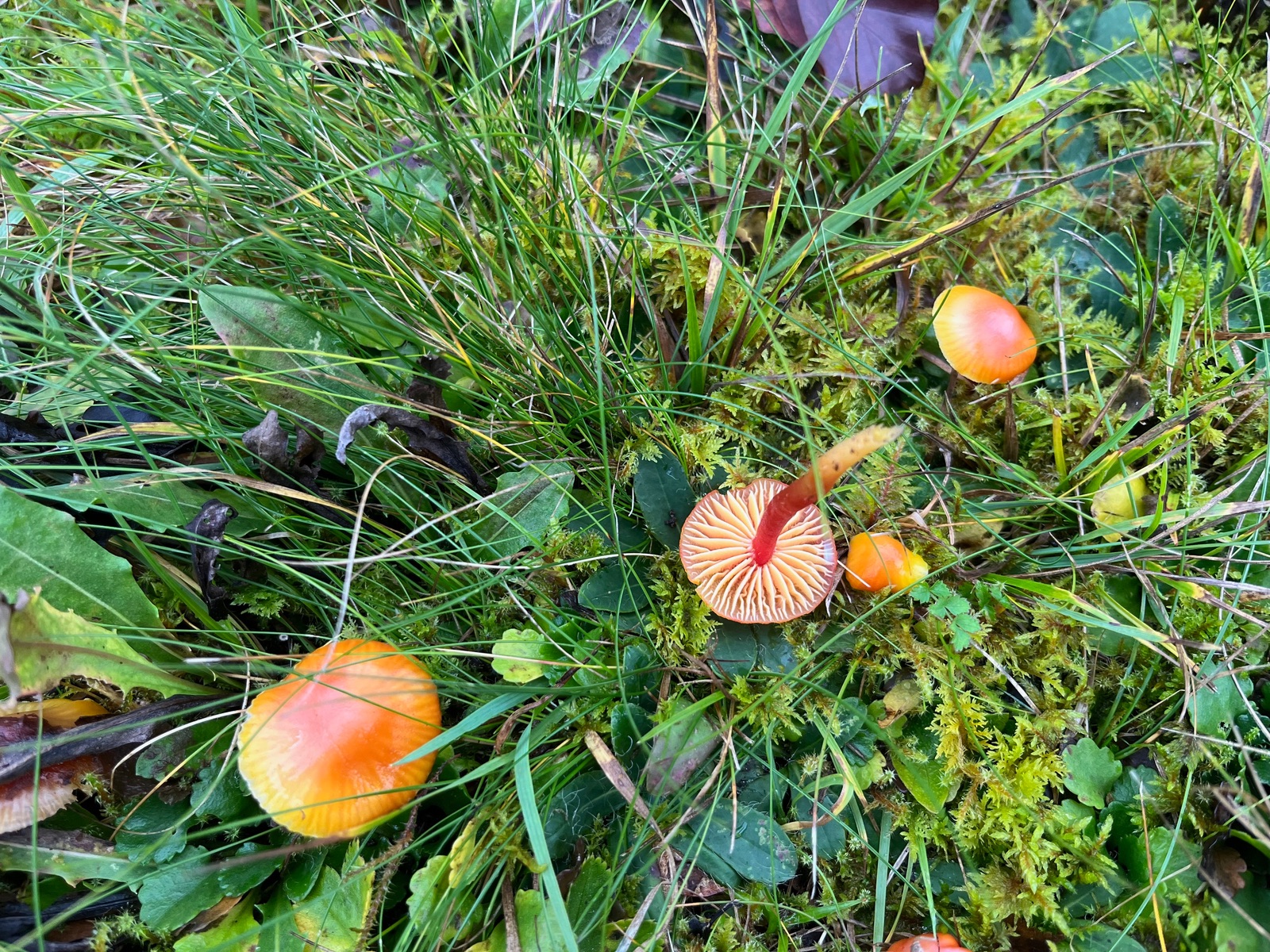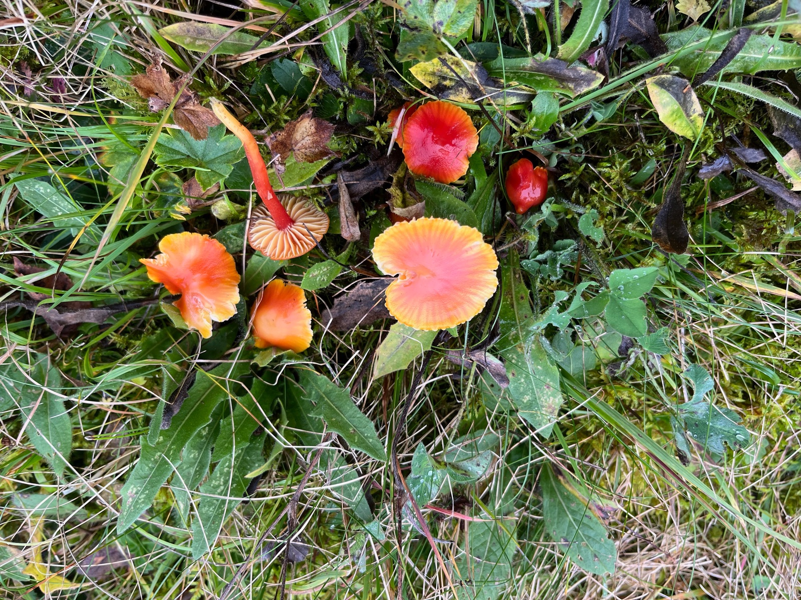 Aber von vorn. Seit einiger Zeit wachsen auf meiner zahlreiche Wunderwiese rot-orange-gelbe Hygrocybe, die ich nicht zuordnen kann. Der sonst hilfreiche Boertmann gibt nichts richtig Passendes her. Der Pilzmhat durch einen früheren Beitrag das Interesse von Wolfgang P. geweckt und heute nun habe ich versucht, den Pilz genauer zu untersuchen.