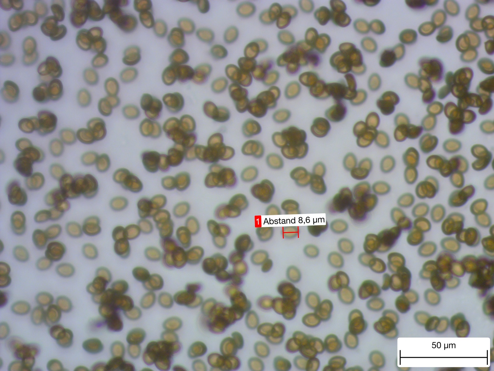 Die Zellen in der Huthaut waren rundlich. Auffällig waren sehr lange, unseptierte, fädige Strukturen in der Huthaut, sie sich teilweise verzweigt haben. Einigermaßen erkennbar sind nur die Bilder vom Sporenabwurf - ohne Deckglas und Flüssigkeit.