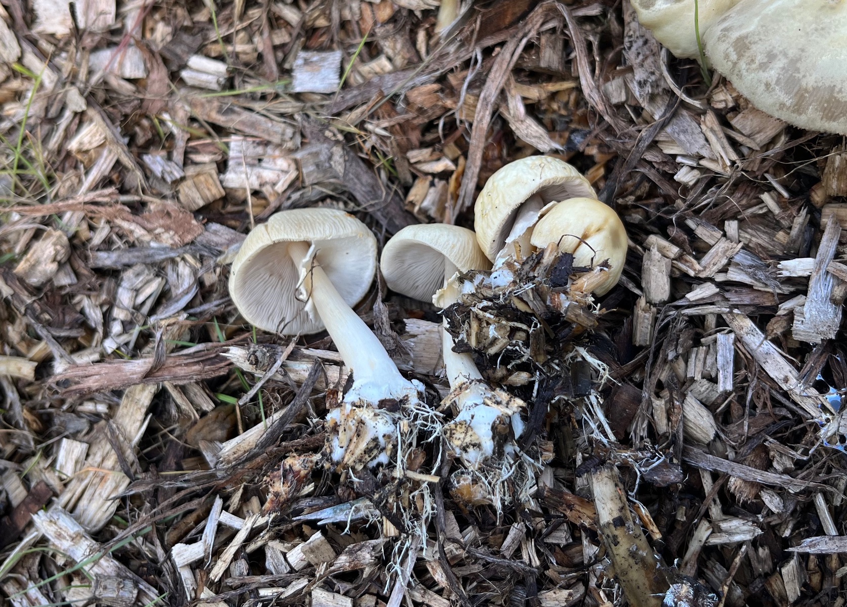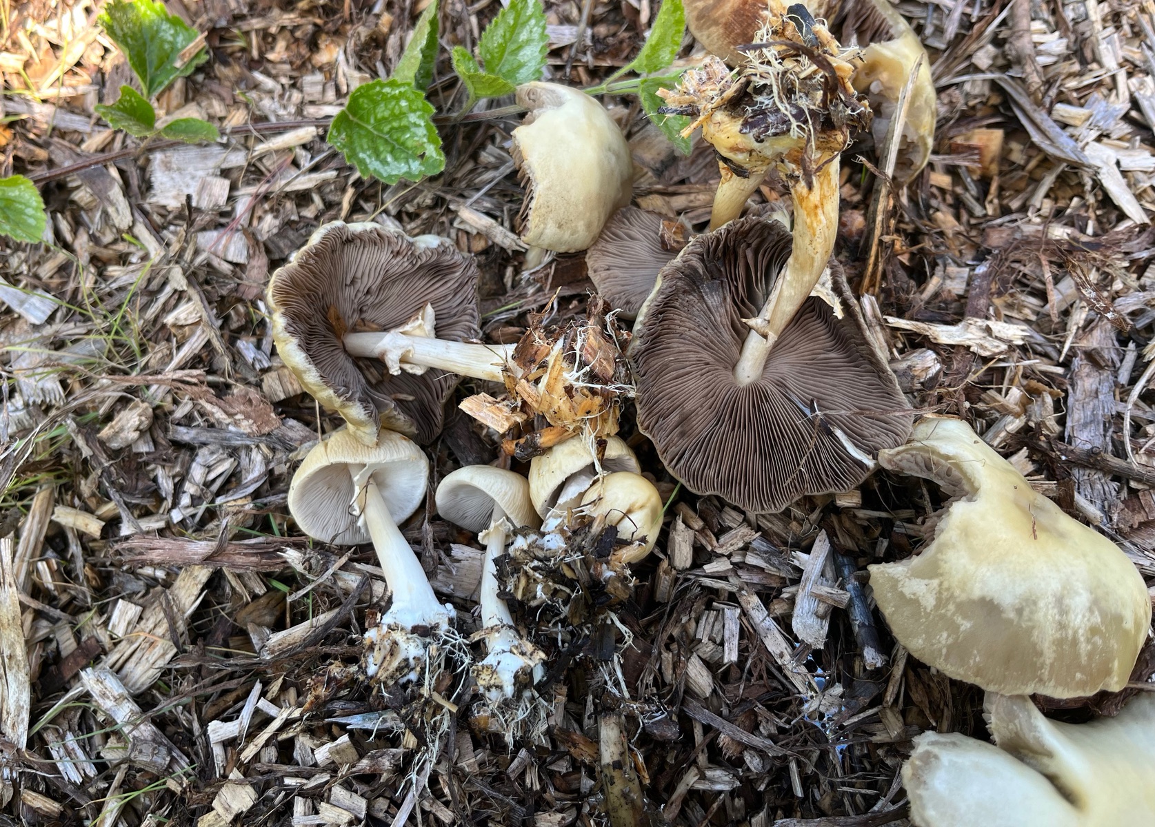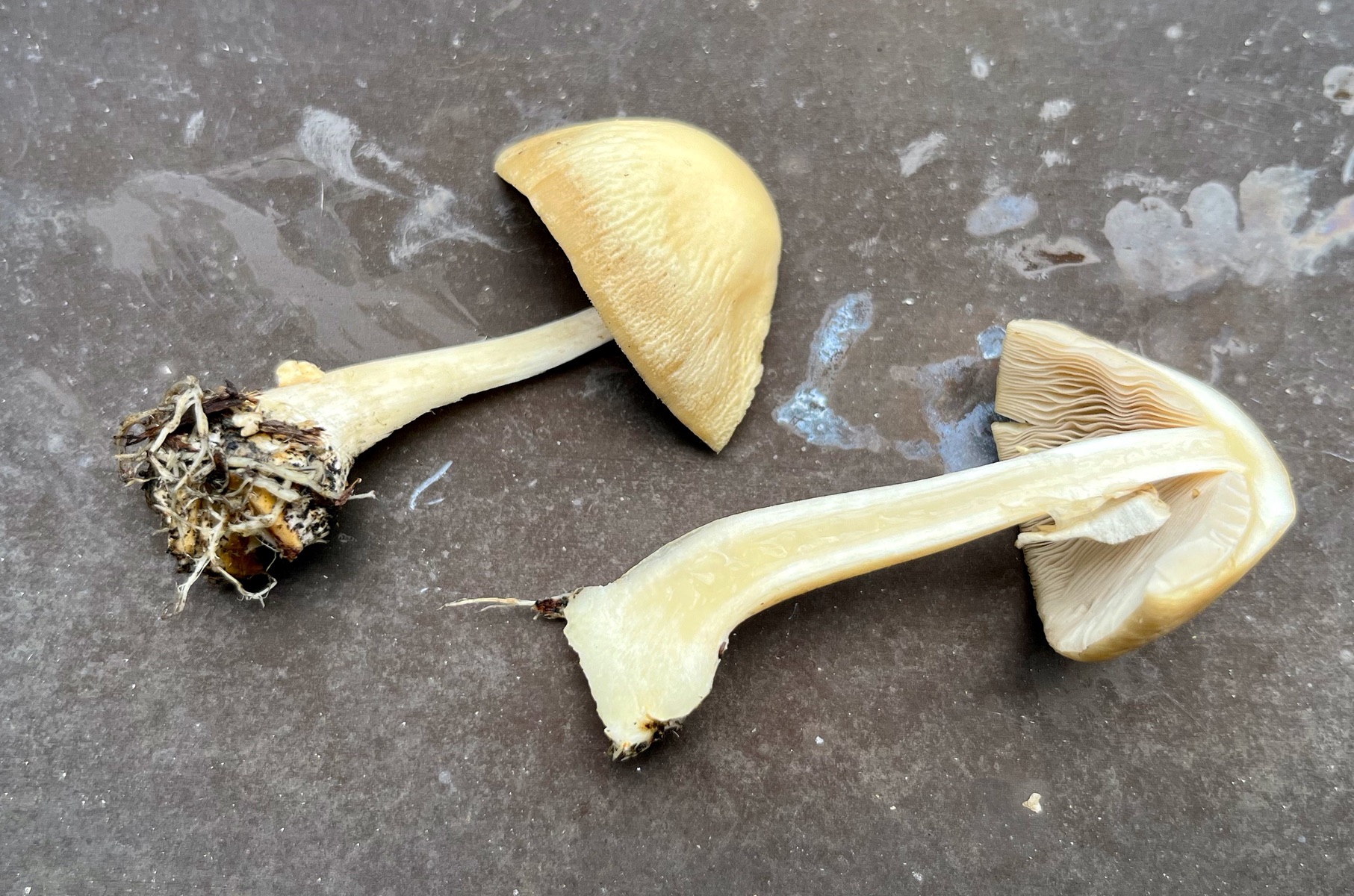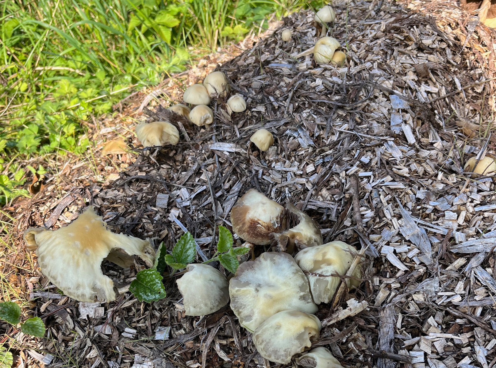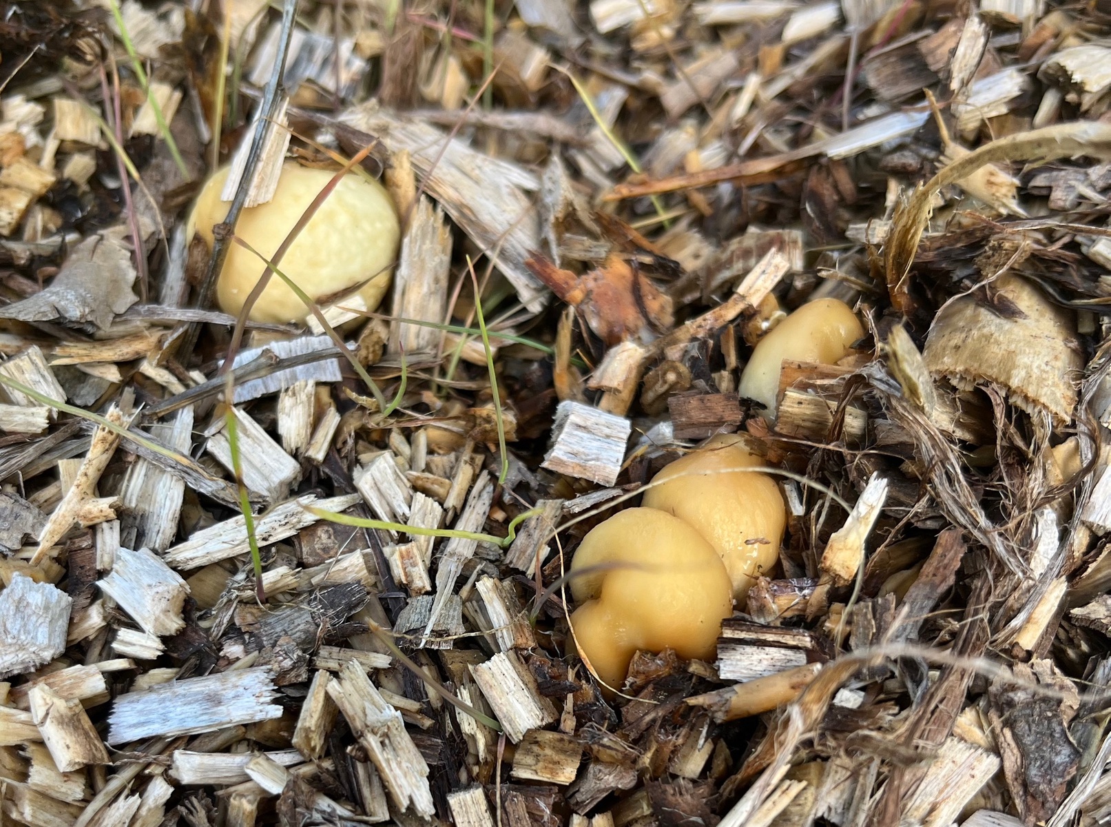 auf einem Häckselhaufen, vermutlich Erle, fand ich eine größere Gruppe gesellig wachsender, auffälliger Mürblinge. Die Hutgröße lag zwischen 2 und 8 cm Durchmesser. Farblich variierten sie zwischen chromgelb und creme. Hut zum Hutrand hin runzelig. Das Fleisch im Stielinneren war hyalin. Großes vergängliches Teilvelum, knollige Stielbasis.