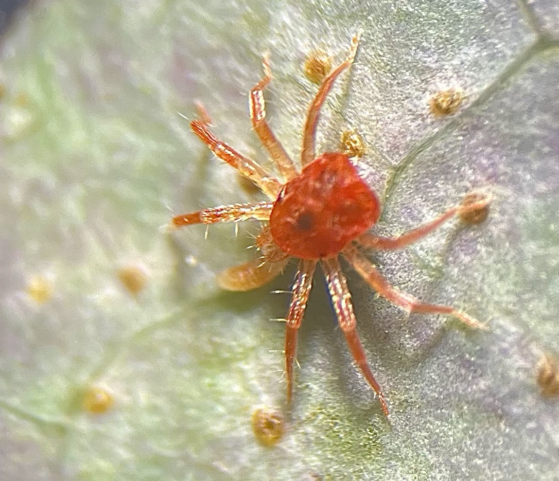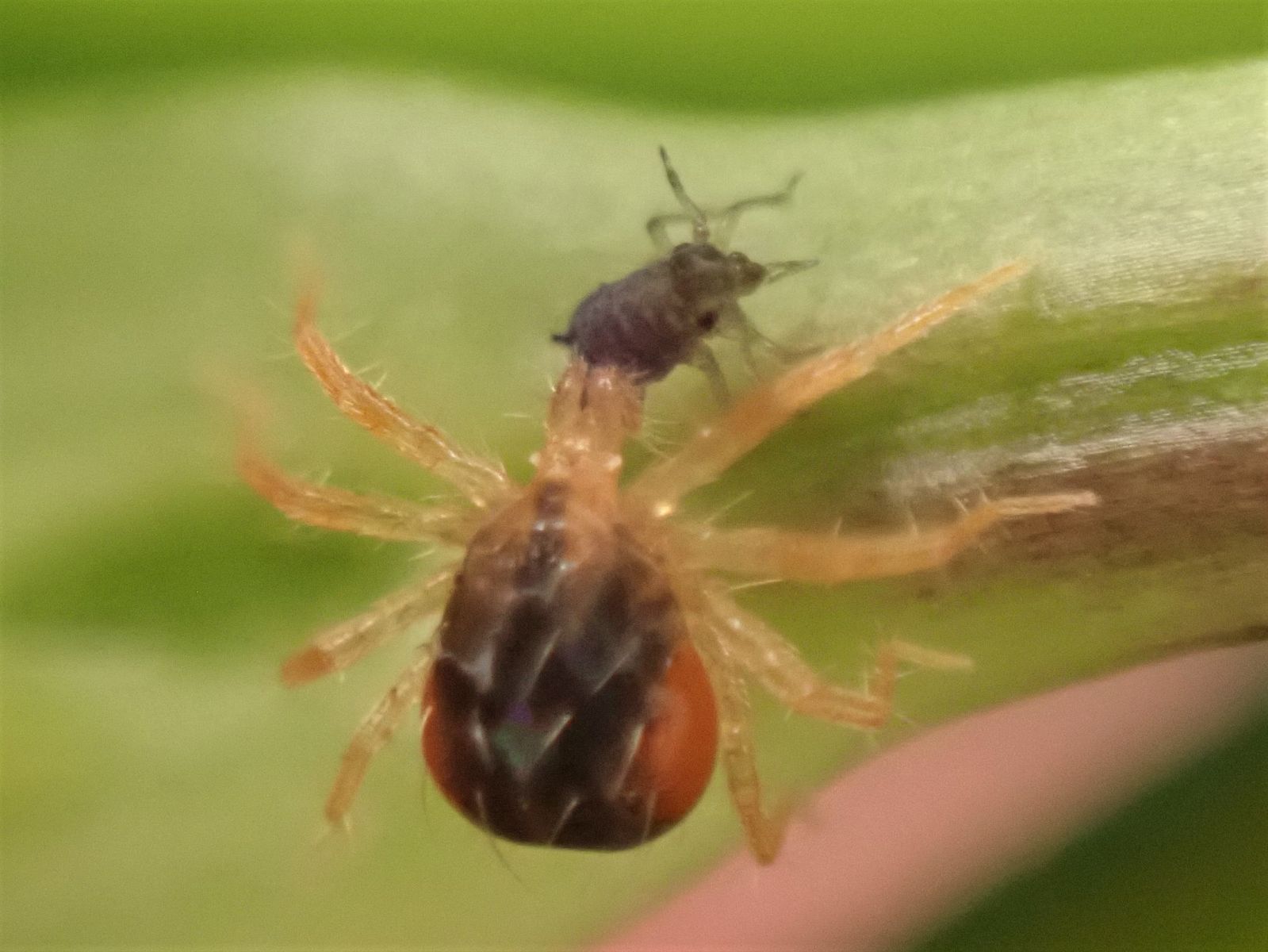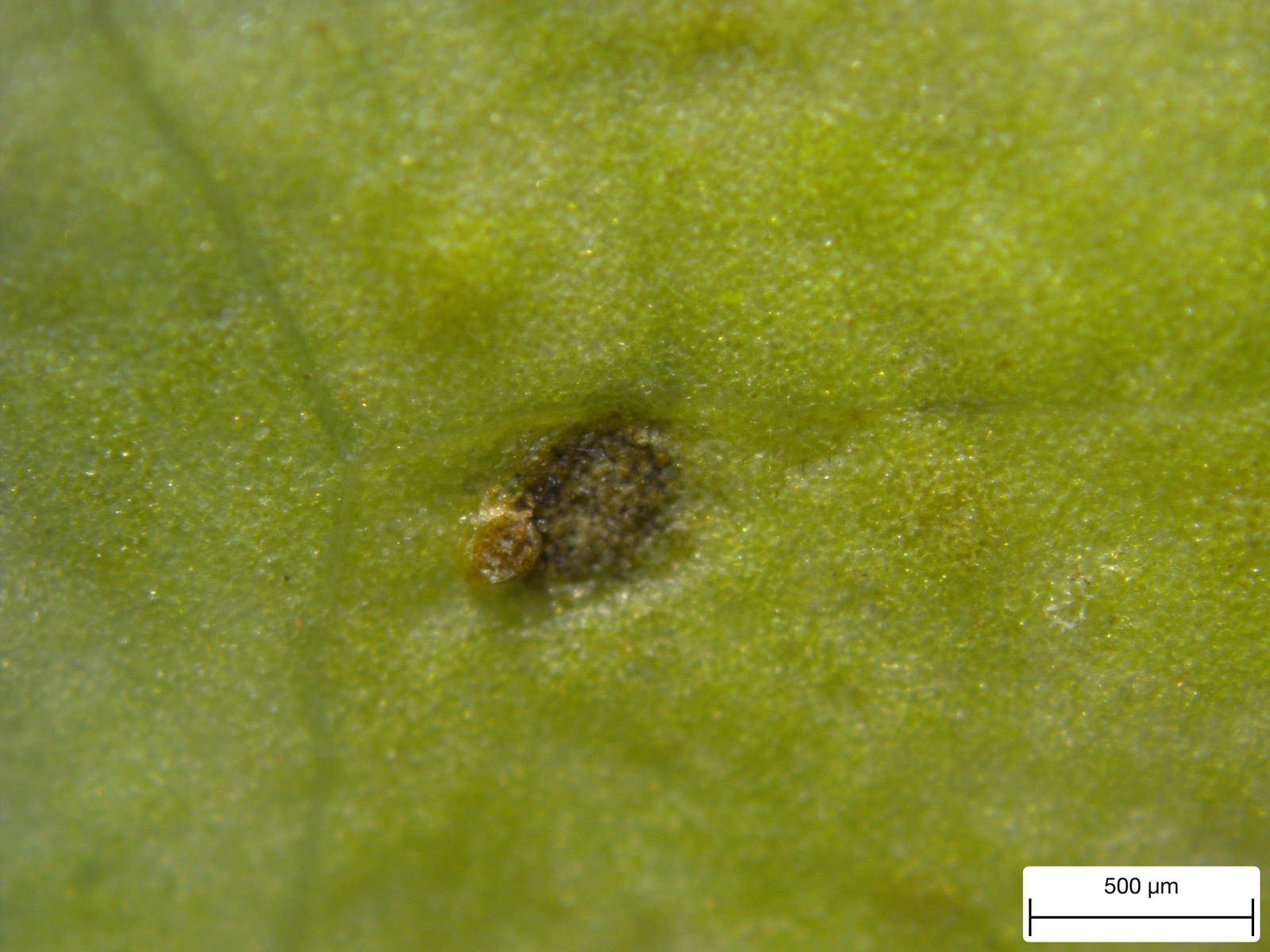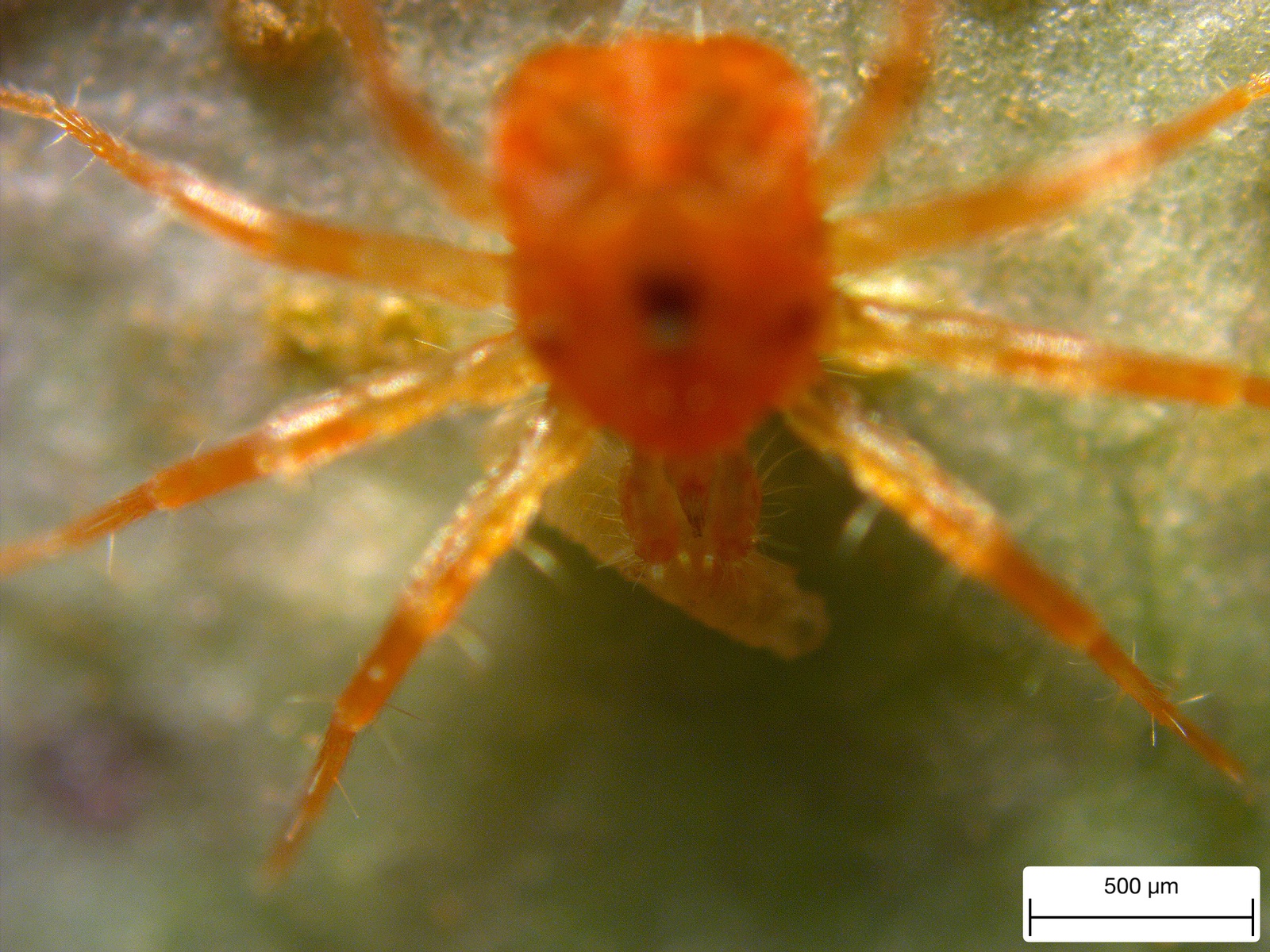 Die bildschirmfüllende rote Monsterspinne ließ sich die Pilzmade schmecken und ließ auch nicht von ihrem Opfer ab, als ich das Rainkohlblatt hoch nahm und unter die Stereolupe legte. Da gelang dann ein Foto von Komplettspinne , ihrem Madenopfer und deren Rostpilzopfern.