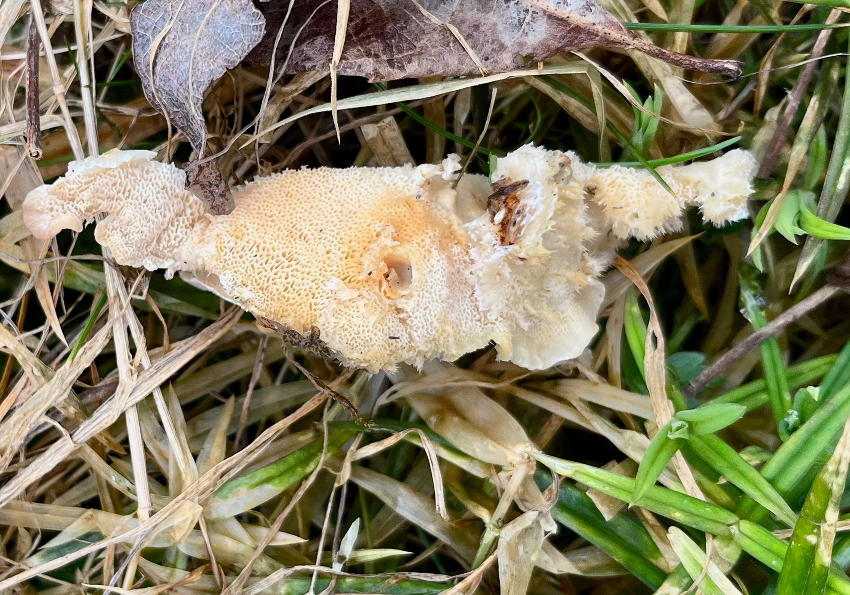 Fleisch ist sehr zäh und gummiartig. Die Unterseite erinnert ein bisschen an eine Mischung aus Hericium und Tramete. Der Rand ist wellig, flatterig. Die Oberseite ist ocker mit schwacher weißlicher Bänderung und mit sehr unebener bis buckeliger Huthaut.