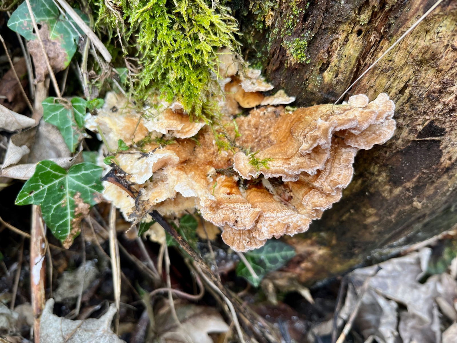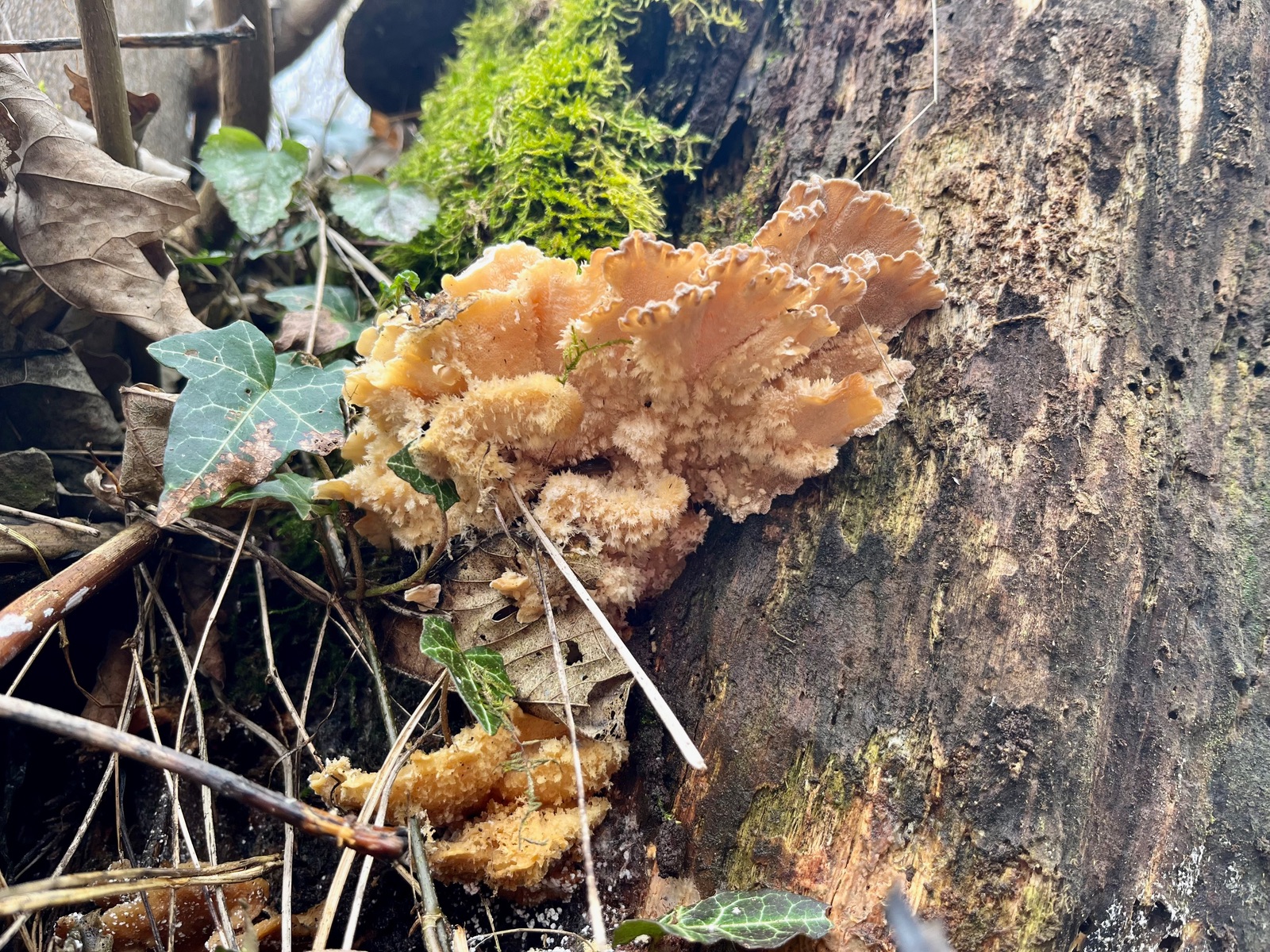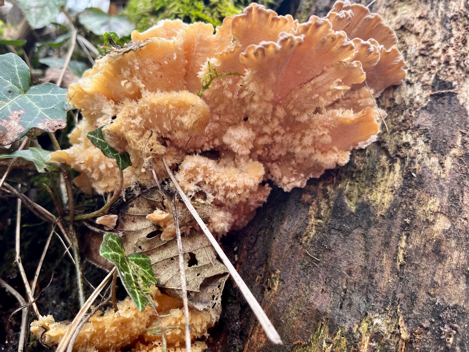 Hallo zusammen, eure Hilfe ist gefragt. Heut fand ich einen konsolenförmigen alten Pilz mit einer Anmutung zwischen Nordischem Porling und Gallertfleischigem Fältling, Stachelbart und Polsterpilz. Von allen etwas, also der ideale APR -Pilz. Flache Konsolen mit flatterigen Rändern, Poren, Stacheln und Borsten. Geruchlos nach dem Frost ist auch nicht ganz klar, ob die Farbtöne original sind. Eine Ganoderma aplanatum wuchs am selben Stamm.