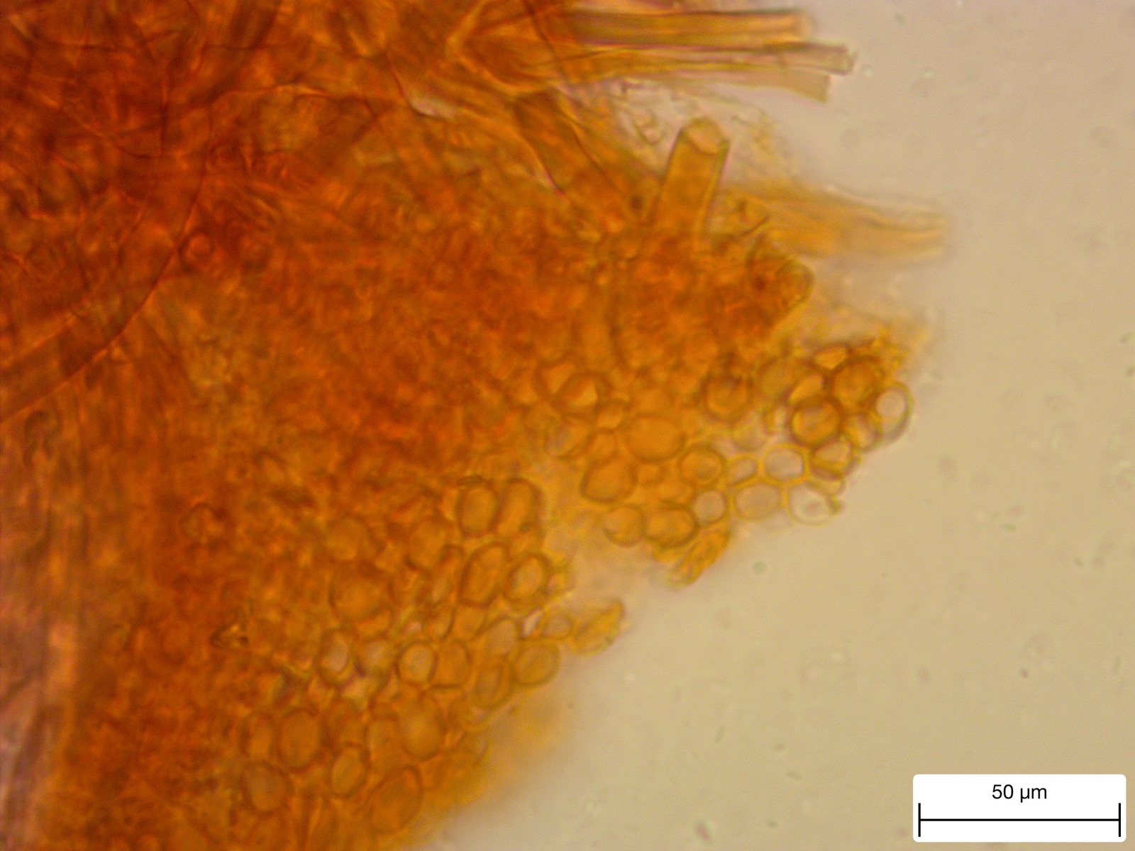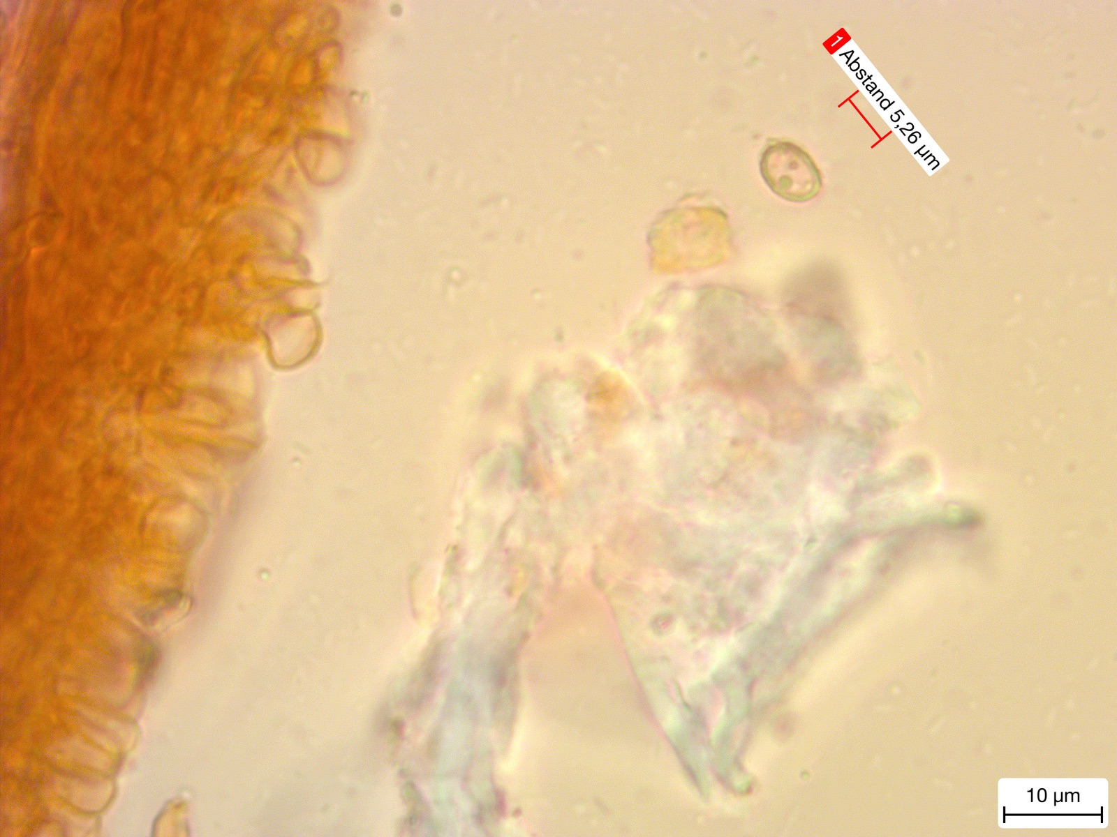 Leider fand ich auch nach mehreren Präparaten nur eine einzige Spore, was mich verwundert hat. Denn reif ist er garantiert. Ich hoffe, dass die Spore tatsächlich von diesem Pilz stammte. Auf alle Fälle würde sie von Größe und Form zum Nordischen Porling am ehesten passen. Der Rest auch.