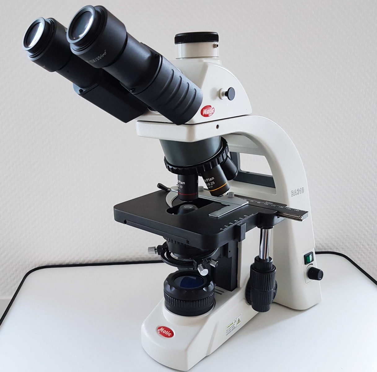 ich biete ein gebrauchtes, aber in gutem Zustand befindliches modernes trinokulares Labormikroskop Motic BA 310. Das Mikroskop ist mit vier Plan-Objektiven (4x, 10x, 20x und 40x) und zwei 10x-Großfeldokularen ausgestattet. Es verfügt über eine helle Halogenbeleuchtung, Konverisonsfilter und ist voll köhlerbar(!), also auch mit einer Leuchtfeldblende ausgestattet.