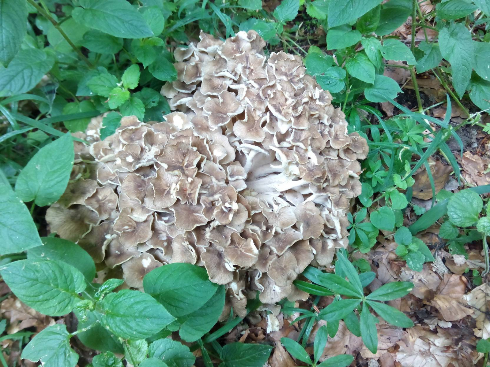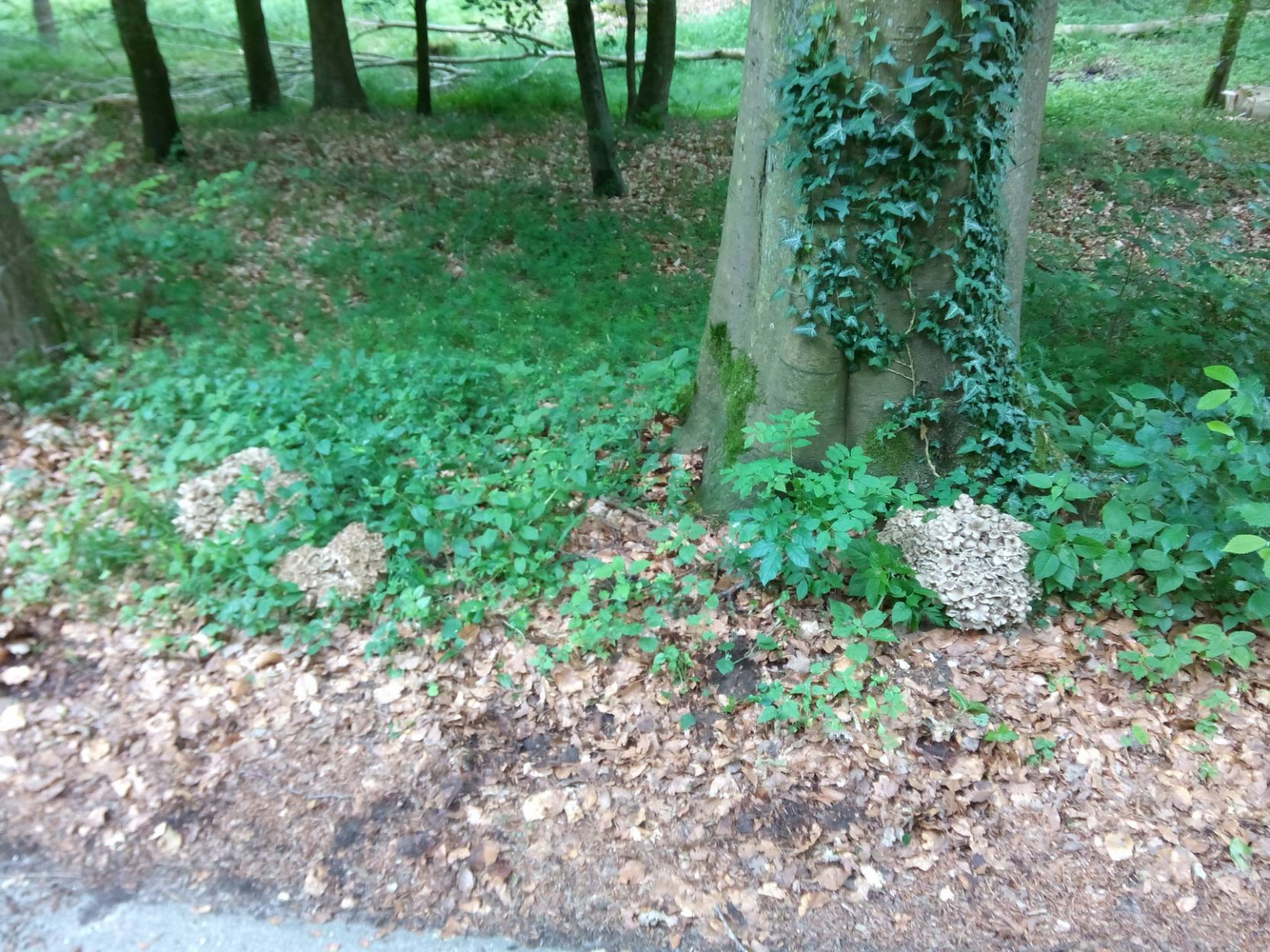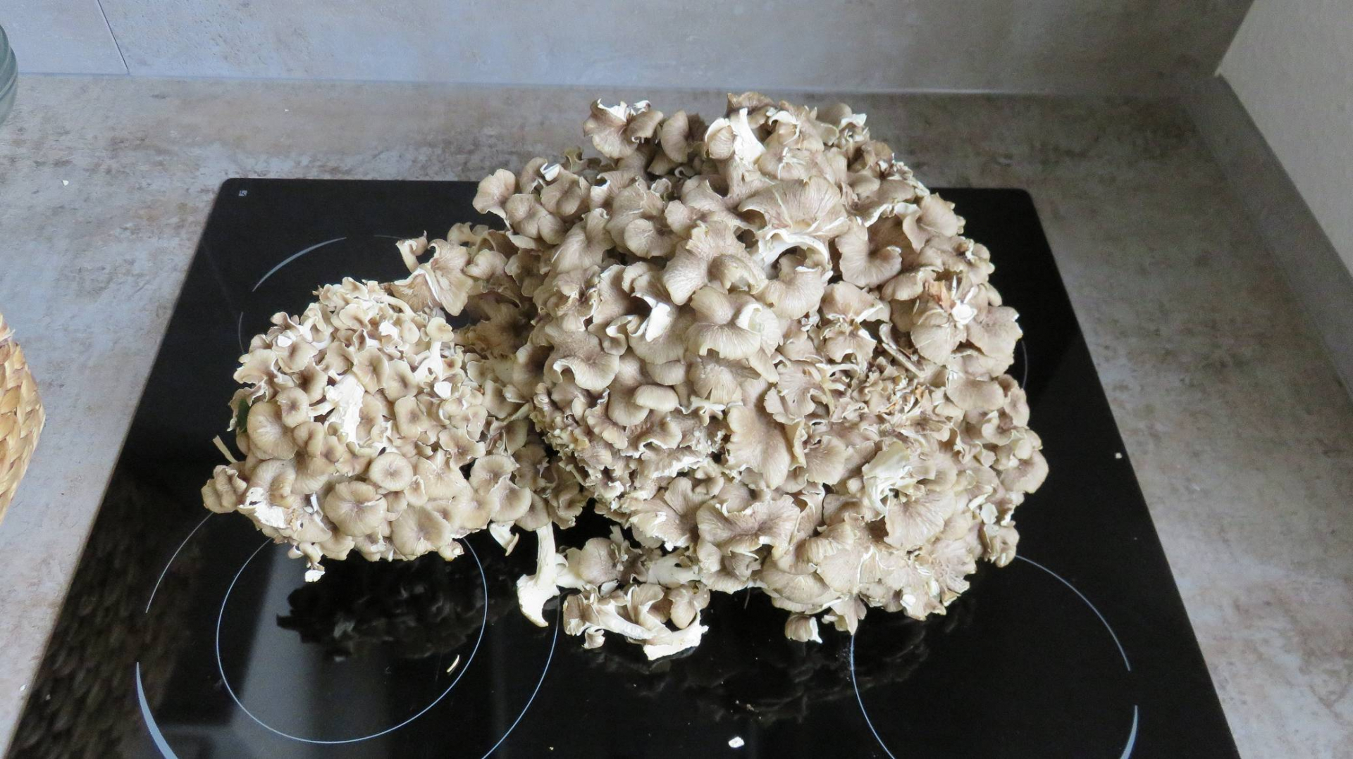Auf der heutigen Pilztour habe ich am Wegesrand im Wald am Fuß einer Buche drei Eichhasen entdeckt. Den am frischsten aussehenden habe ich geerntet, unsere lokale Pilzsachverständige angerufen, hingefahren und absegnen lassen.