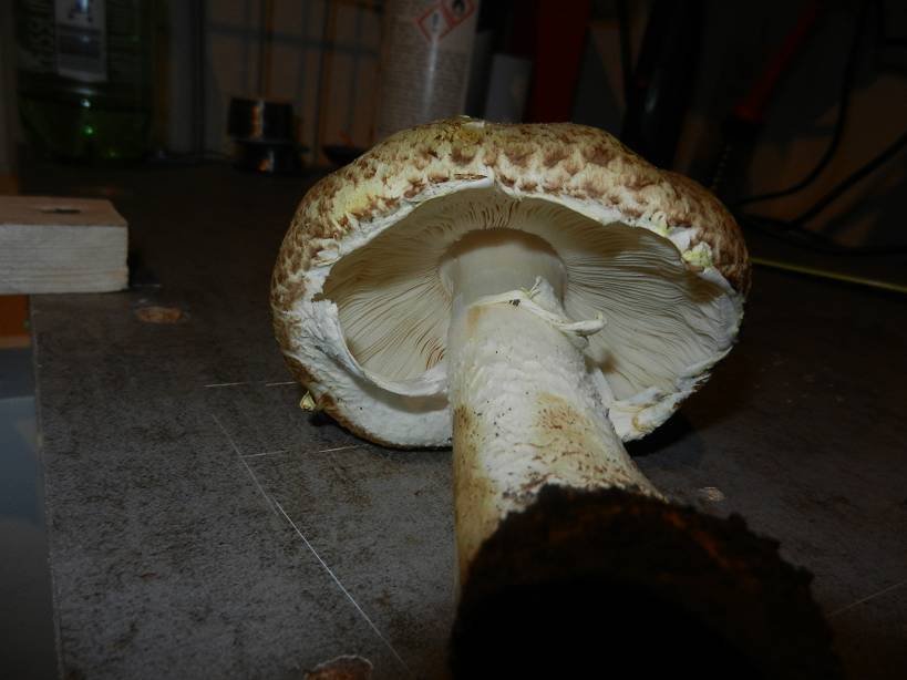 Hutdurchmesser: ca. 4-5 cm (das passt nicht so richtig zu einem Riesenchampignon, allerdings waren das auch recht junge Exemplare. Daneben stand auch noch ein größerer Pilz der gleichen Art mit ca. 10 cm Hutdurchmesser)