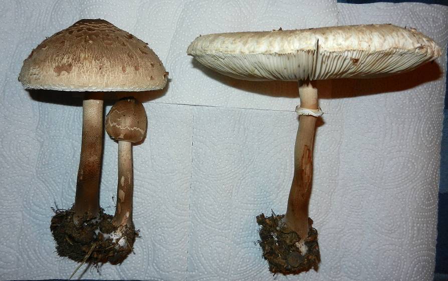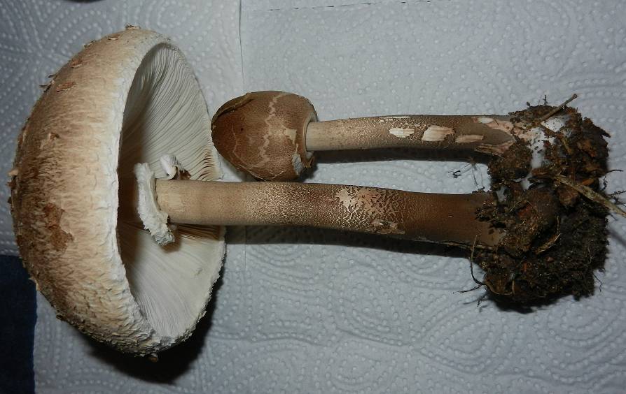 Beim Mittleren und Großen Fruchtkörper ist die Farbe weiß-bräunlich mit braunen Schuppen, deren Dichte zum Hutrand hin abnimmt.Stiel: Die Stiele haben Durchmesser von 1-1,5 cm, sind bräunlich (zur Stielbasis hin dunkler werdend), ganz innen hohl und haben ein genattertes Muster. Sie fühlen sich allerdings glatt an. Beim Mittleren und Großen Exemplar ist ein freistehender Ring vorhanden. Beim Mittleren erkennt man deutlich dass der Ring zwei aus zwei Teilen aufgebaut ist. Beim größeren Exemplar ist der Ring stark verkümmert. Mit etwas Hin-und Hergeschiebe lassen sich die Ringe lösen und dann frei bewegen. Die Stielbasis würde ich am ehesten als rübenknollig bezeichnen.