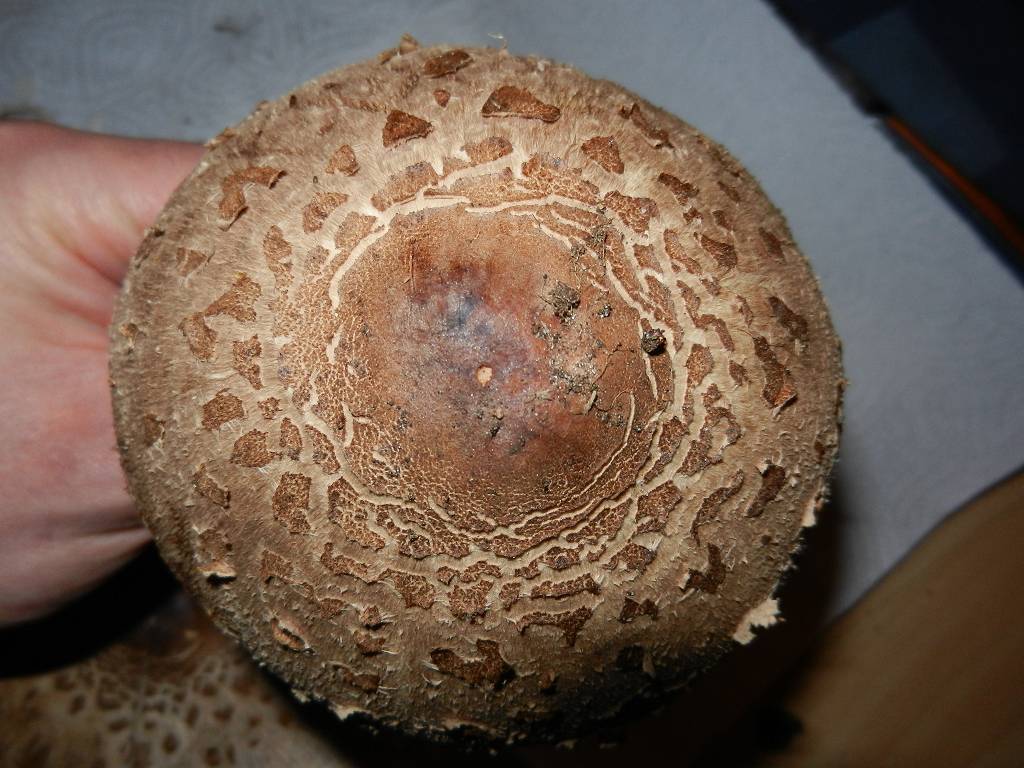 Hut: Durchmesser beim Großen ca. 18 cm, beim Mittleren ca. 10 cm, beim Kleinen ca. 3 cm. Beim großen Exemplar ist der Hut komplett aufgespannt (tellerförmig), beim mittleren halbkugelig und beim Kleinen eiförmig und mit dem Stiel abschließend.