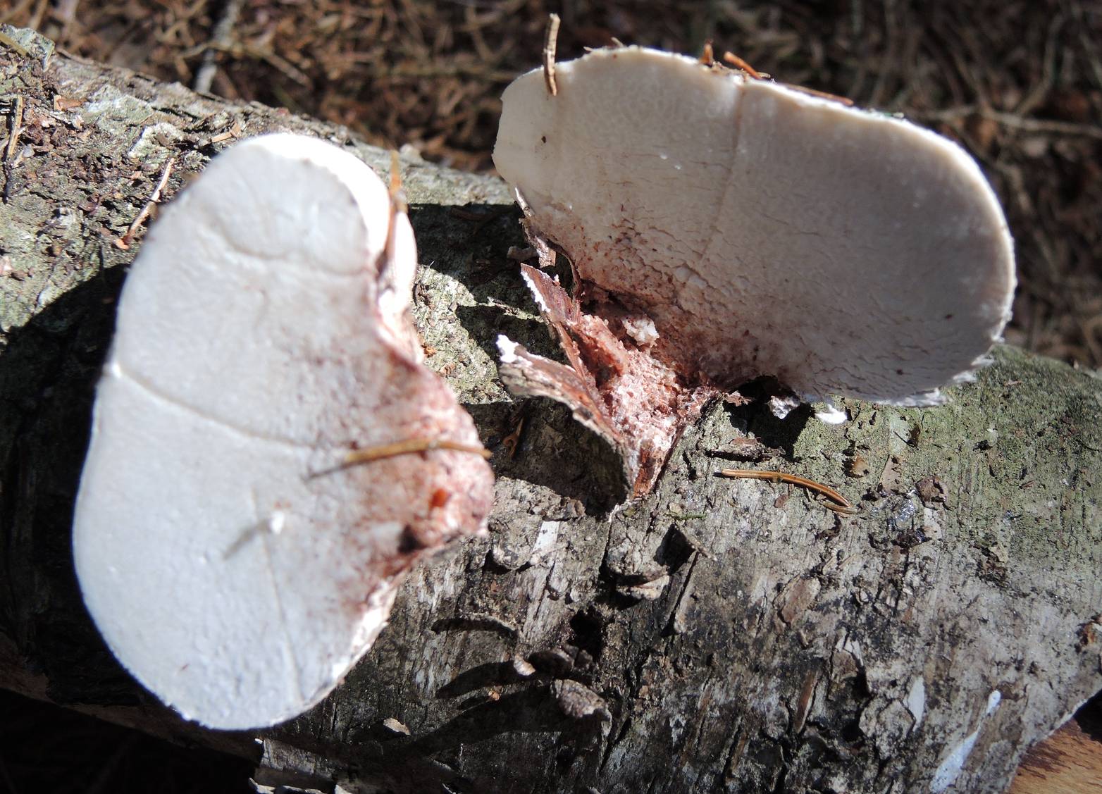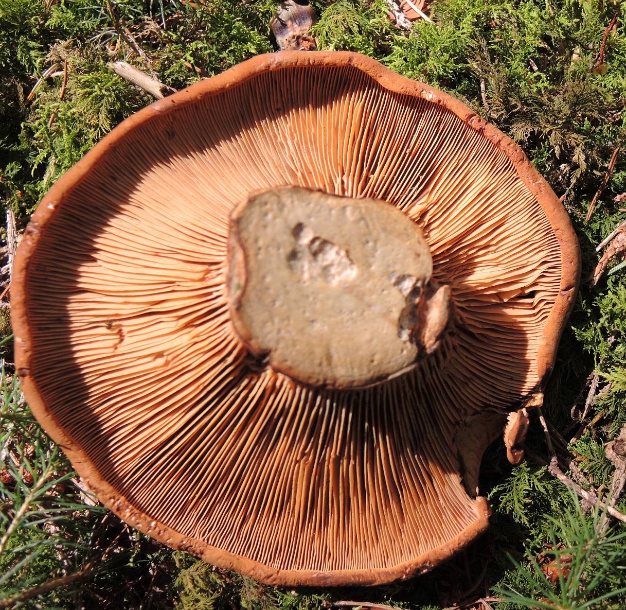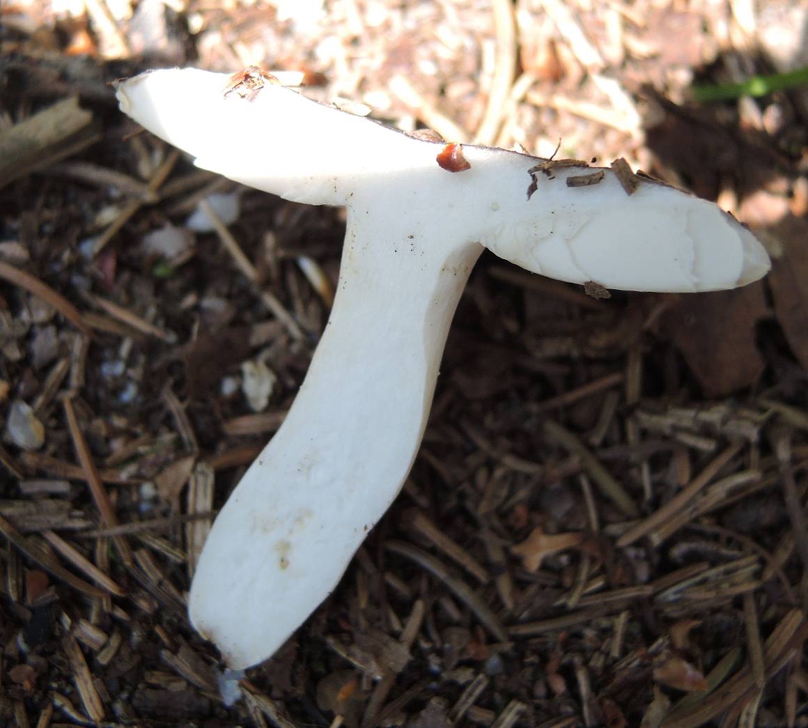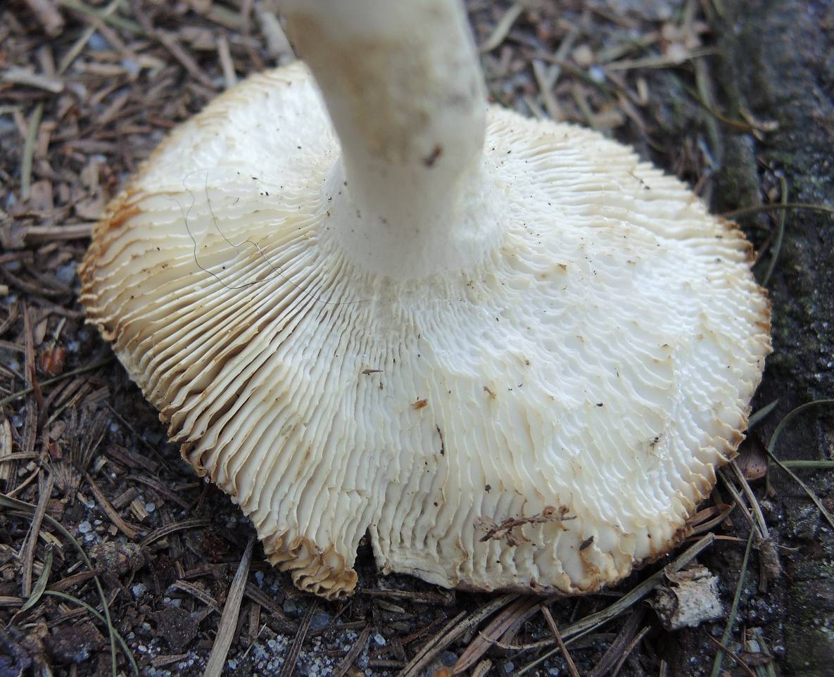 Lamellen: Weiß bis leicht gelblich, teilweise rote Schneiden, splitternd, am Stiel leicht herablaufend