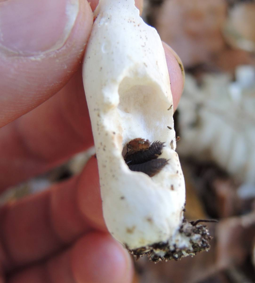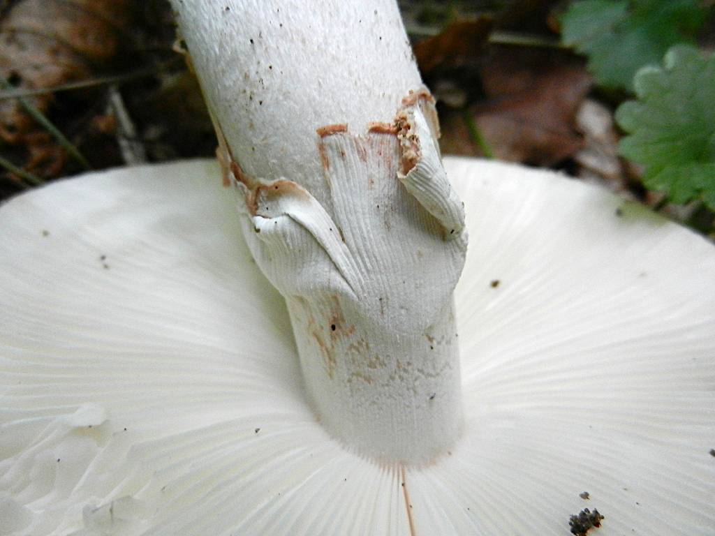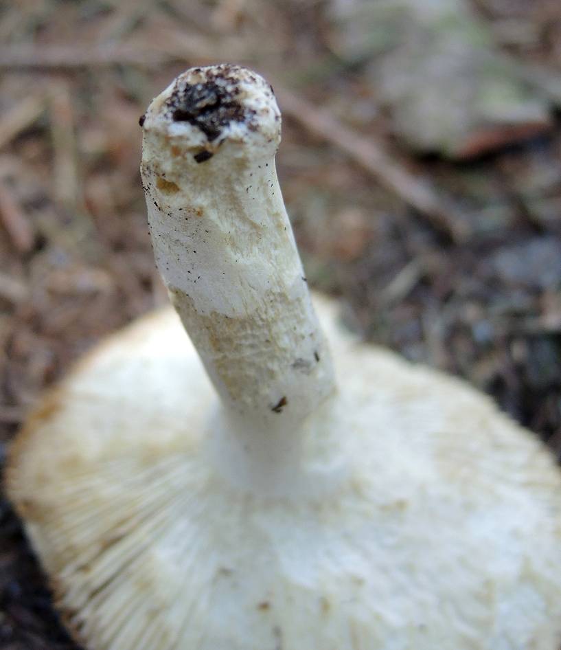 Stiel: weiß, in Richtung Basis gräulich-schmutzig genattert, Basis knollig, lappige Scheide, Manschette nicht zu erkennen bzw. stark verkümmert (vermutlich wegen Trockenheit)
