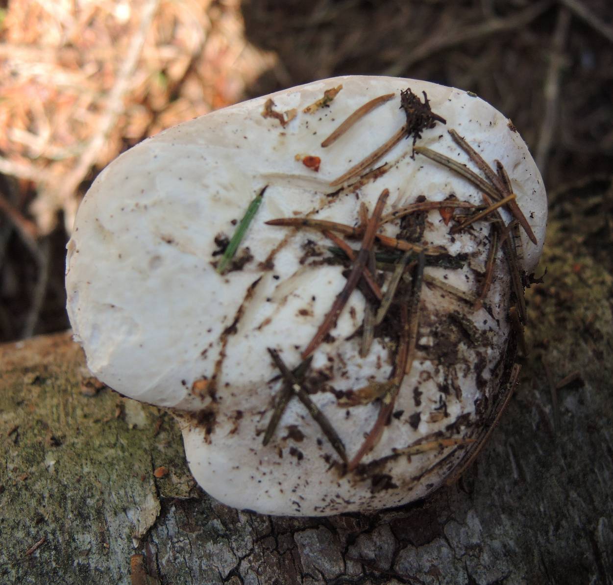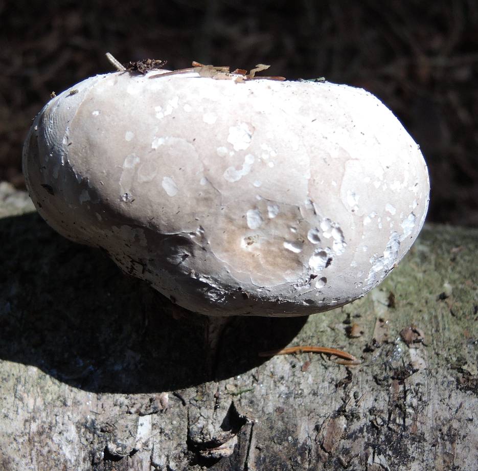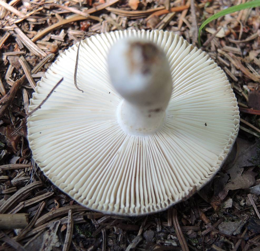 Hut: Weiß-gräulich, flach, leicht um Lamellen gebogen