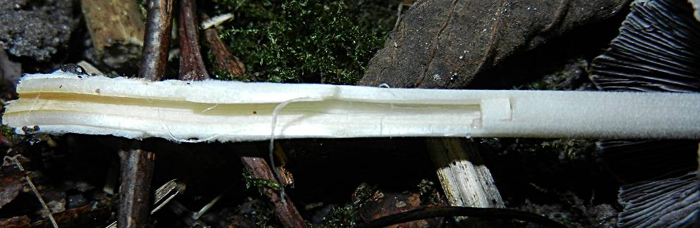 Stiel: Weiß bis schmutzig-grau, längsfaserig