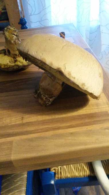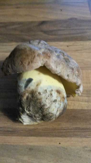 ich würde den Boletus radicans nennen; im Alter riechen die schon etwas chemisch (nach Medizinschrank). Die anderen Pilze, die so ein Aussehen haben können, sollten nicht blauen... Der gehört zu der "bitteren" Röhrlingsfraktion. Wenn du einen von denen in deine Pilzpfanne schneidest, dann hast du deine ganze Pilzpfanne versaut.