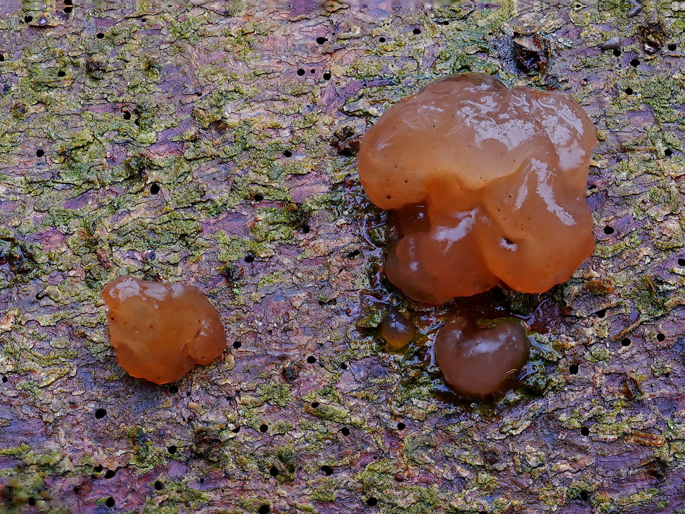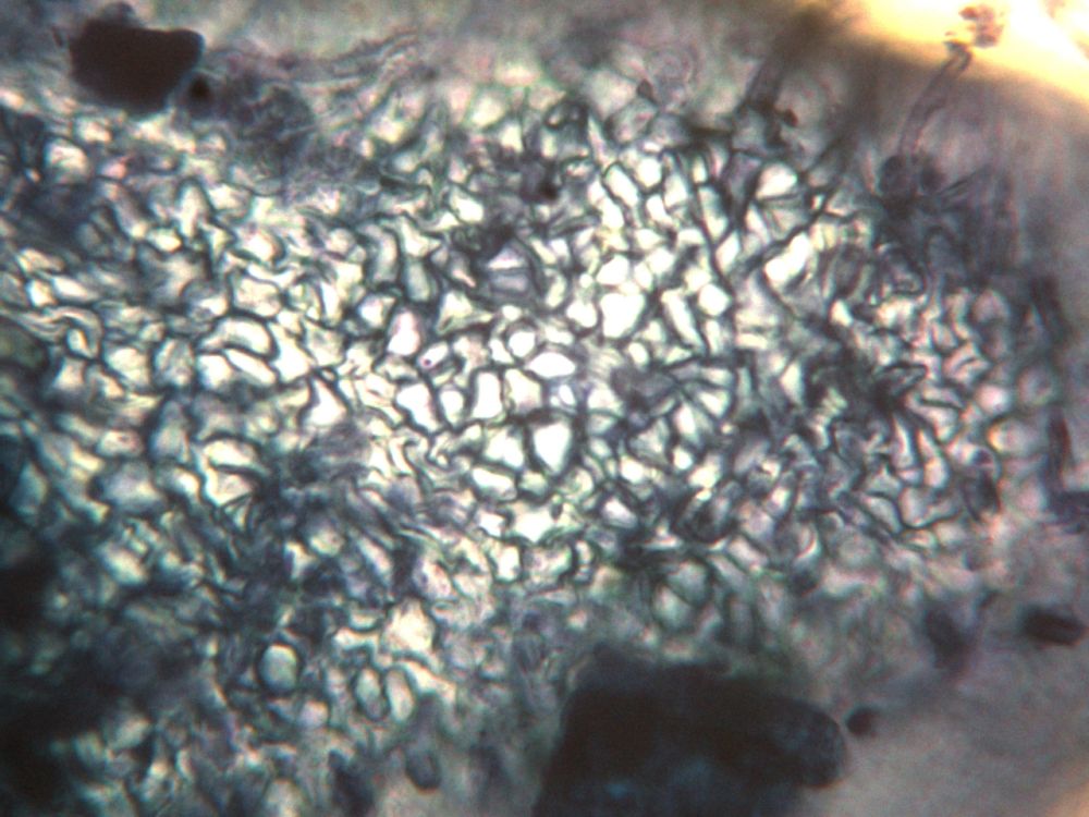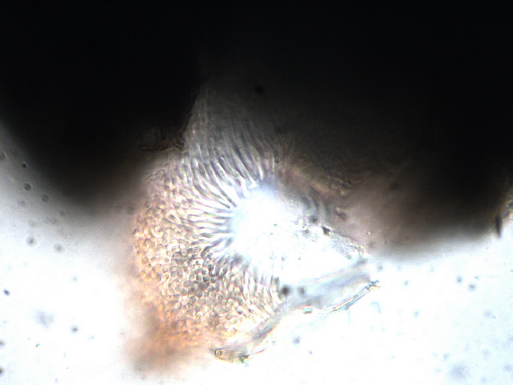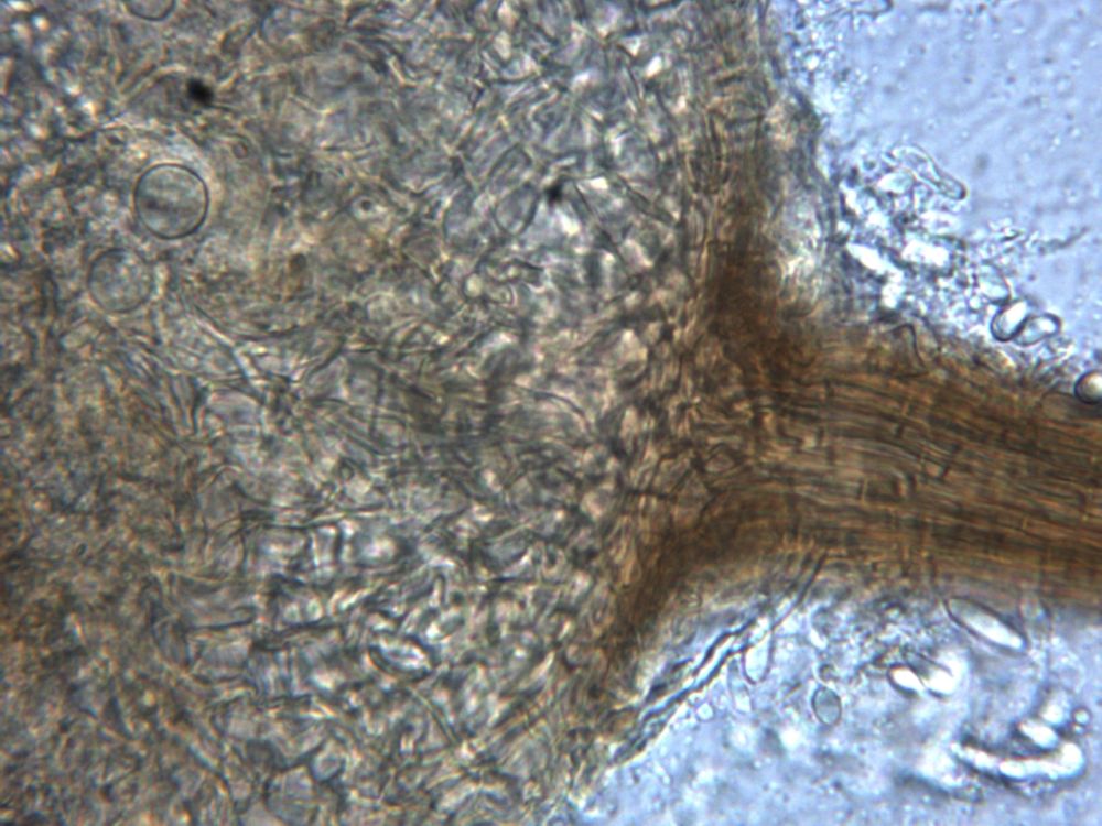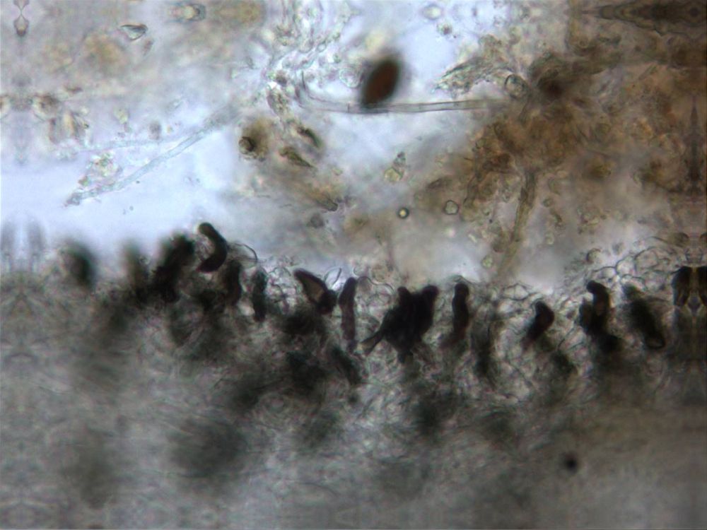 Ich war an diesem Tag schon mit Jochen Maassen in Dahlheim verabredet wo ich mit Ihm nach gallertartigen Arten wie Tremella, Exidia etc. Ausschau halten wollte. Mein besonderer Wunsch waren dann Nadelwälder mit viel Totholz. Jochen hatte dann so eine Idee, wo er mal vor 2 Jahren braune Exidia gesehen hatte. Nach langem Suchen zeigten die sich tatsächlich auf dicken vom Sturm gefällten Fichtenstämmen, die in einem Wirrwarr durcheinander lagen. Da ich E.saccharina schon kannte, wollten diese Frk. mir nicht so recht als solche gefallen. Zuhause bei der Bestimmung sind mir dann die Wurzeln im unterem Bereich der Frk. aufgefallen. Leider waren hier und auch bei den schwarzen Frk. keine Sporen mehr zu finden. Überrascht hat mich dann die wunderschön ausgeprägte Form der Hyphidien welche möglicherweise für diese Art besonders ist!