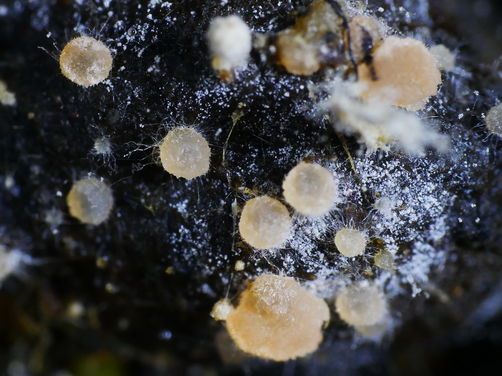 Frk. auf Wildschweindung, Frk.-Größe 2 - 5 mm, mit dickem Belag verschiedener Zellen