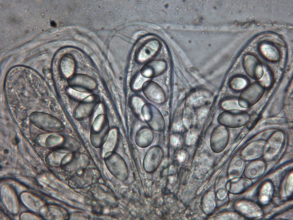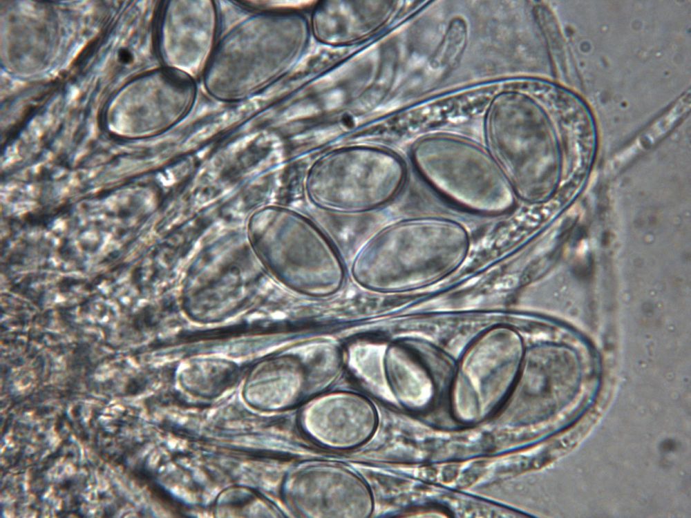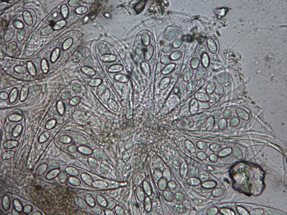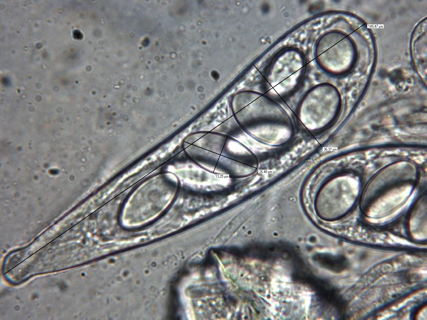 Asci: bis 200 (250) x - 15 µm breit, Asci und Paraphysen bei jungen Frk. in Wasser leicht gefärbt