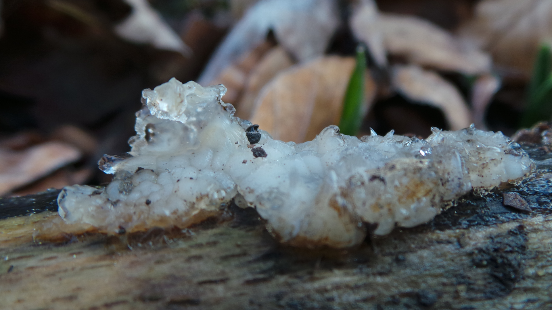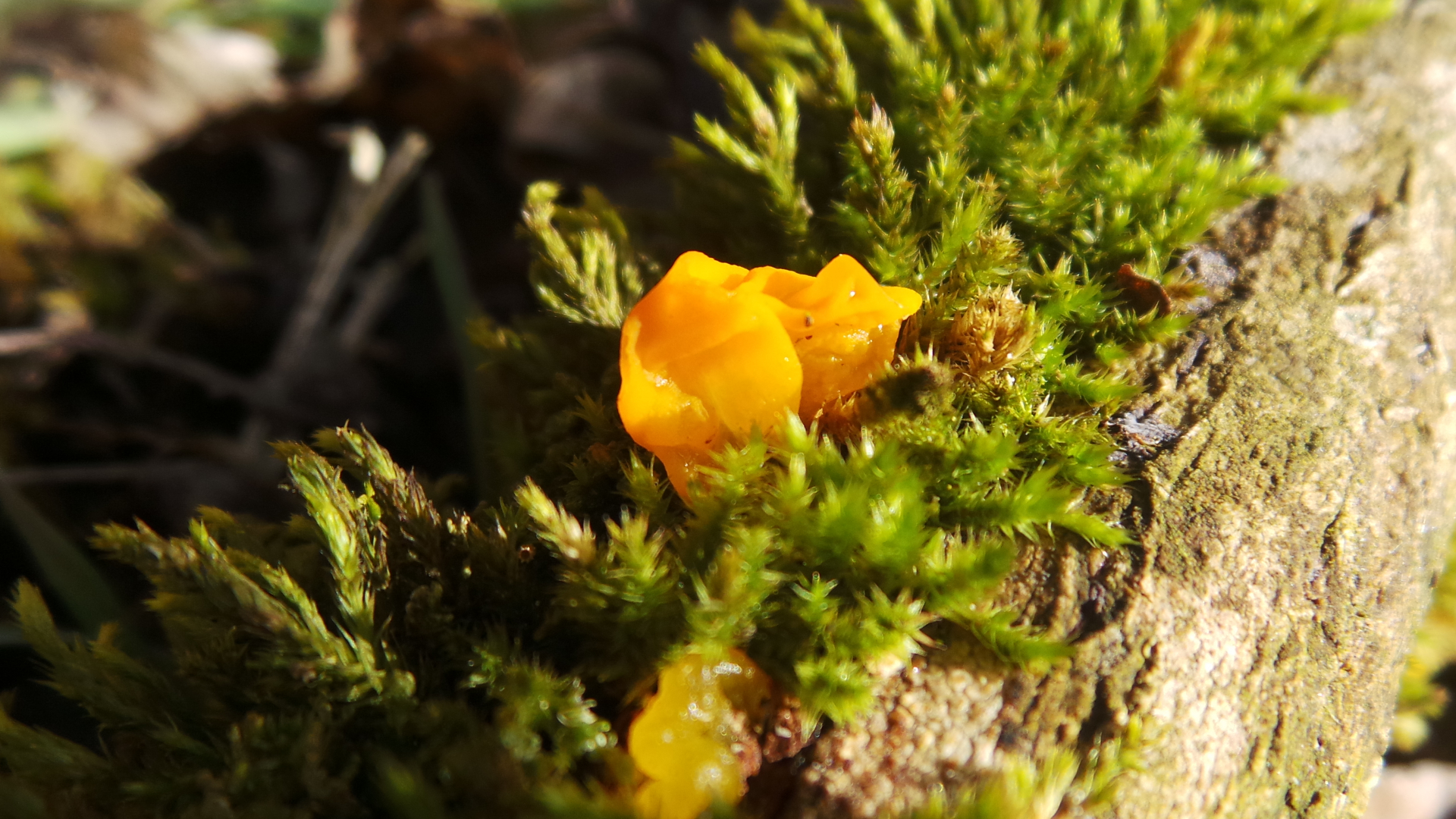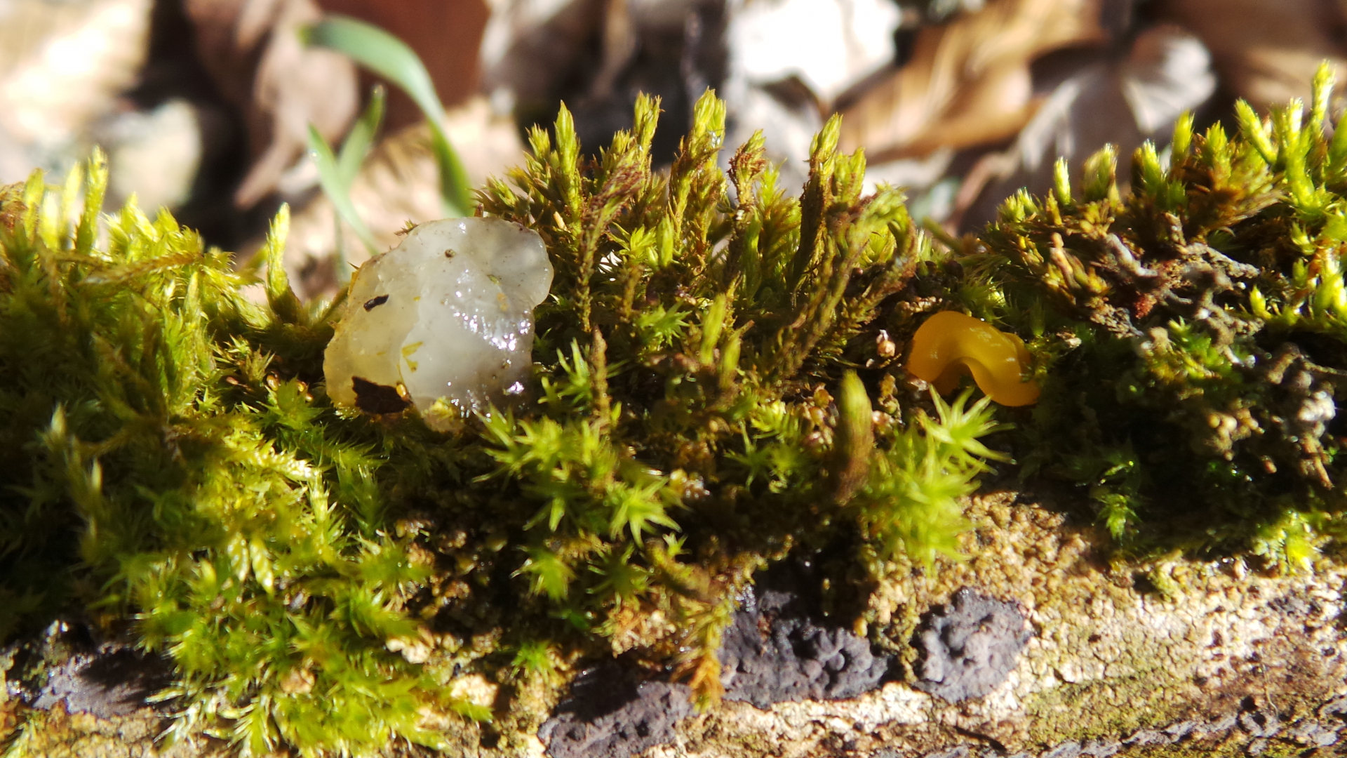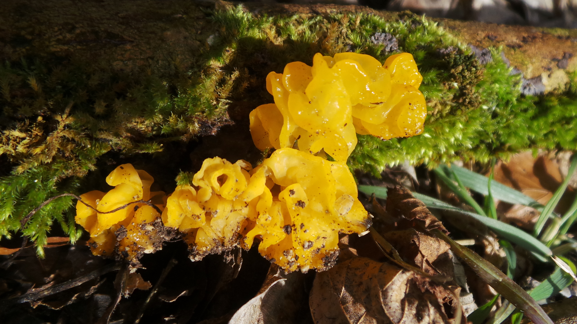 An einem liegenden Ast am Wegesrand der goldgelbe Zitterling und seine weiße Variante (?):