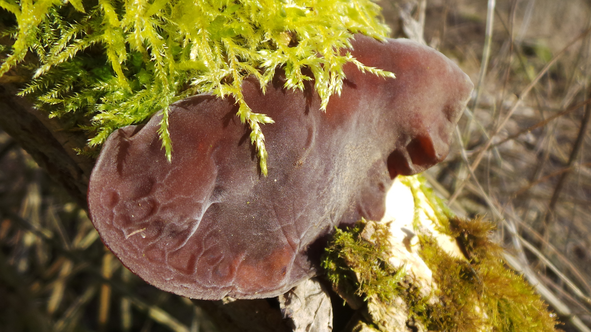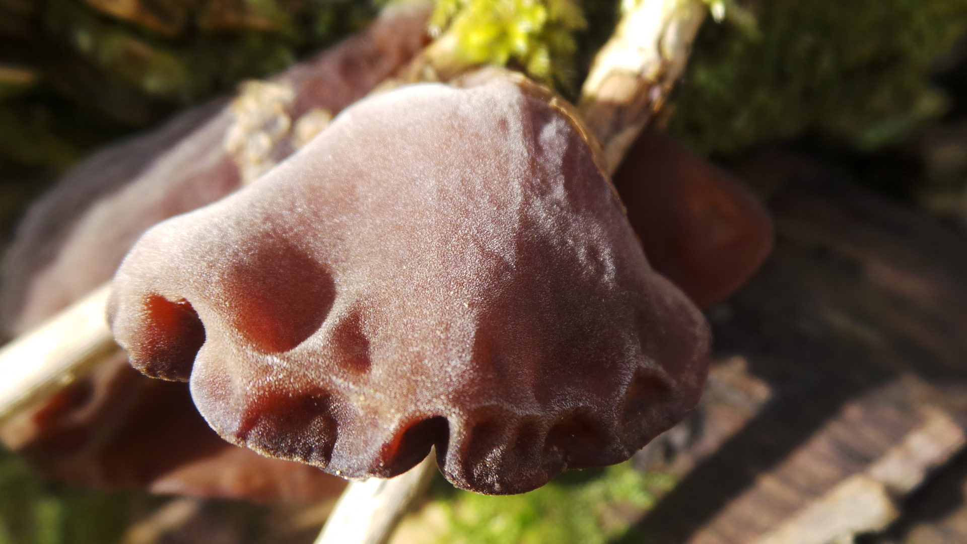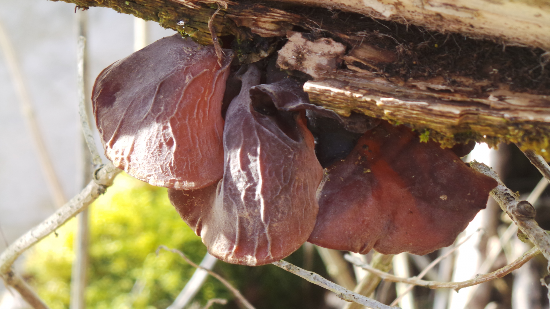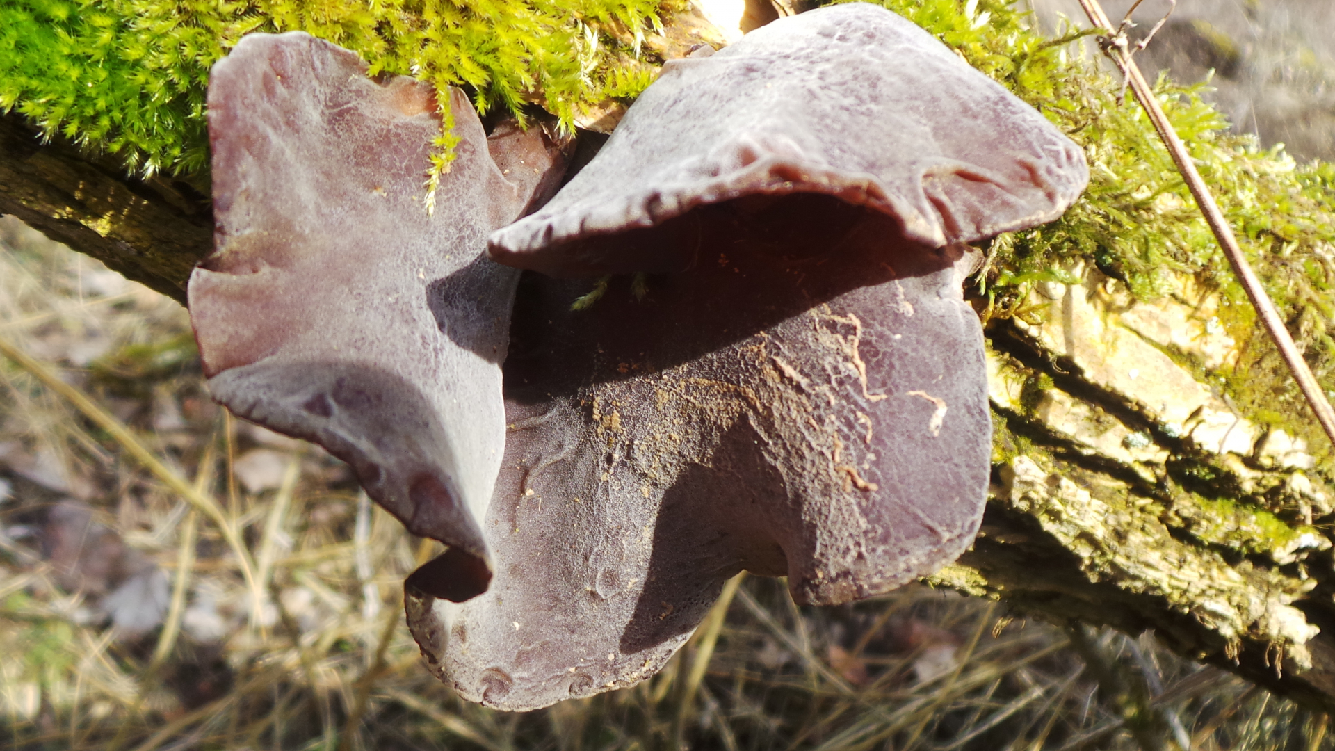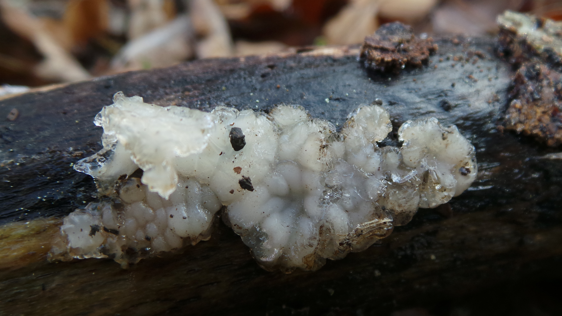 An einem liegenden Ast am Wegesrand der goldgelbe Zitterling und seine weiße Variante (?):