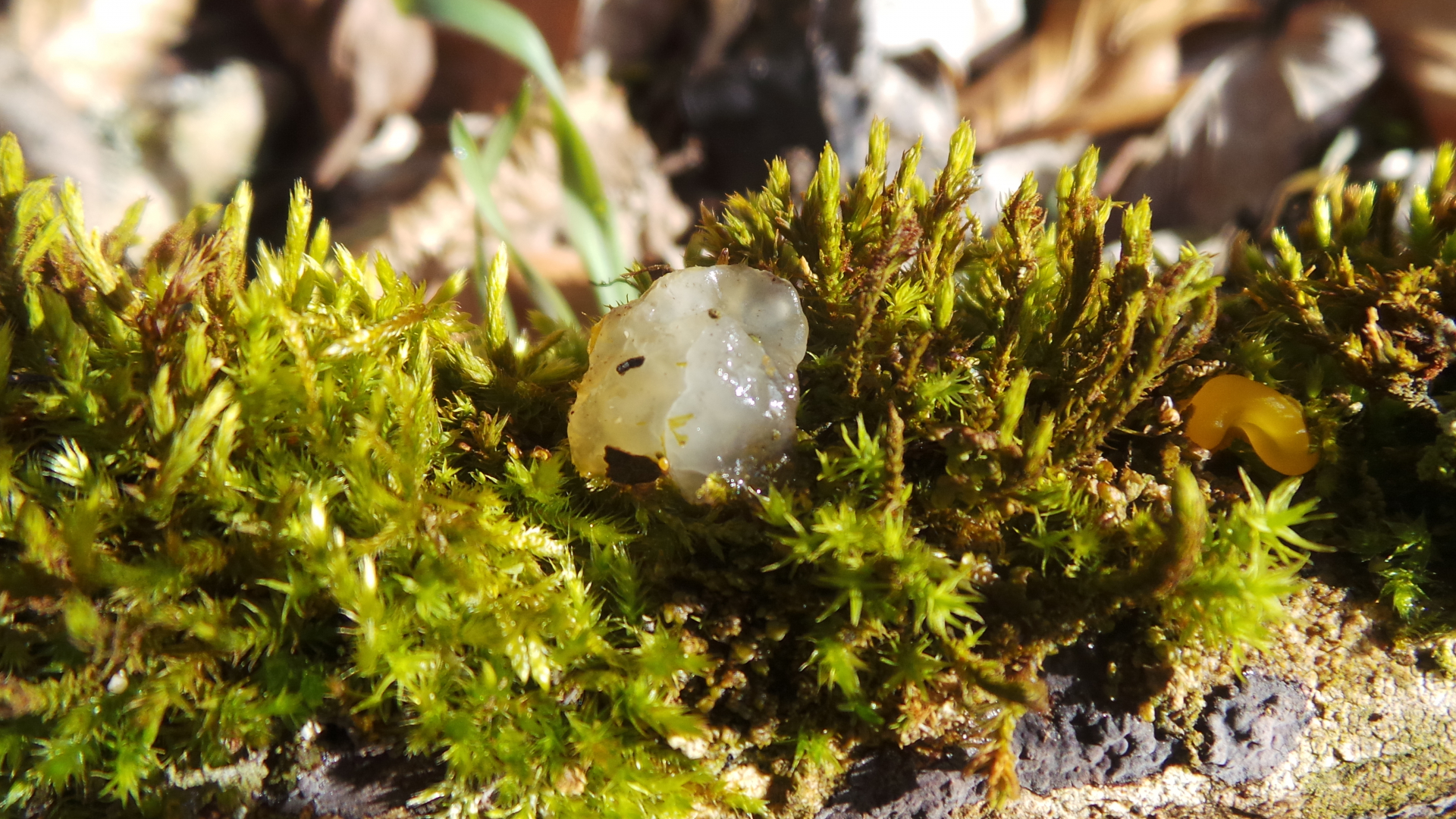 Mittendrin wuchs noch ein kleines hellorange-gelbliches Becherchen, Durchmesser ca 12mm, mit längerem weißen Stiel, kennt den jemand? :