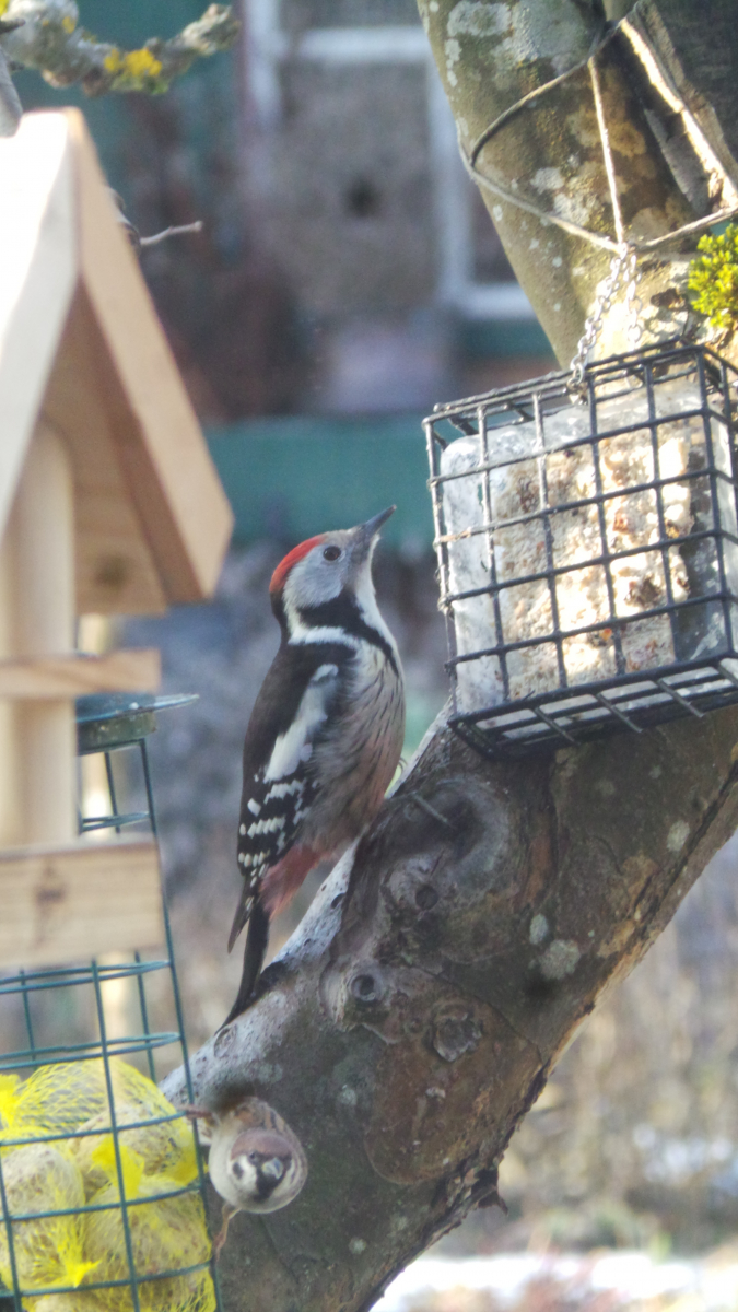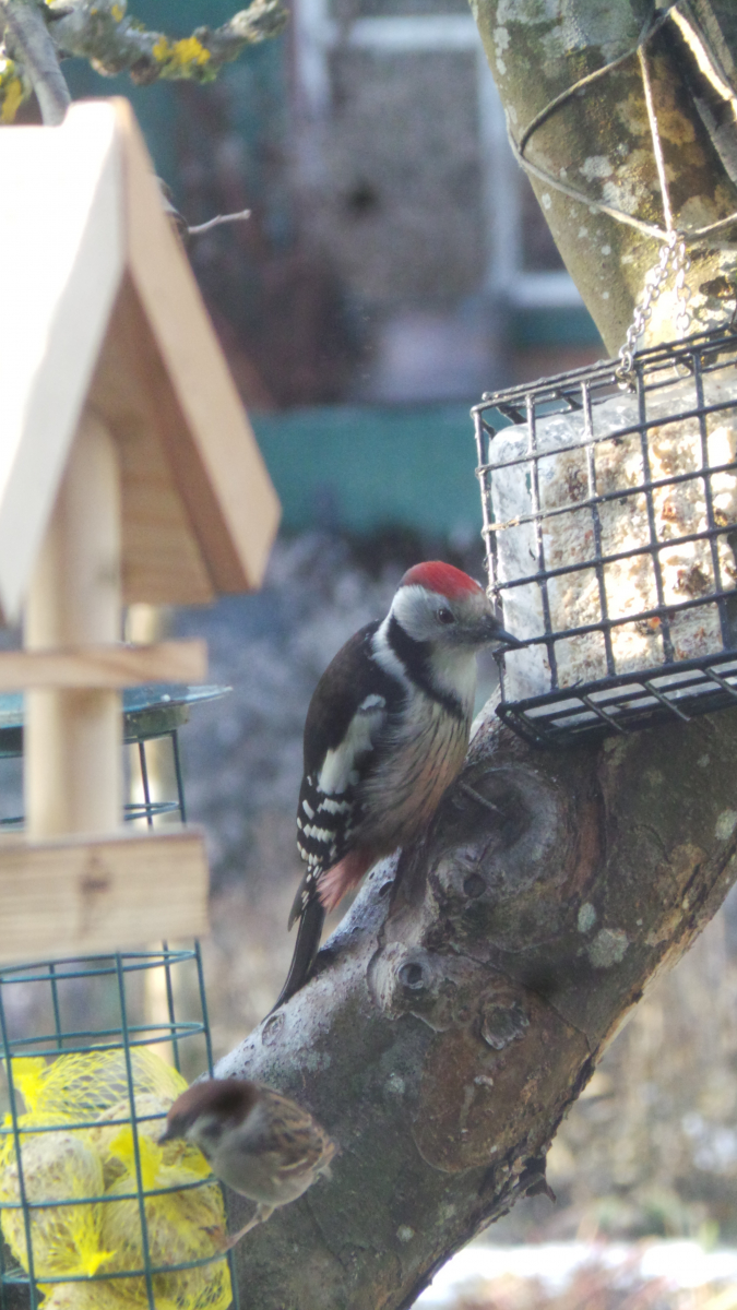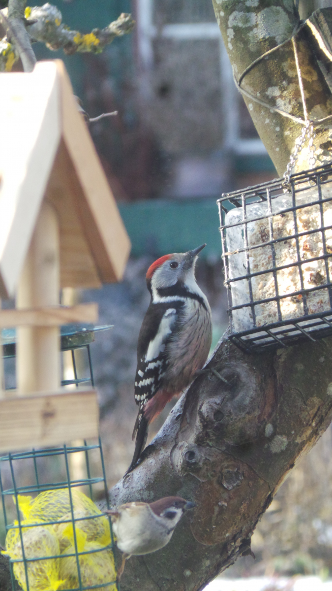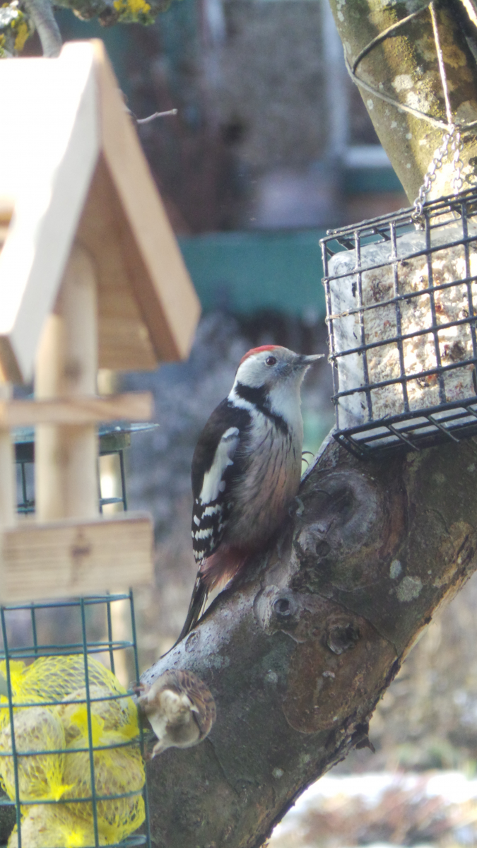 Auf zwanzig Buntspechte kommt ein Mittelspecht. Er ist etwas kleiner als der Buntspecht, das Bäuchlein ist nur sanft rosa gefärbt, und statt einem roten Nacken wie der Buntspecht hat er einen roten Scheitel.