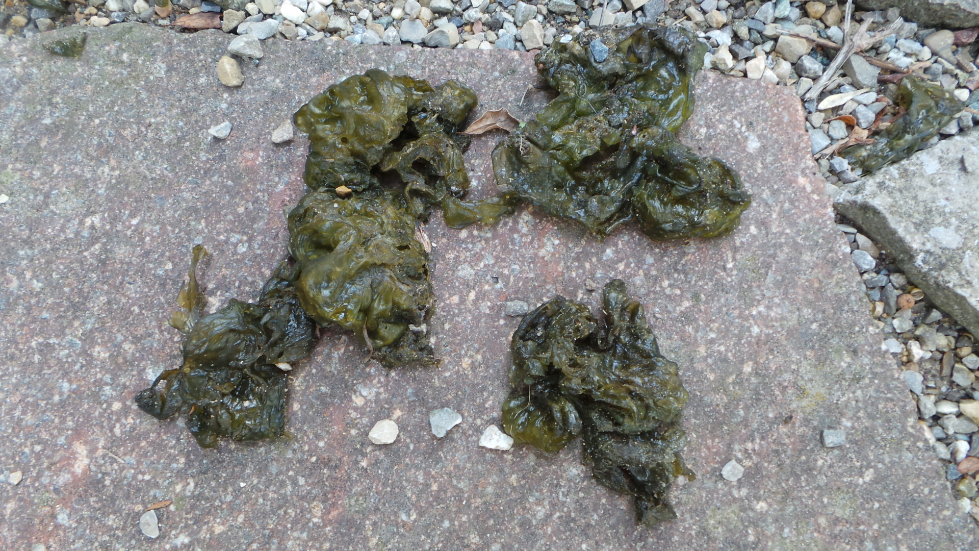 An Baumstumpf, mit gefärbten Guttationstropfen: