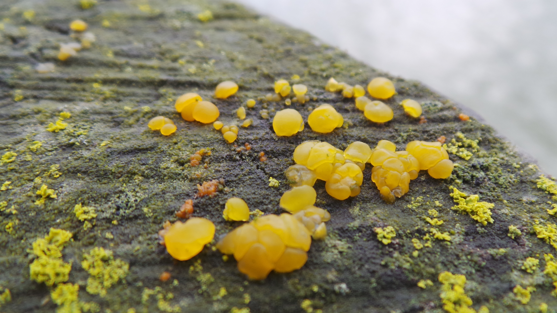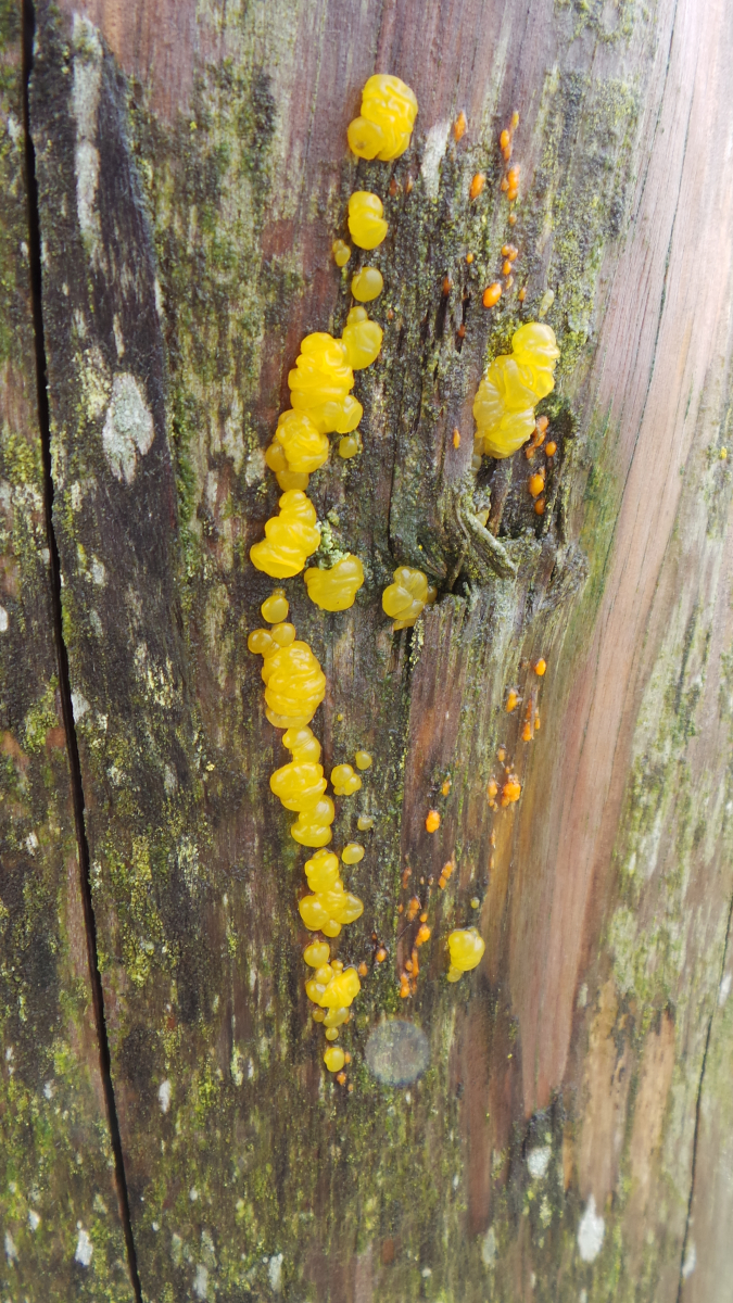 Zu meiner außerordentlichen Verdatterung fand ich an den ortsüblichen im Hafenbereich eingerammten Rundhölzern tatsächlich offensichtlich salzwassertolerante Gallertpilze, orange und gelb: