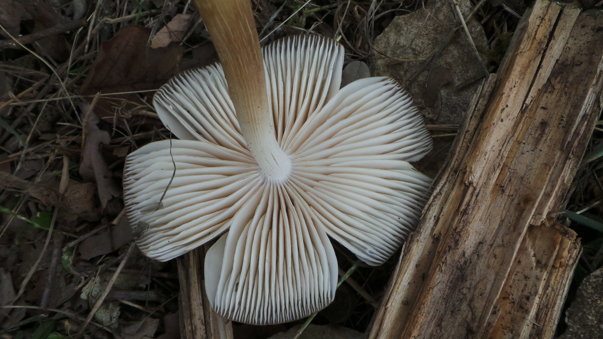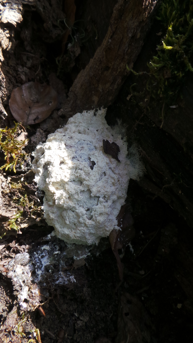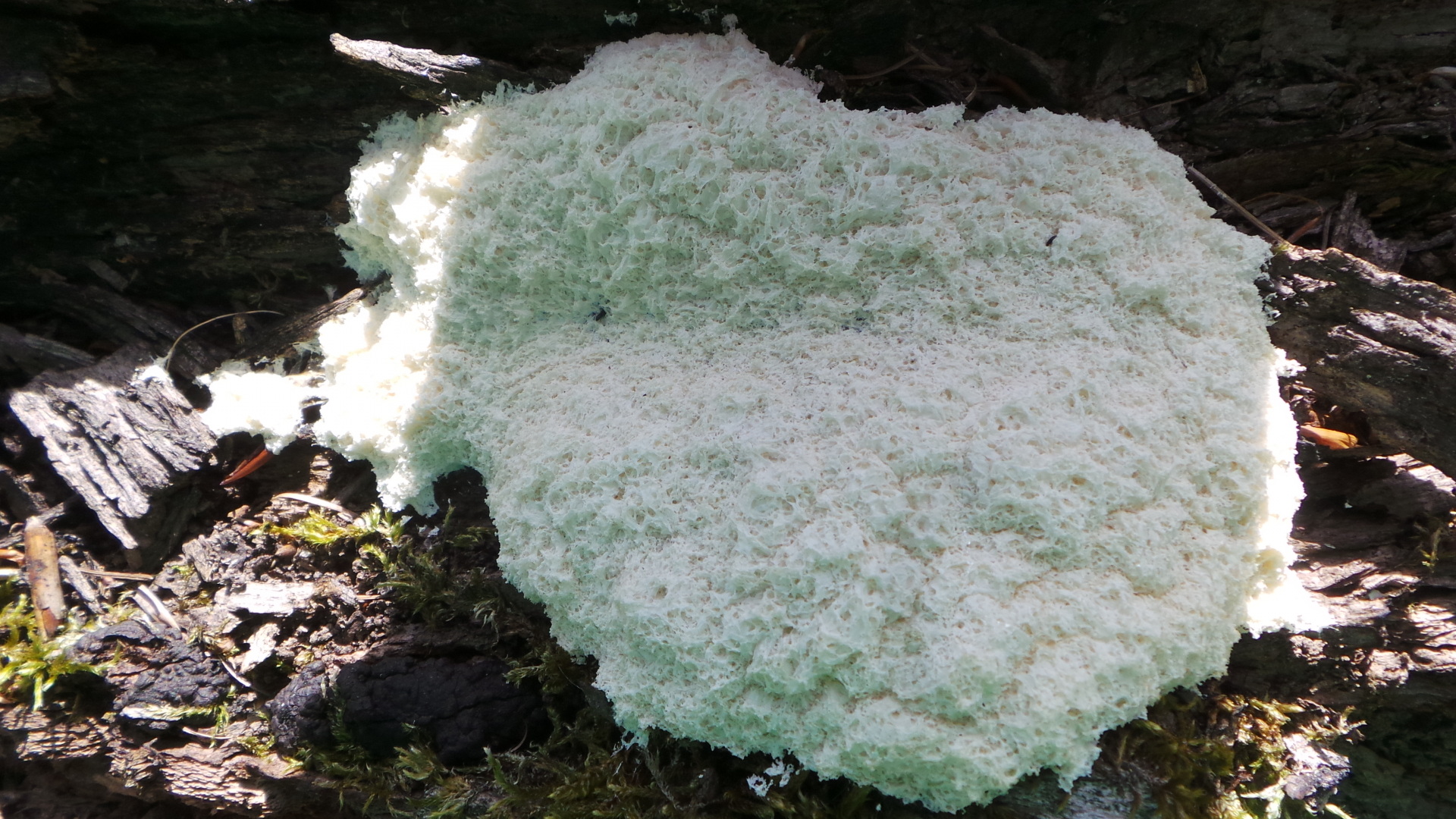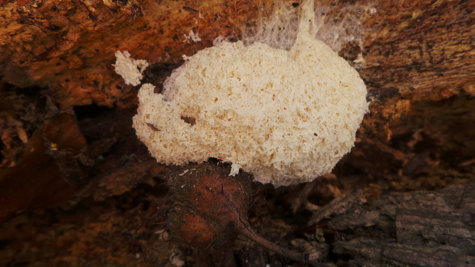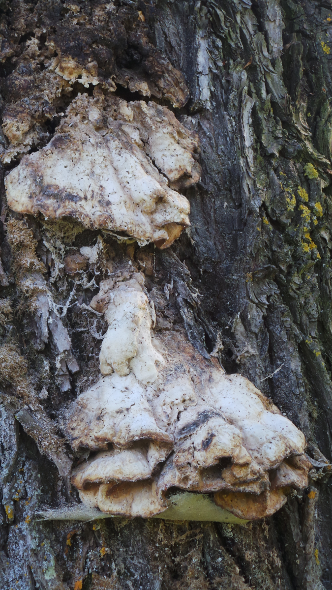 Auf einem vor ca 15 Jahre vom Sturm gefällten Baumstamm ein heller mir unbekannter Pilz: