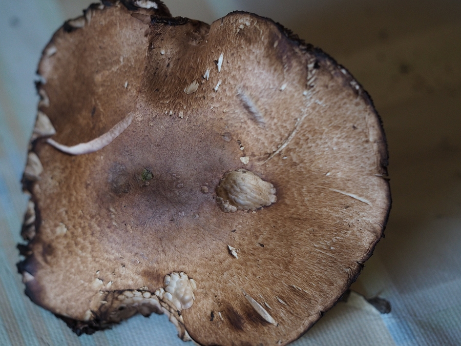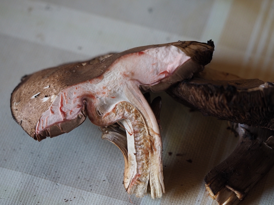 Am Wegrand bei Fichten (auf der anderen Seite Laubwald), im "Büschel" mit 2 weiteren Exemplaren, Durchmesser ca. 10 cm+, braune Schuppen, Ring nur noch teilweise vorhanden, Stielbasis bei Anschnitt an den Schnitträndern sofort stark rötend (zunächst hell wie frisches Blut, später verschwindend) Lamellen bei Druck sofort stark rötend. Hätte alles auf den Großen Blutegerling/Waldchampignon (AGARICUS LANGEI) gepasst.