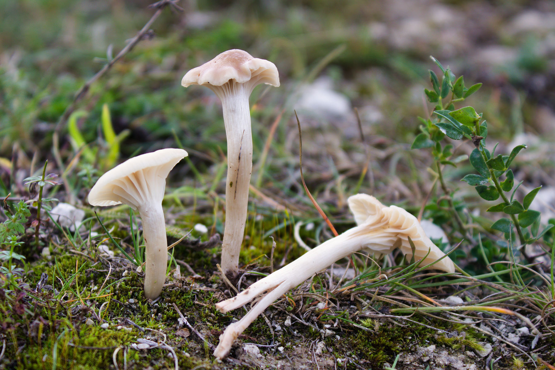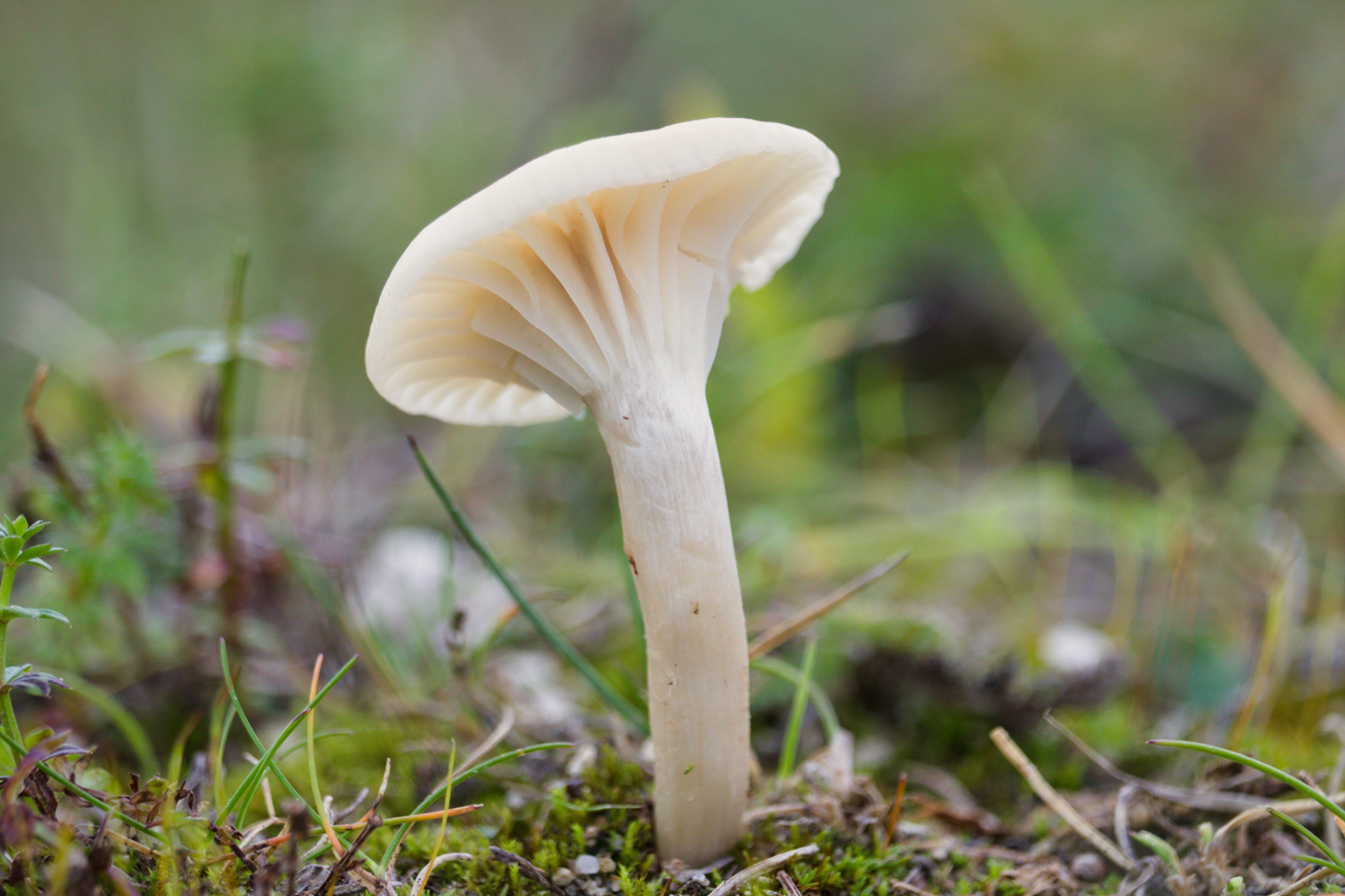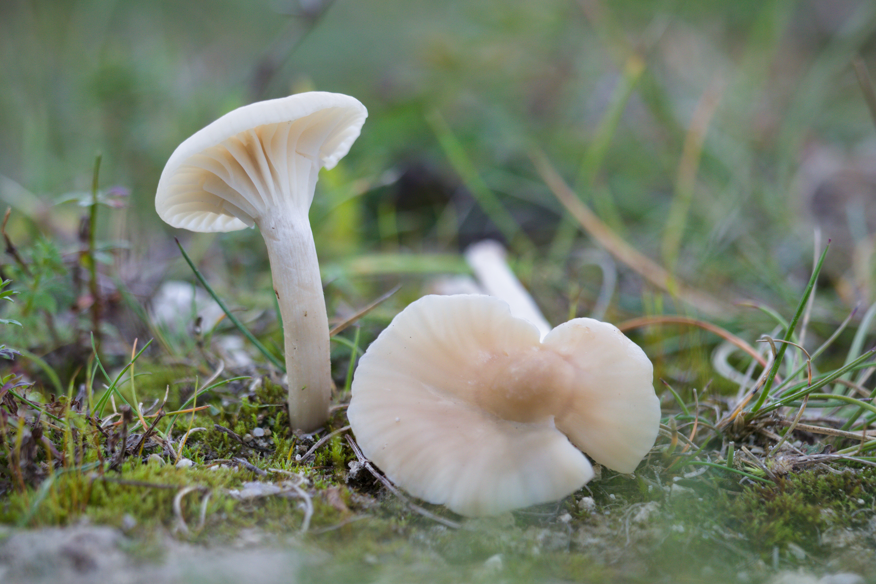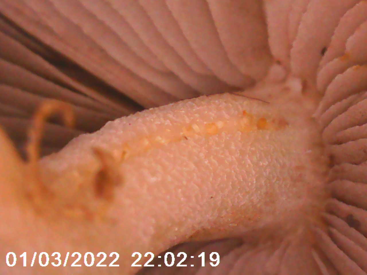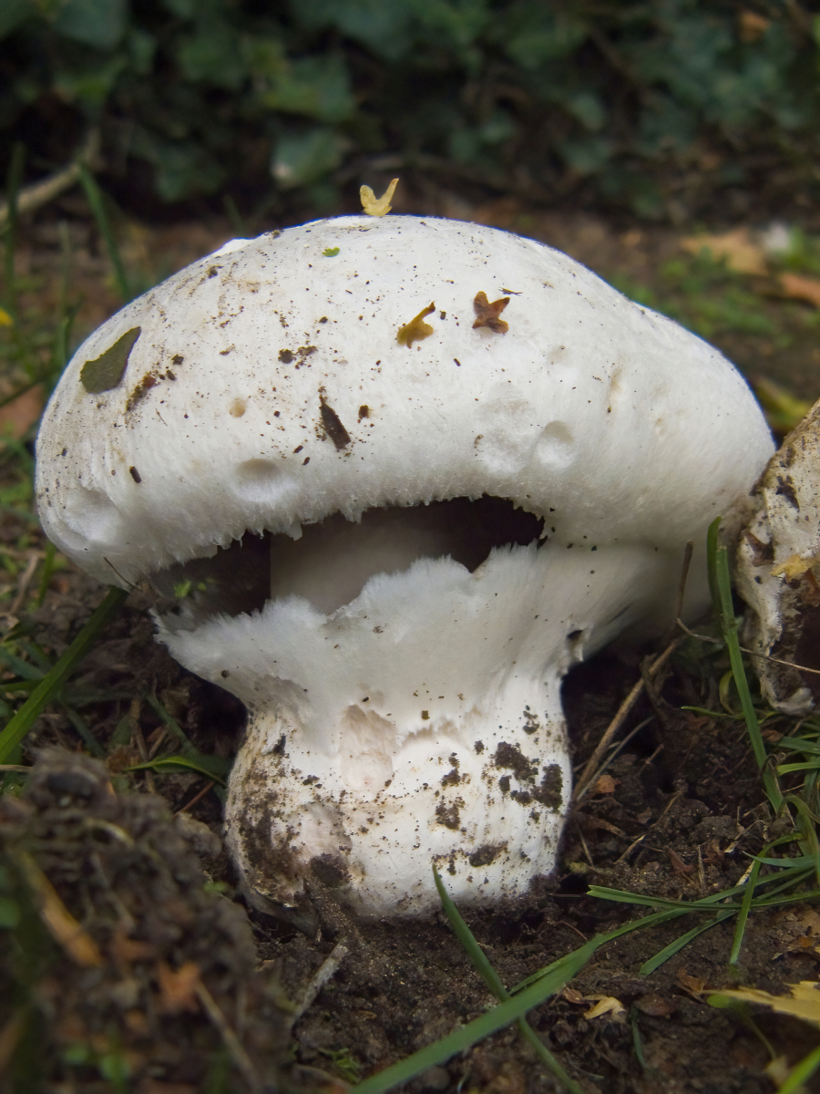 Stiel +- durchgehend weiß, zur Spitze hin mit feiner weißer Bereifung, Basis knollig verdickt. Bis 6cm lang. Trama rötend.