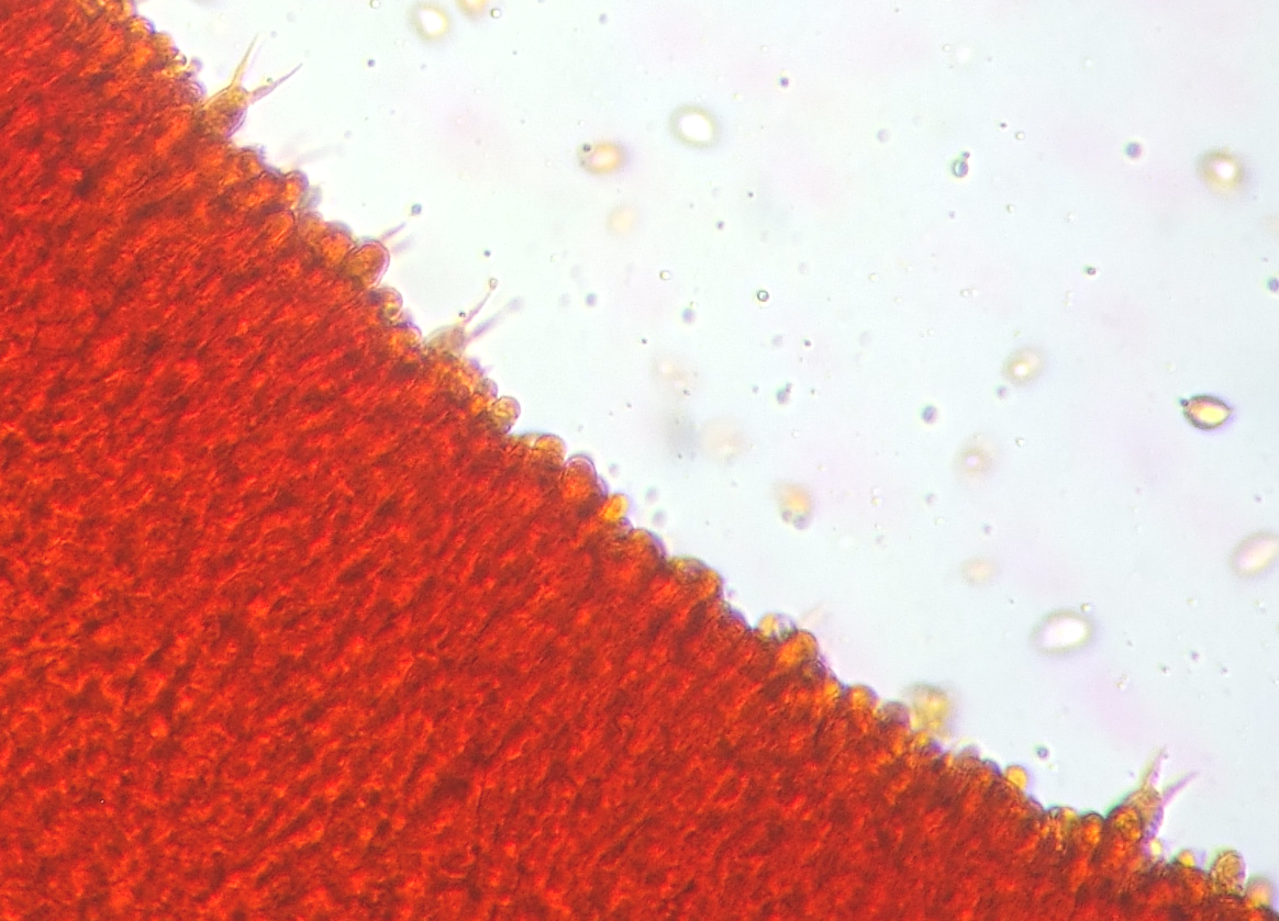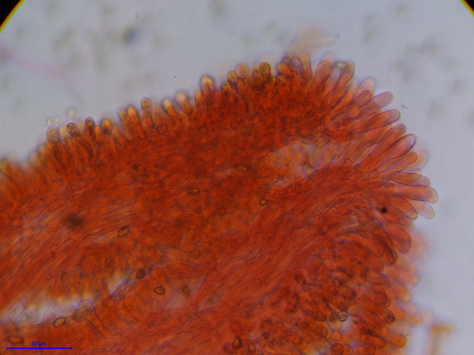 Cheilozystiden und Pleurozystiden vorhanden, metuloid mit Kristallschopf. Wandstärke bis 3,5. Unterschiede in Hymenialzystiden nicht beobachtet. ca. 50x20.