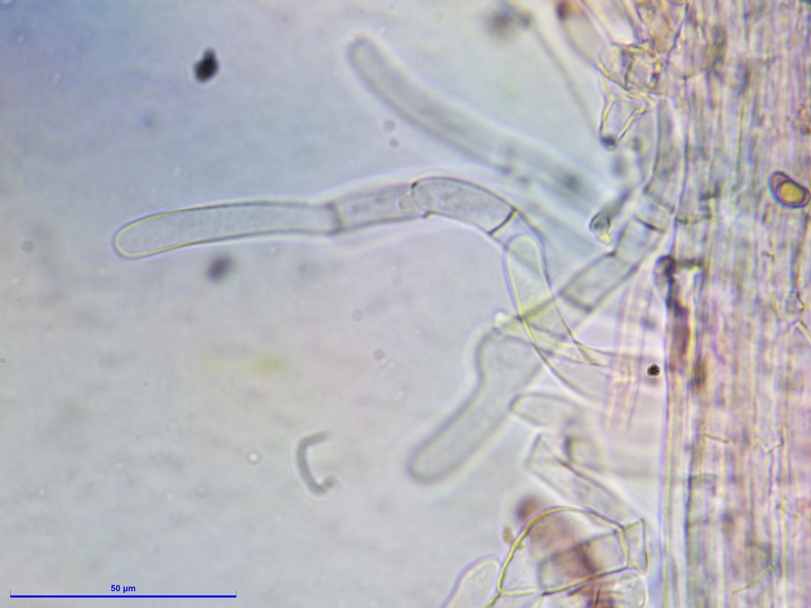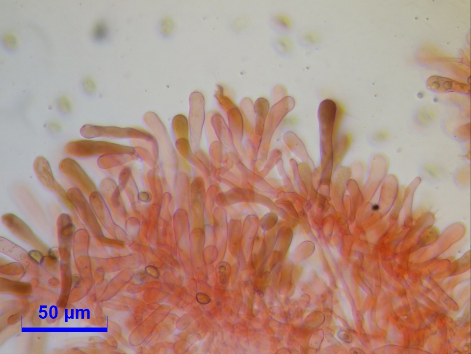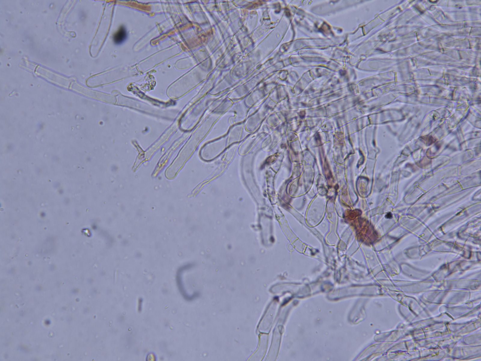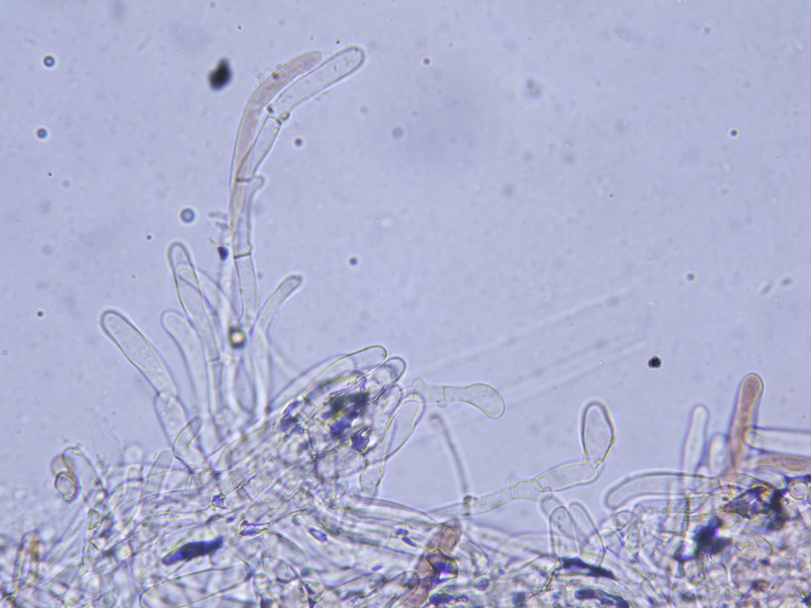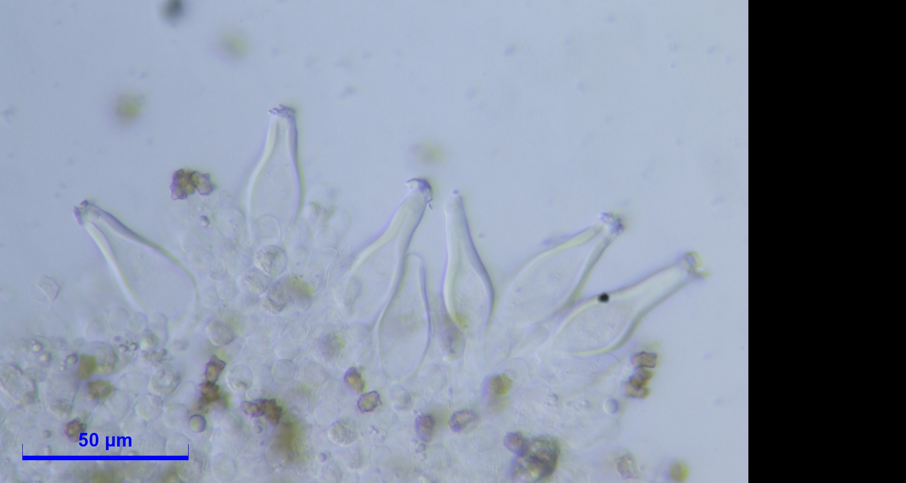 Caulozystiden teils pyriform, bauchig bis fusiform, langeniform, eher flaschenförmig, teils mit Kristallschopf, dann ganz ähnlich den Hymenialzystiden.