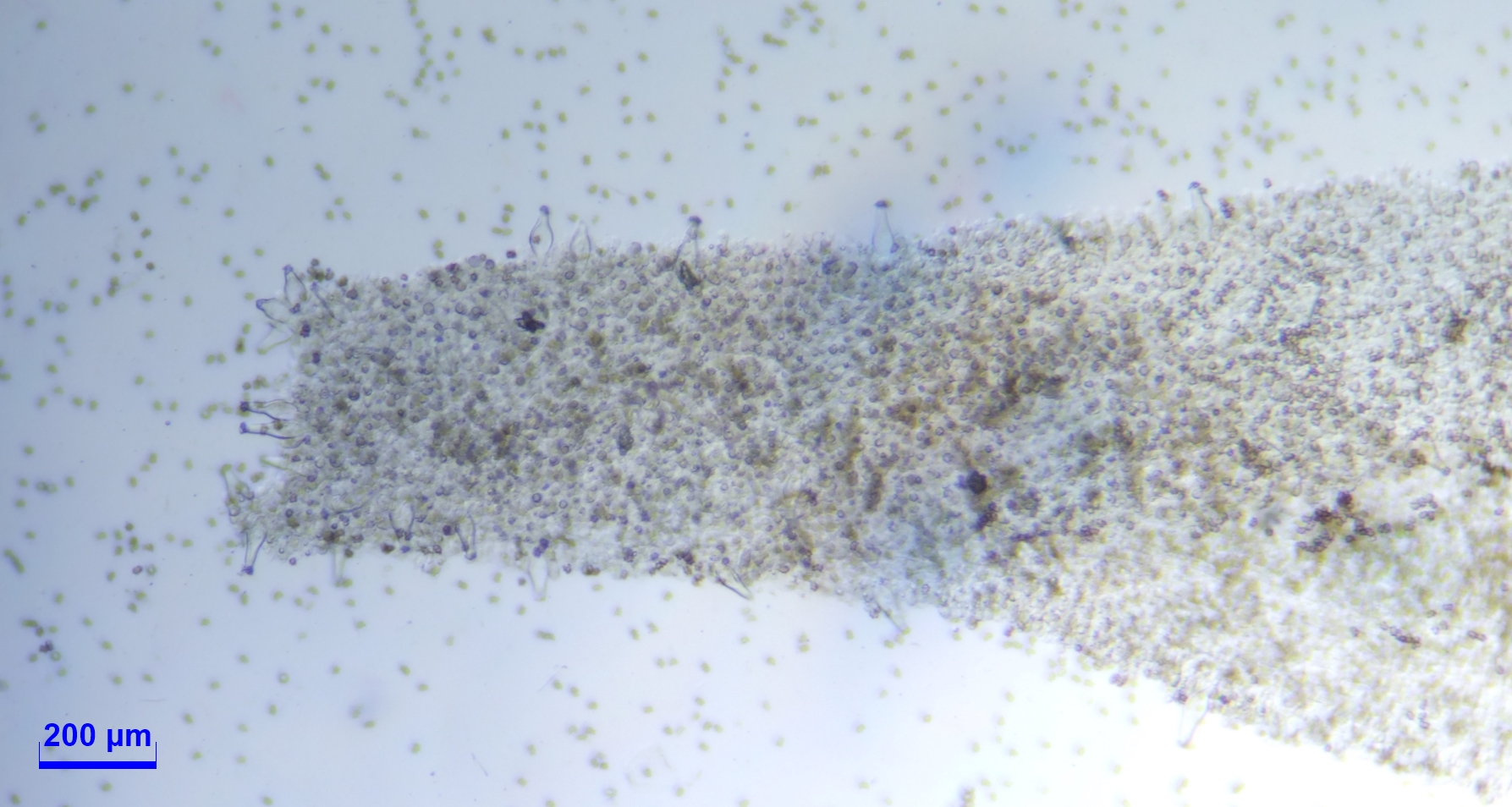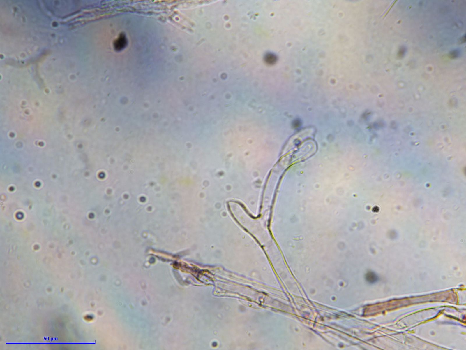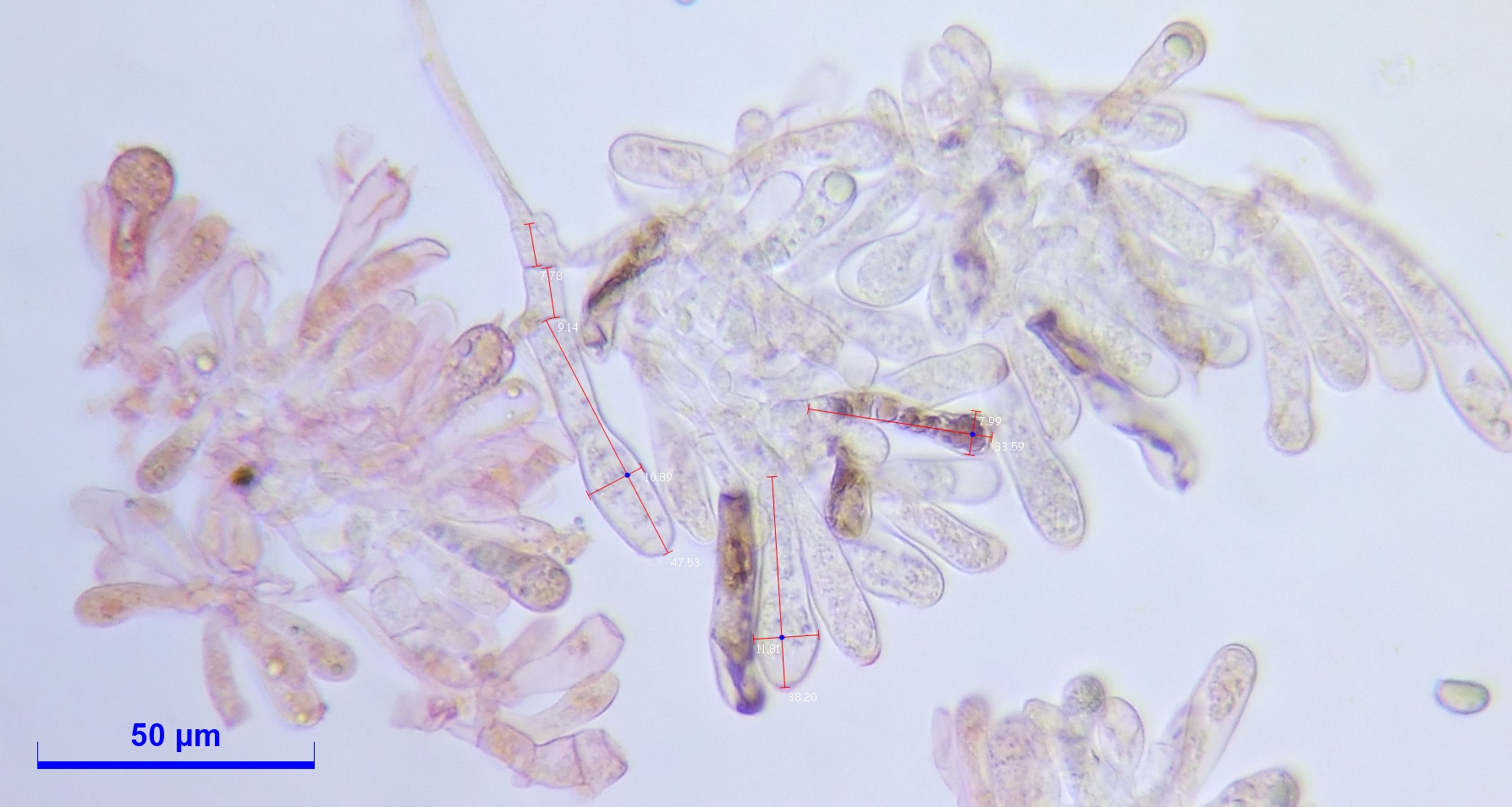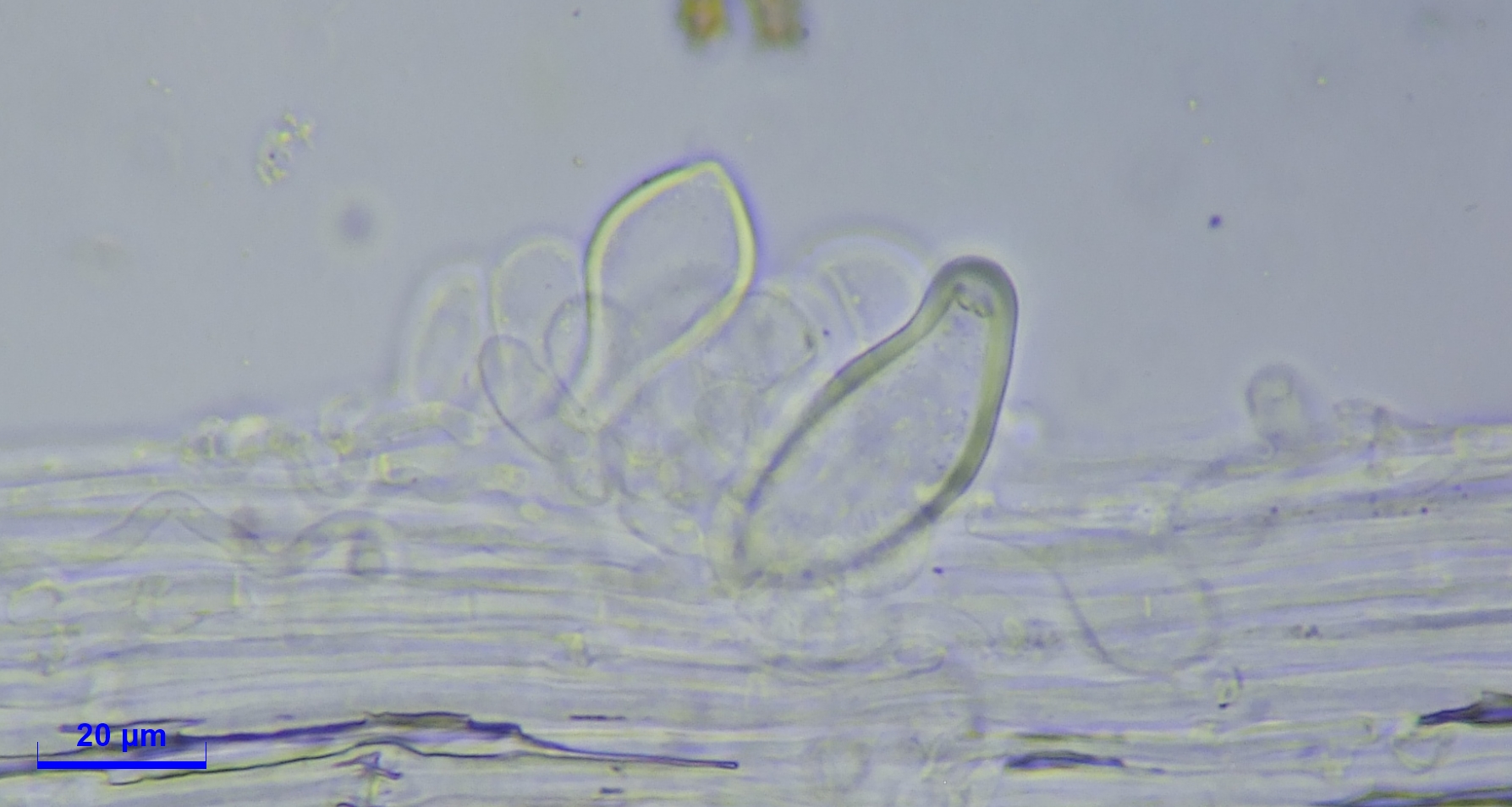 Caulozystiden teils pyriform, bauchig bis fusiform, langeniform, eher flaschenförmig, teils mit Kristallschopf, dann ganz ähnlich den Hymenialzystiden.