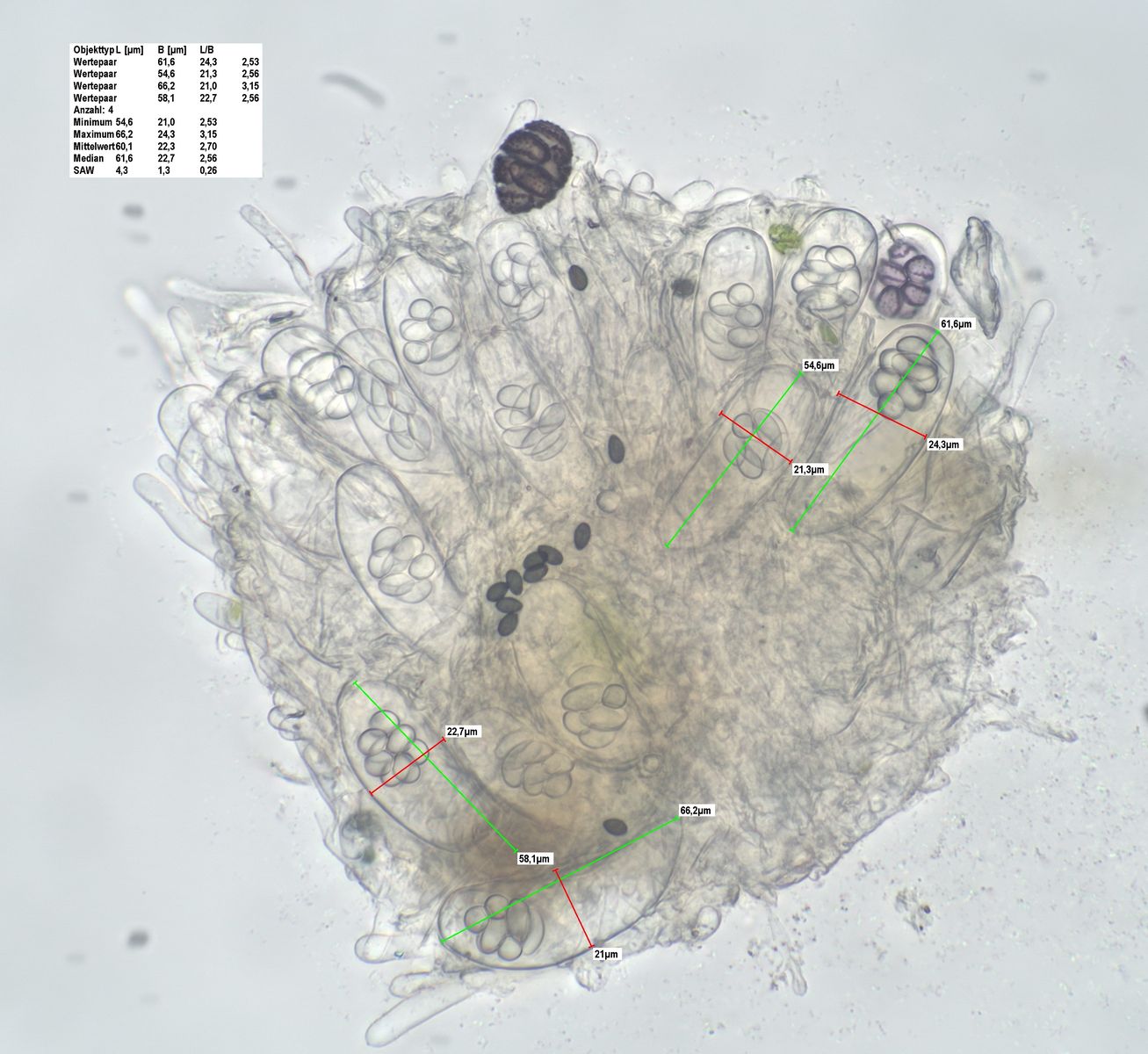 Spore: (Teilsporen): (4.2) 4.3 - 4.9 (5.2) × (2.2) 2.5 - 2.89 (2.9) µm; Q = (1.6) 1.62 - 2 (2.1) ; N = 13. Me = 4.6 × 2.6 µm ; Qe = 1.8.