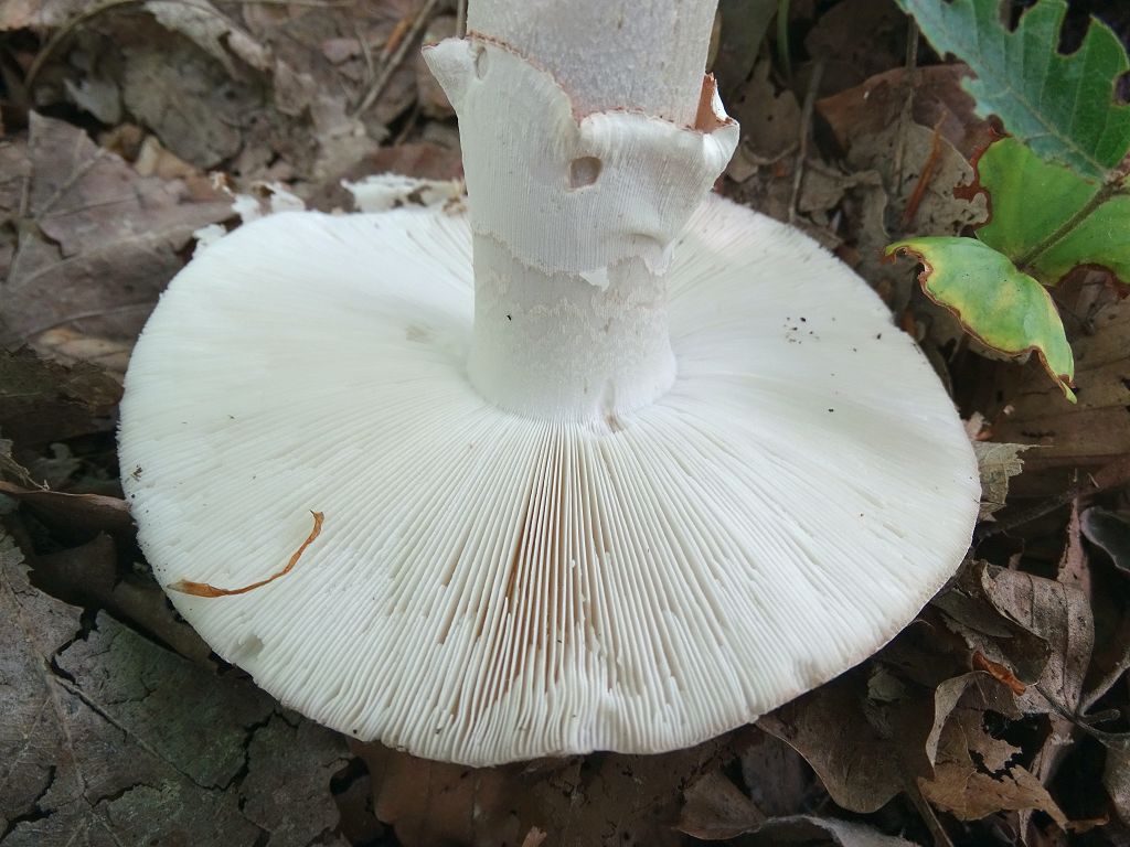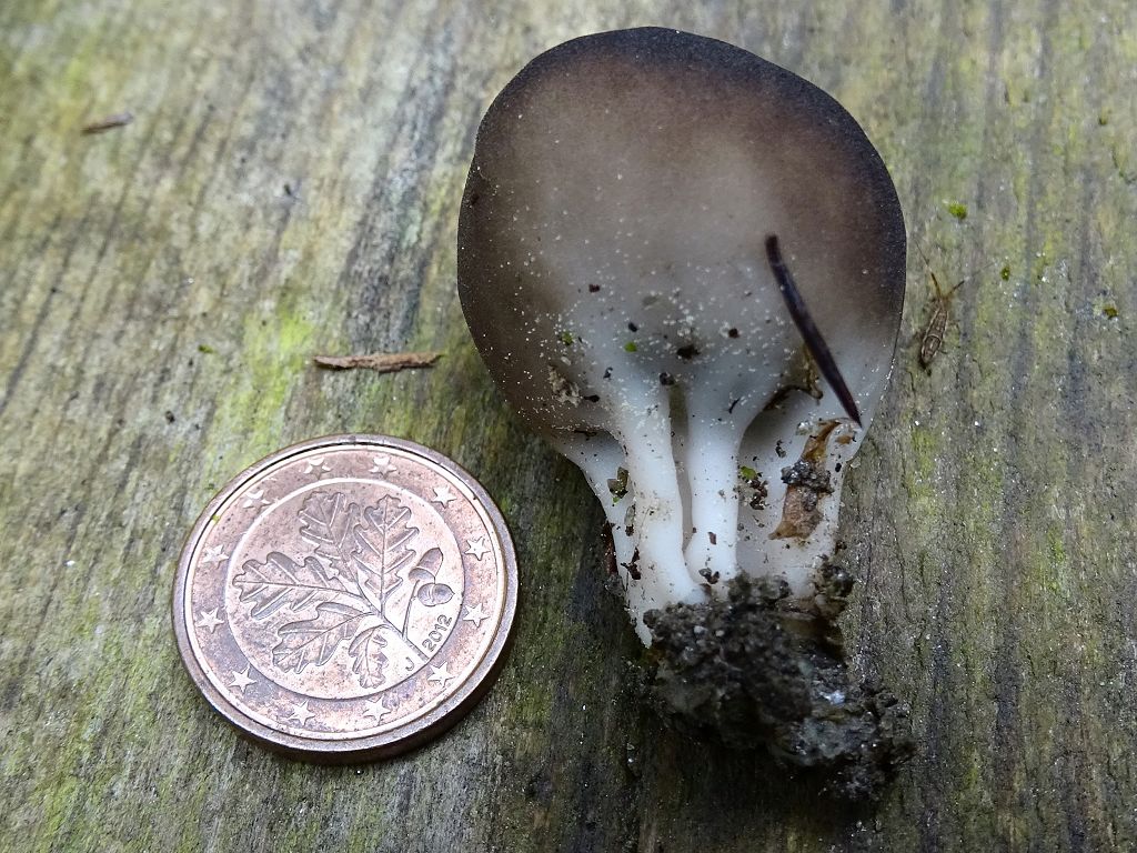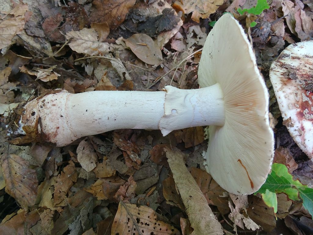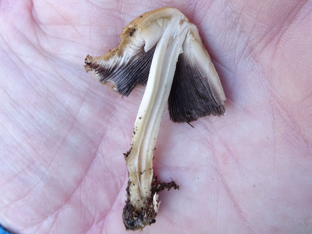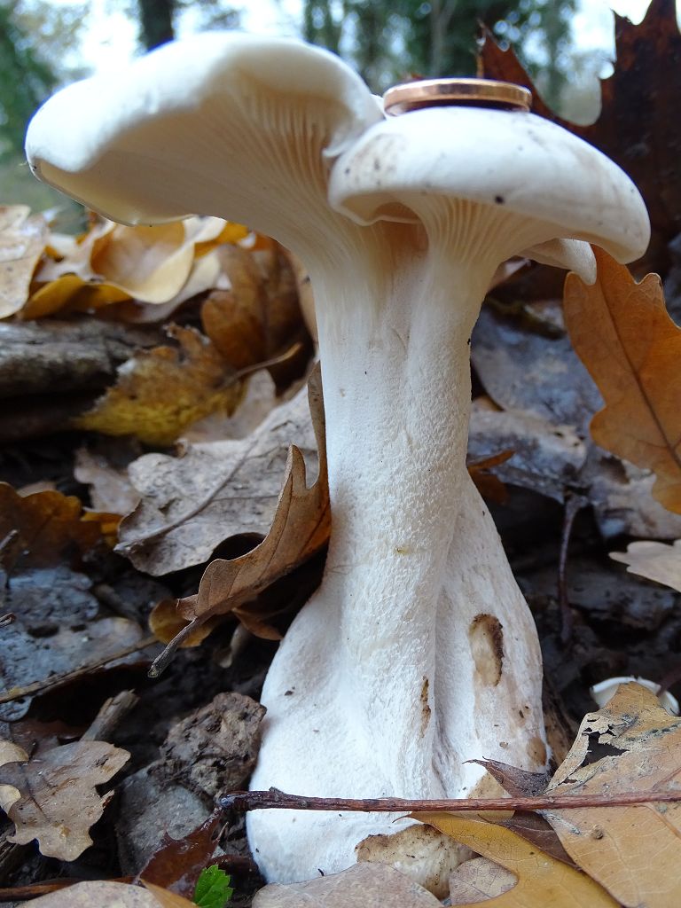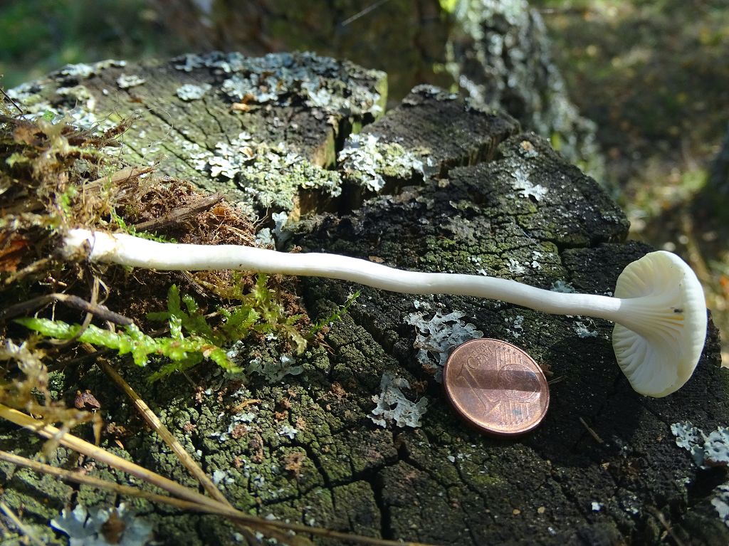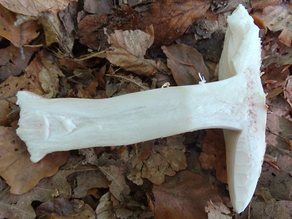 Stiel: weißlich, zerbrechlich, mit dicker Knolle, die übergangslos in den Stiel übergeht, Ring weiß, nach unten hängend, vergänglich, glatt.