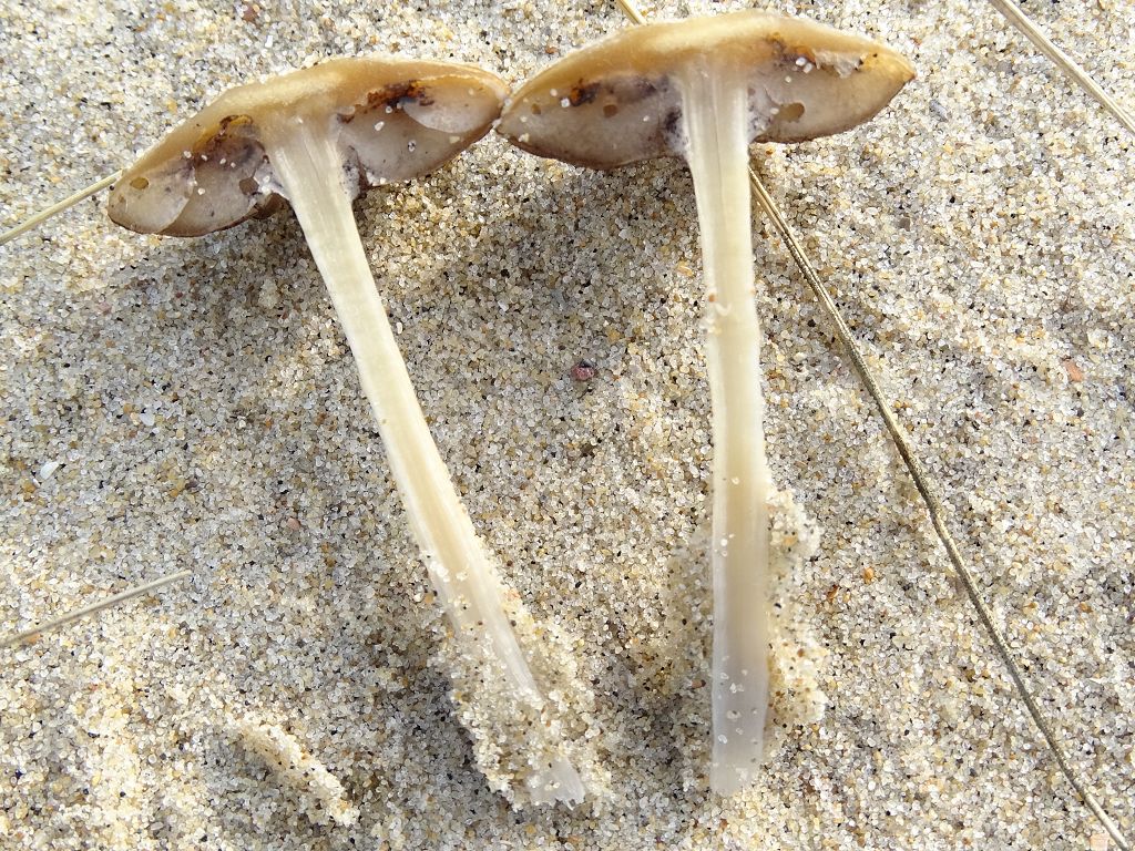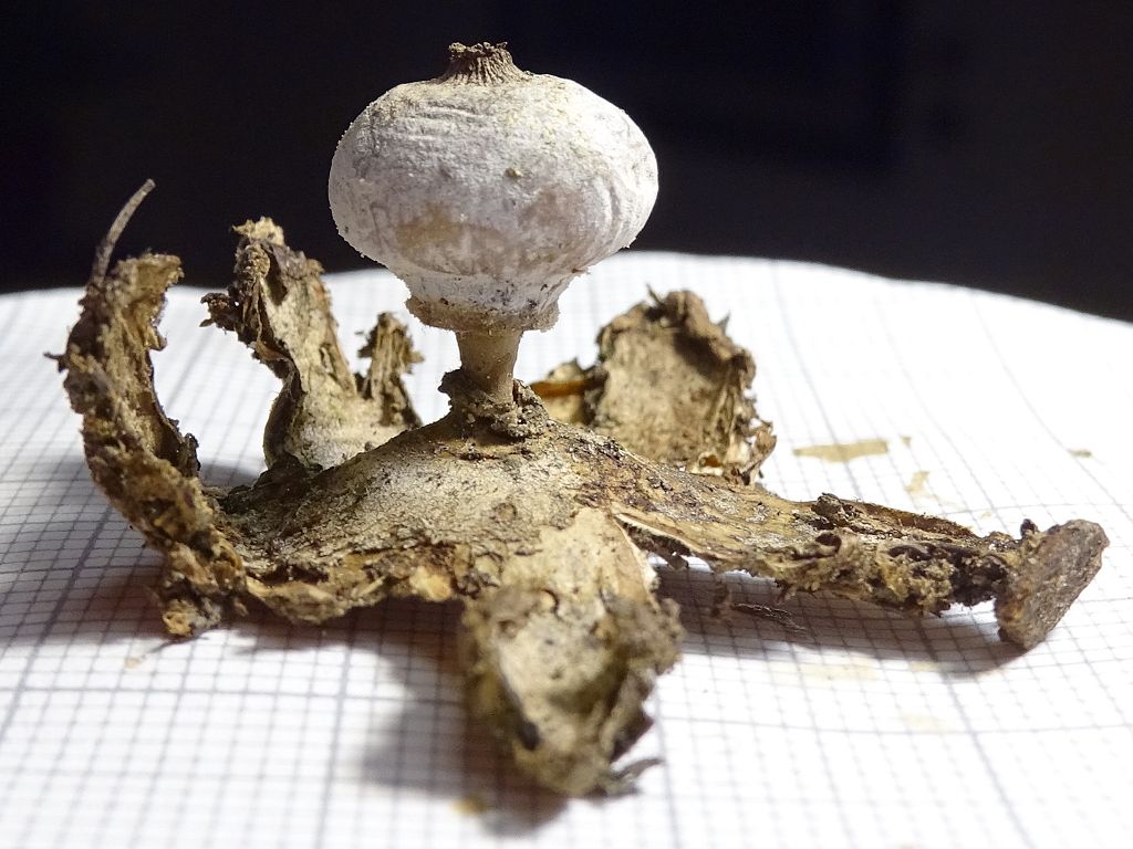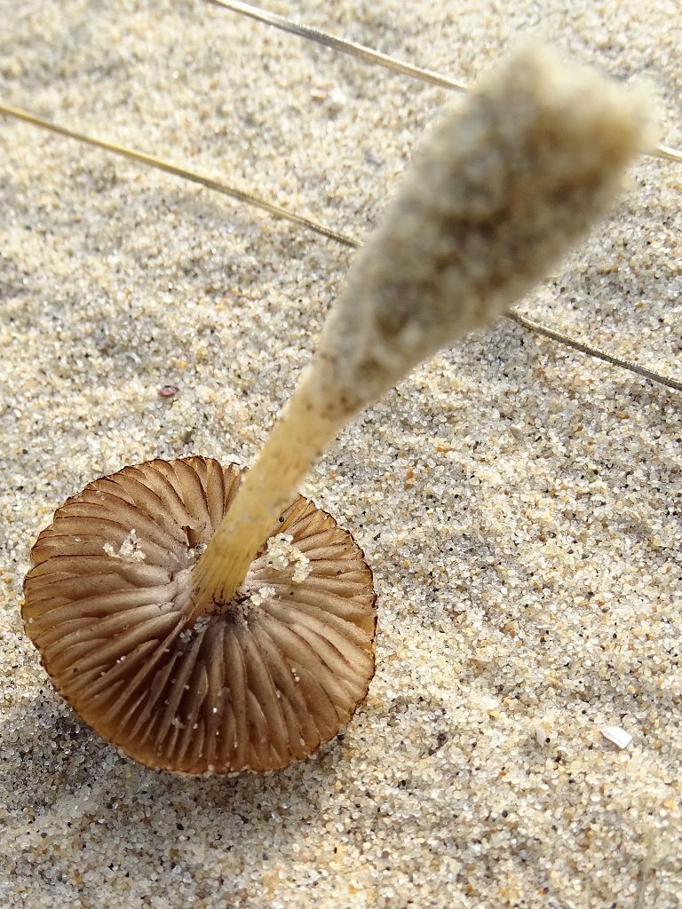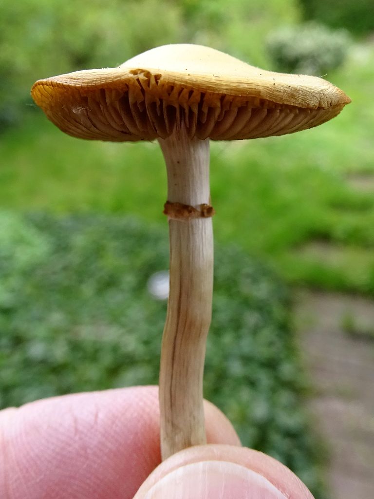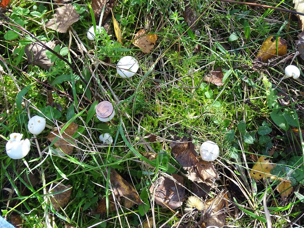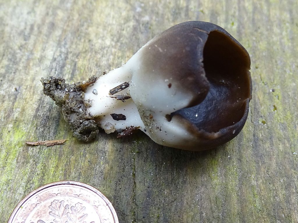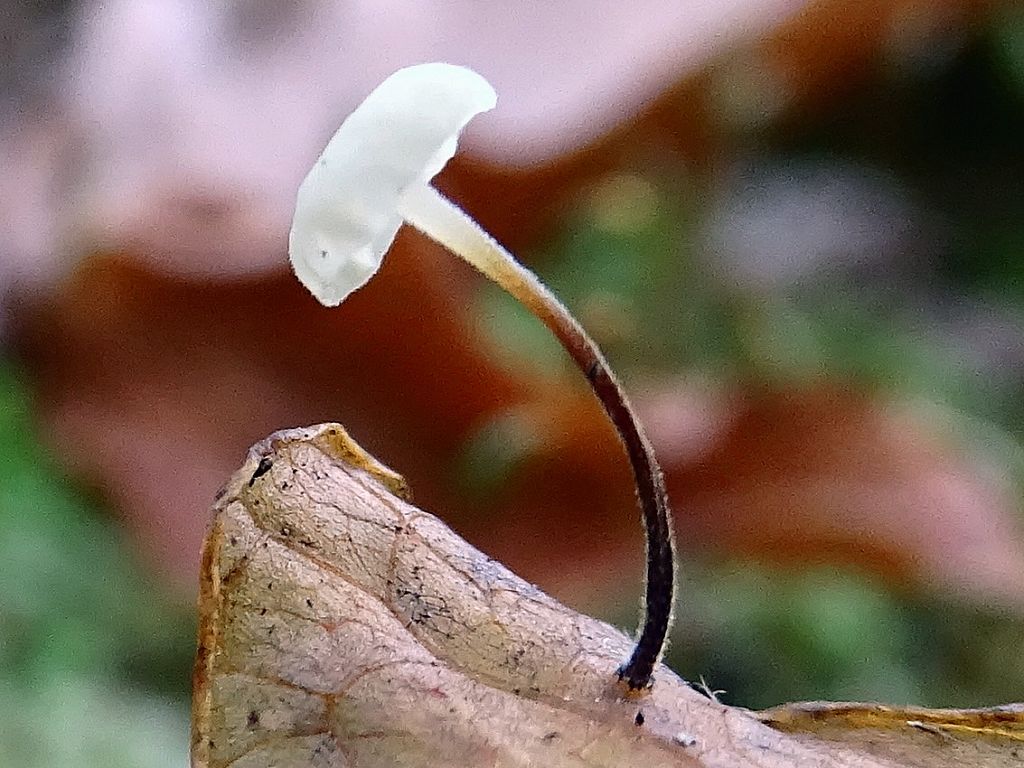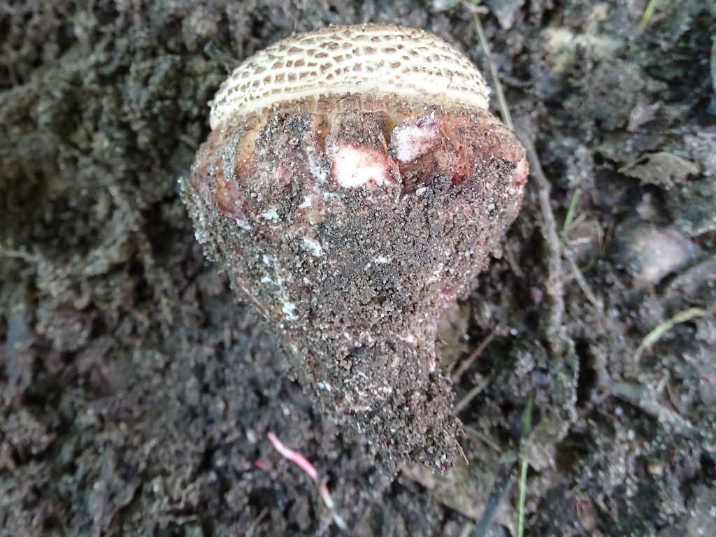 Stiel: weißlich, zerbrechlich, mit dicker Knolle, die übergangslos in den Stiel übergeht, Ring weiß, nach unten hängend, vergänglich, glatt.