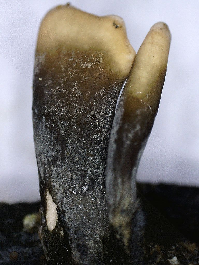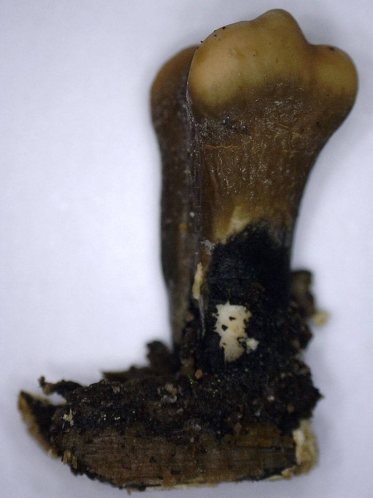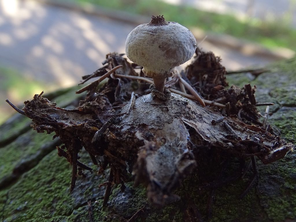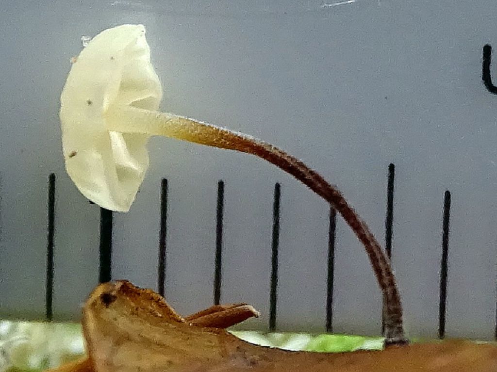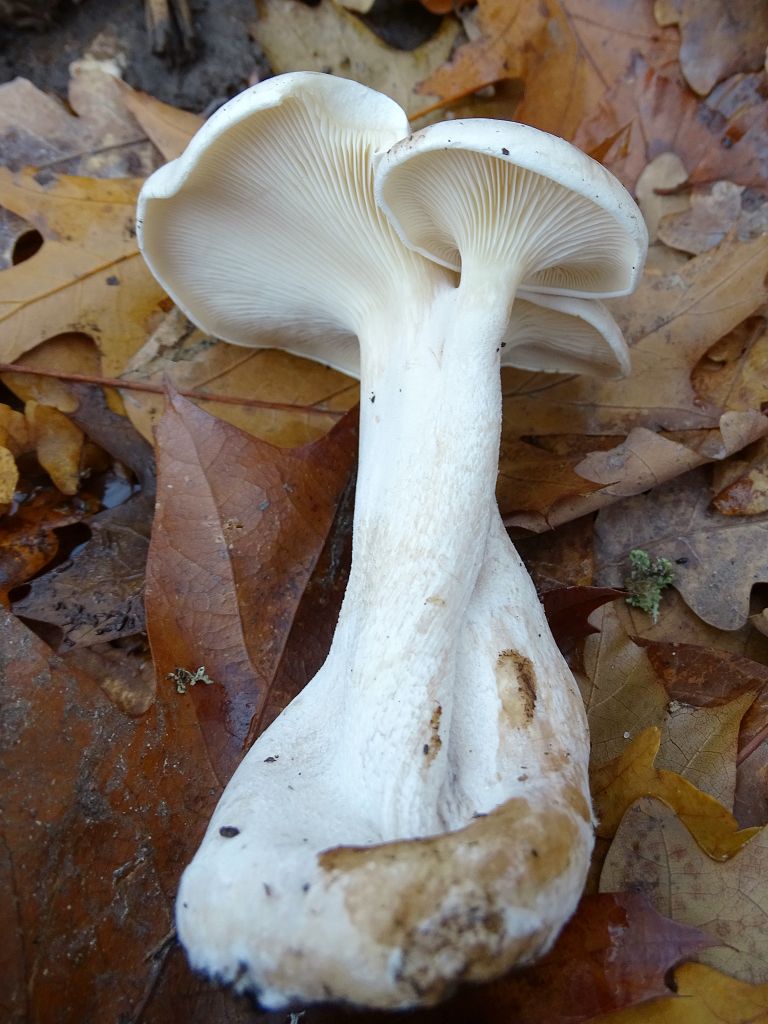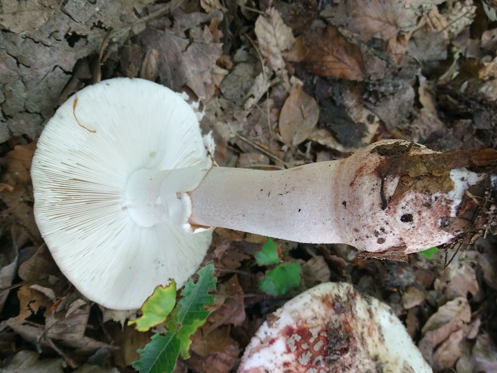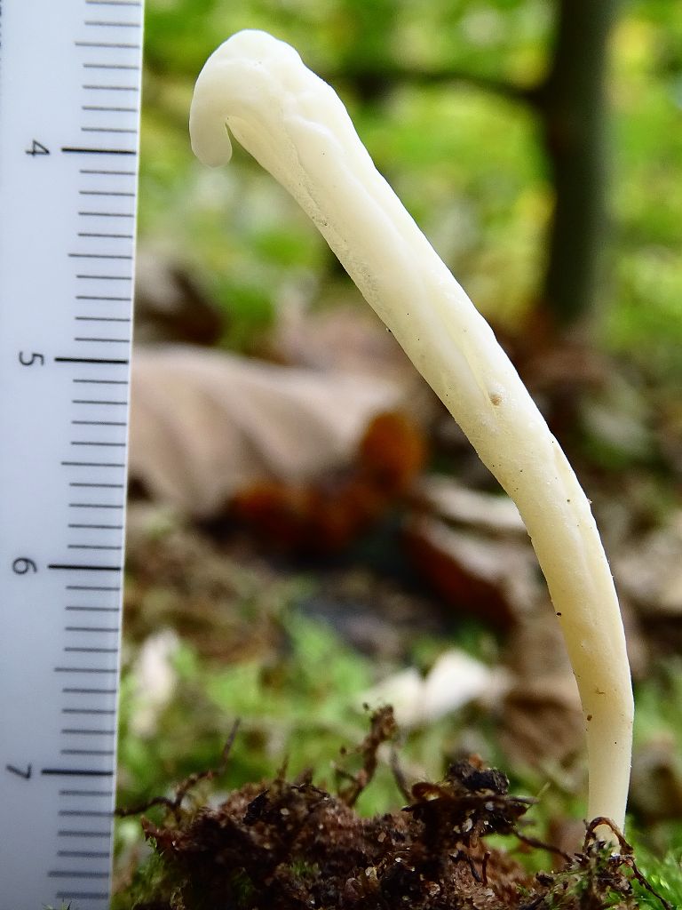 Stiel: weißlich, zerbrechlich, mit dicker Knolle, die übergangslos in den Stiel übergeht, Ring weiß, nach unten hängend, vergänglich, glatt.