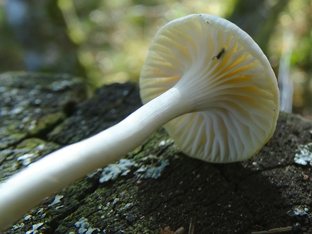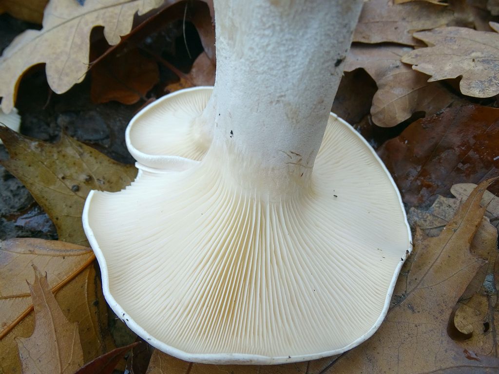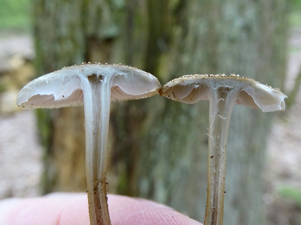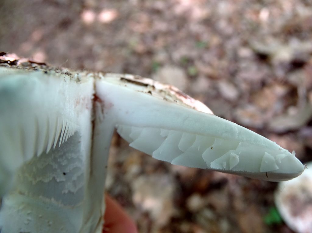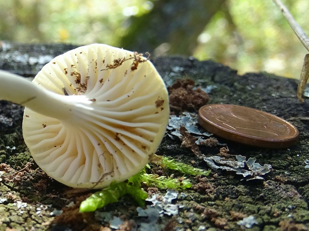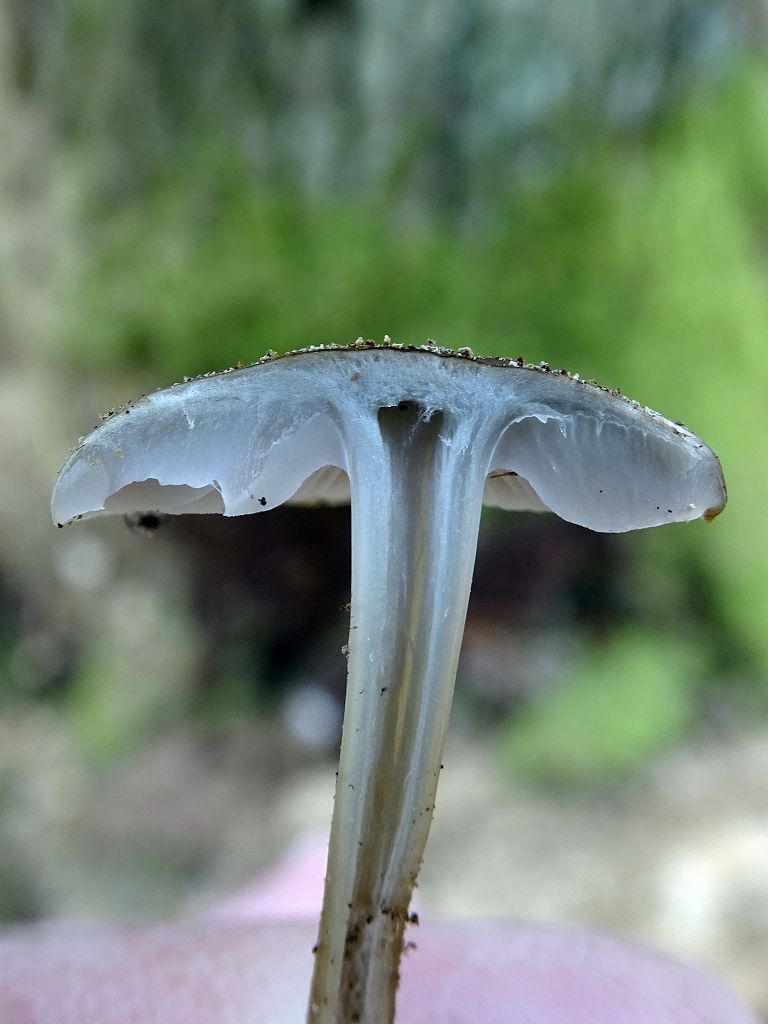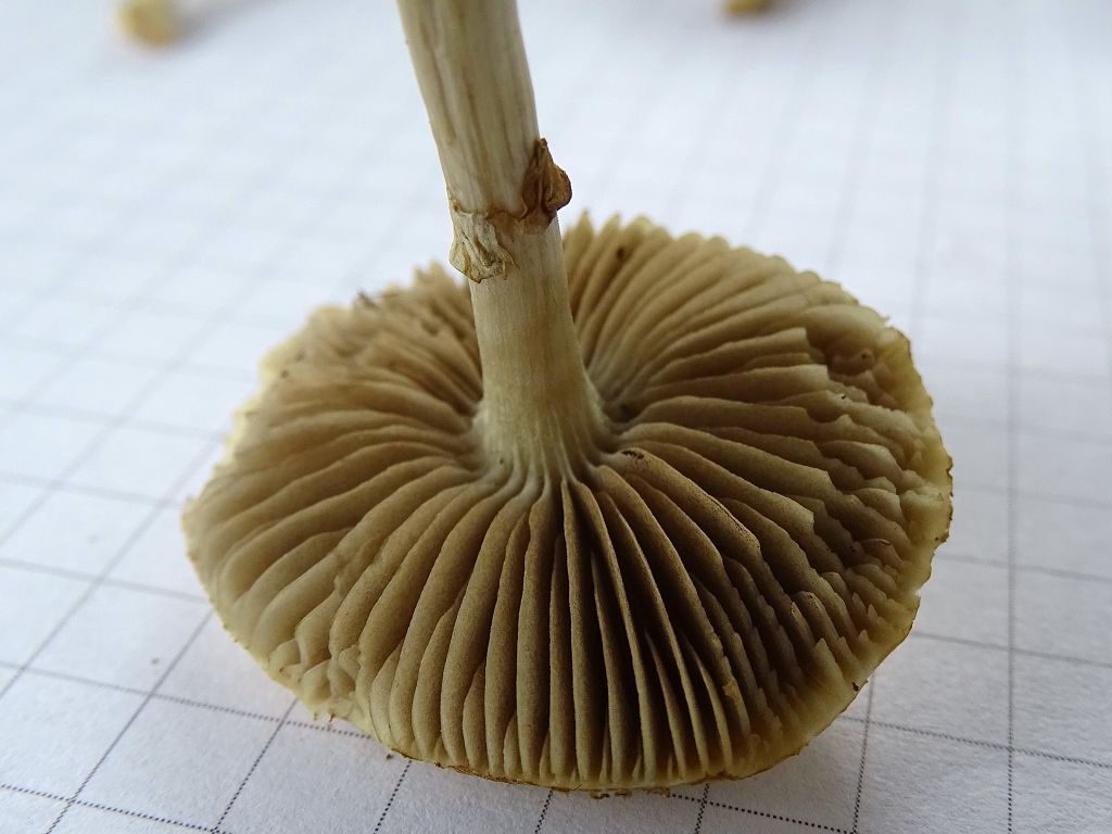 Lamellen: weißlich, schmal angewachsen, eng stehend, mit Zwischenlamellen, Schneiden glatt (Lupe).