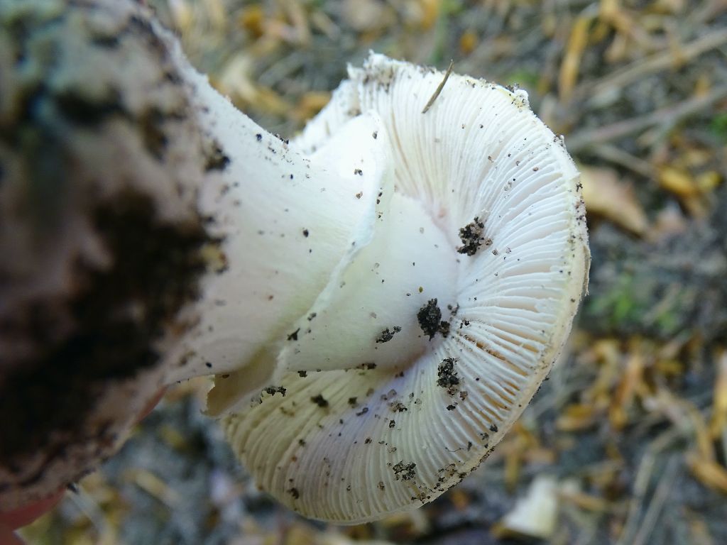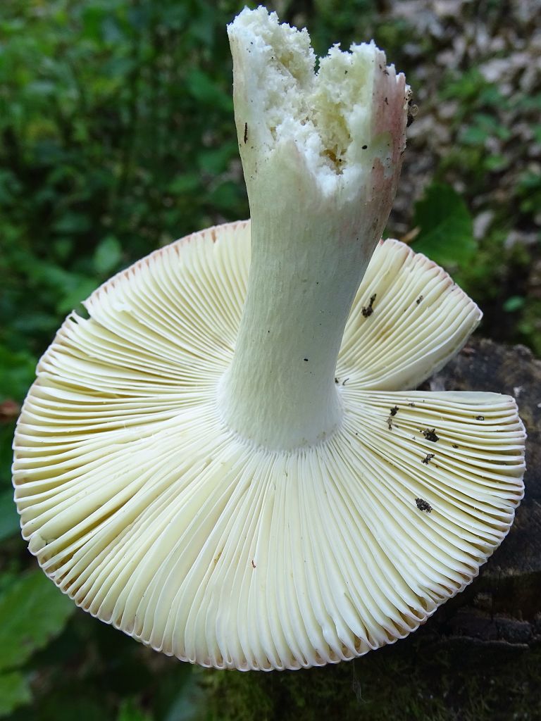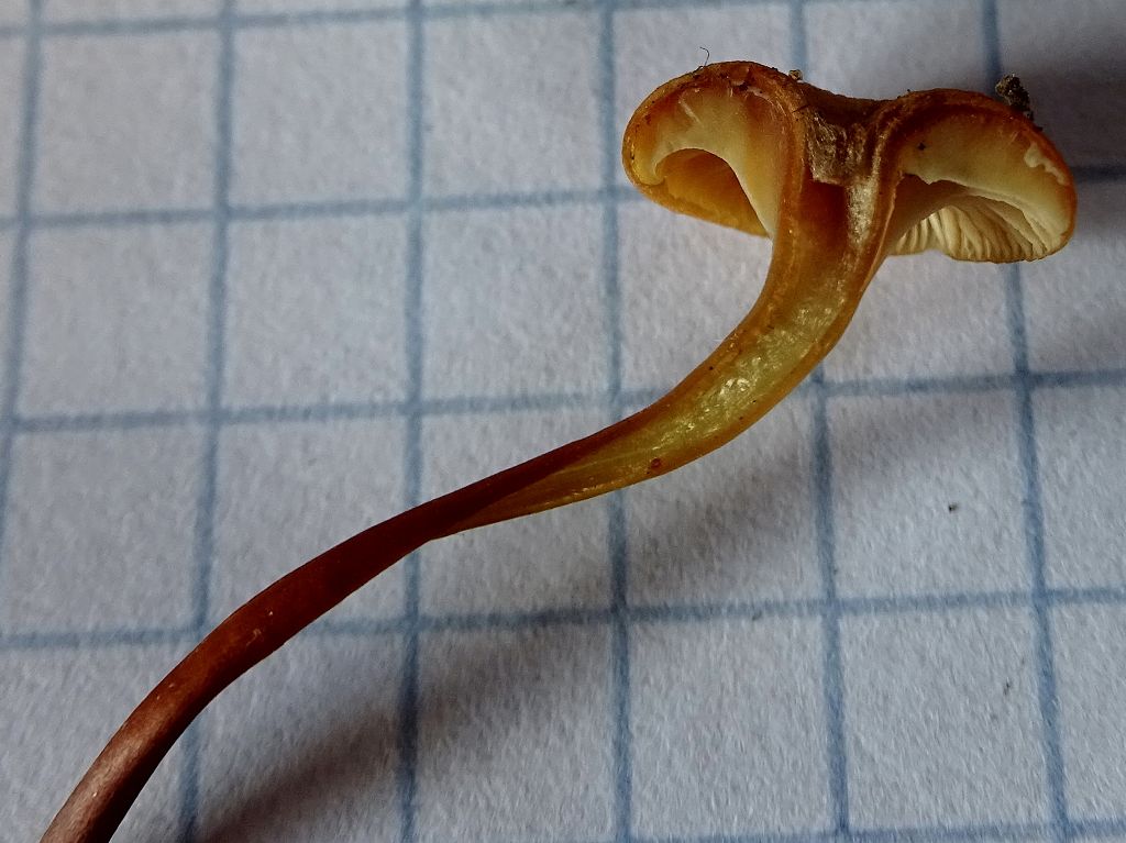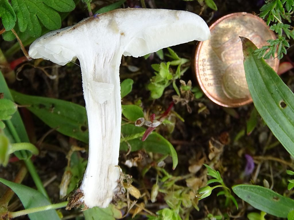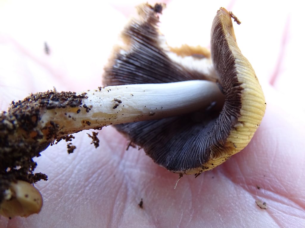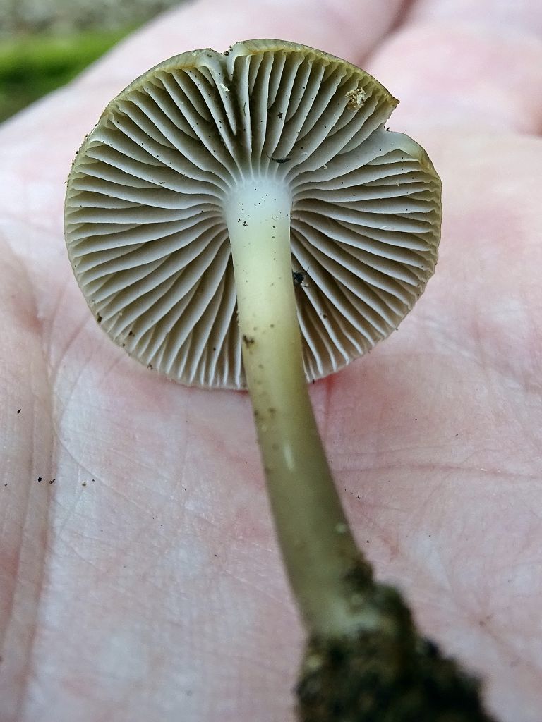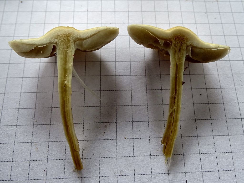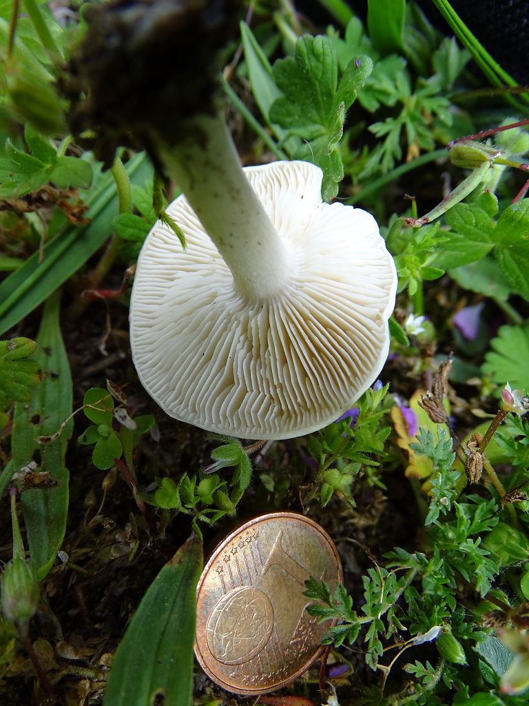Lamellen: weißlich, schmal angewachsen, eng stehend, mit Zwischenlamellen, Schneiden glatt (Lupe).