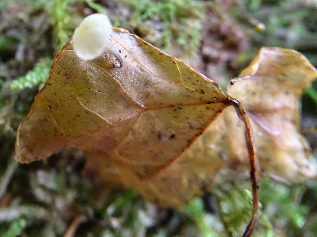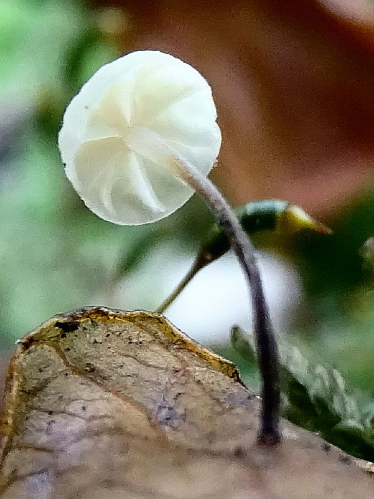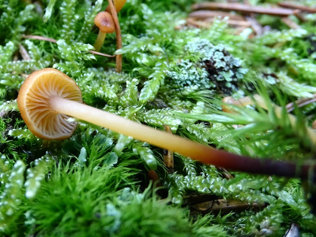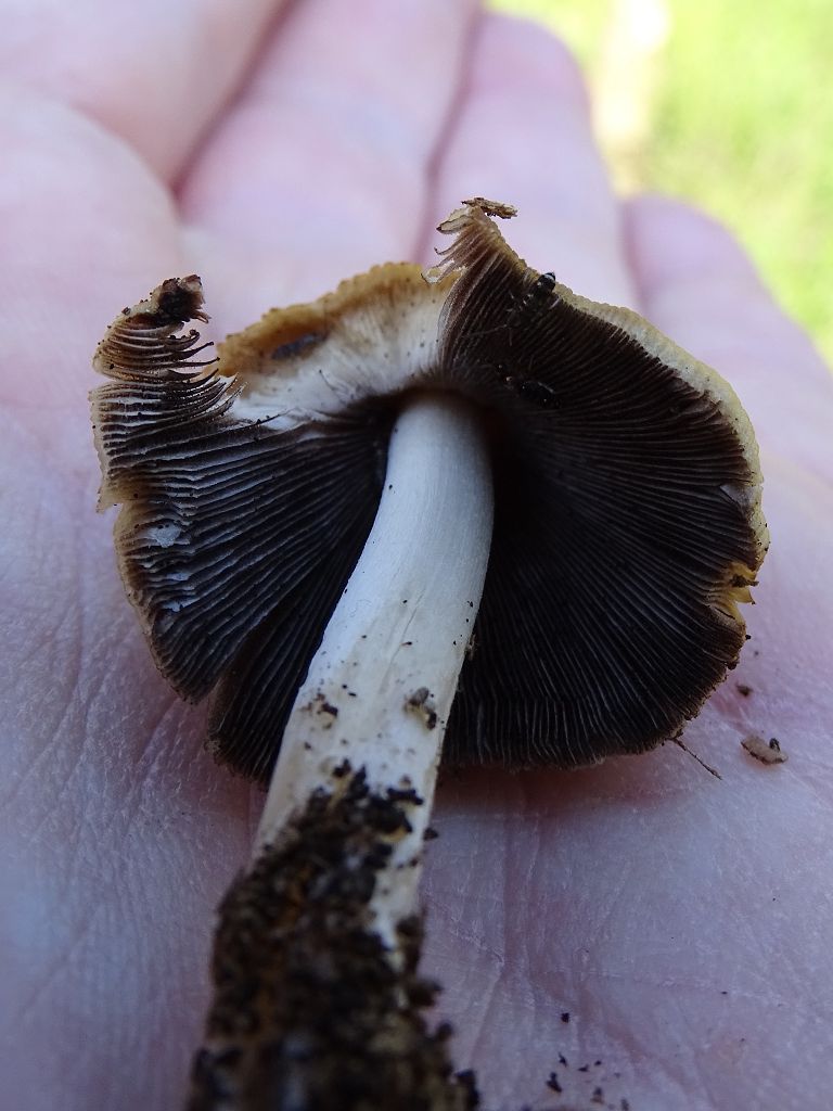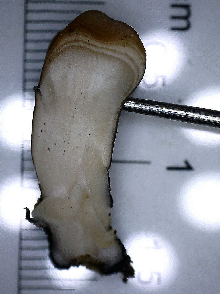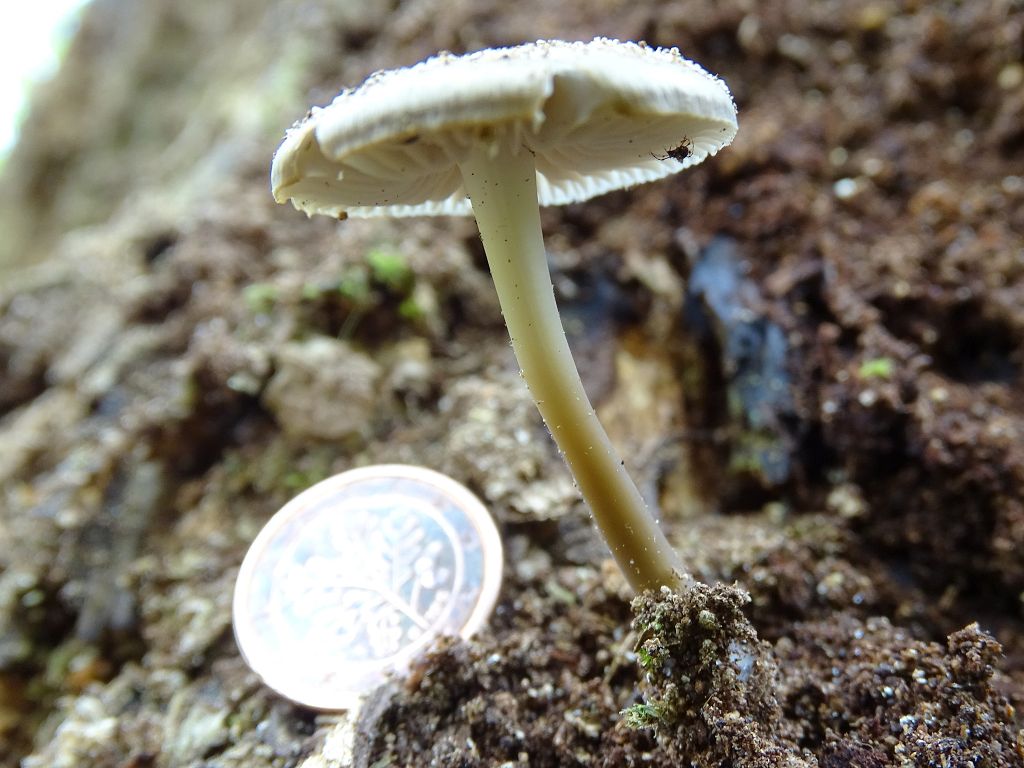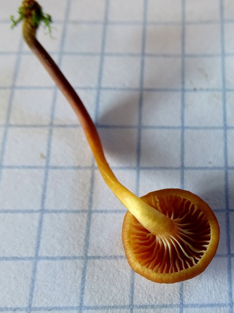 Lamellen: weißlich, schmal angewachsen, eng stehend, mit Zwischenlamellen, Schneiden glatt (Lupe).