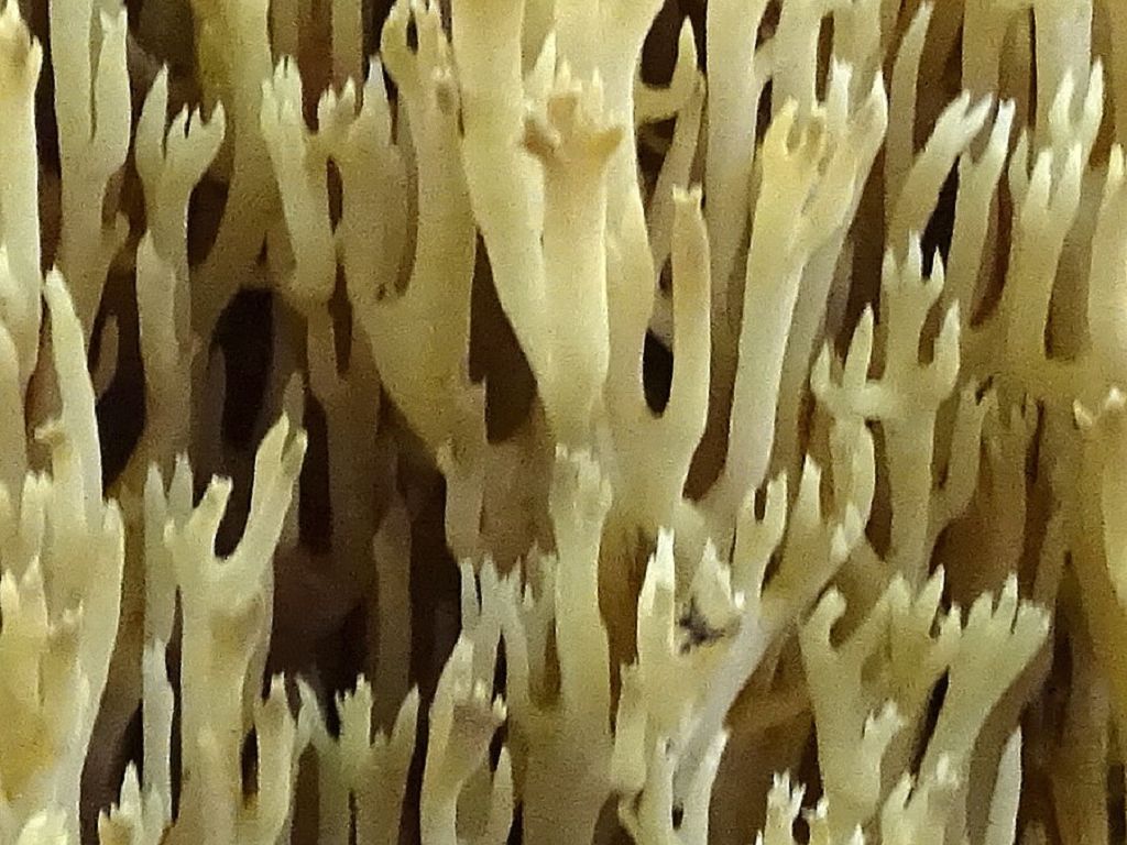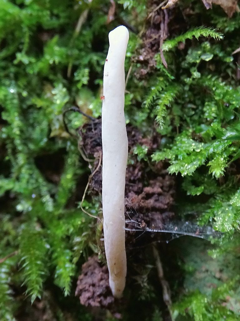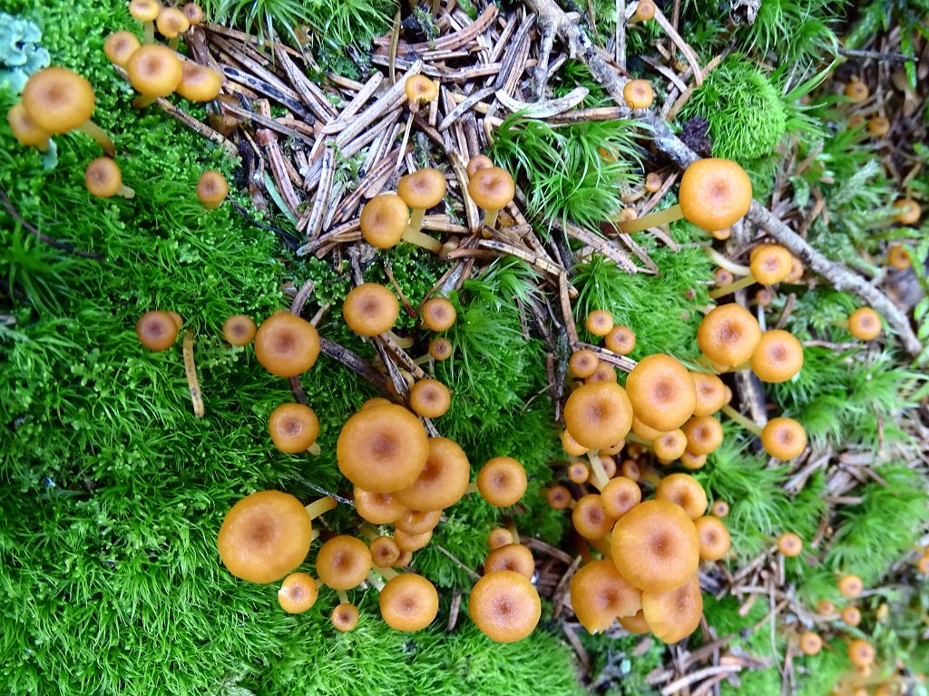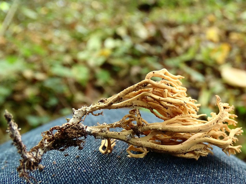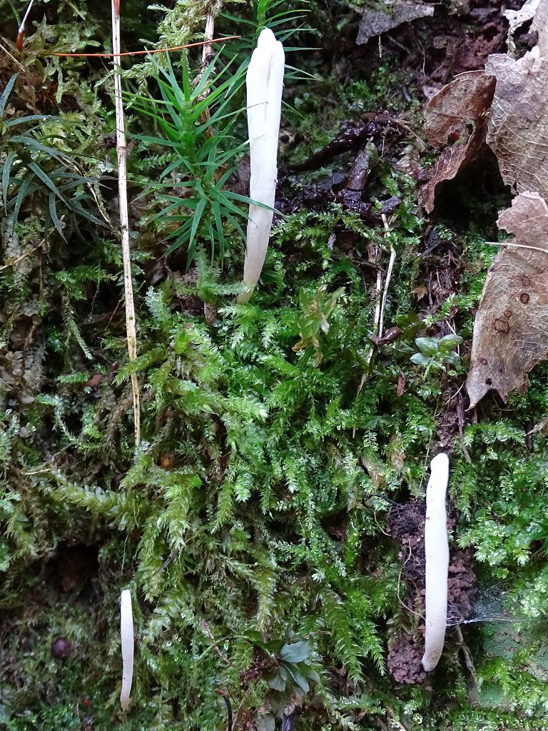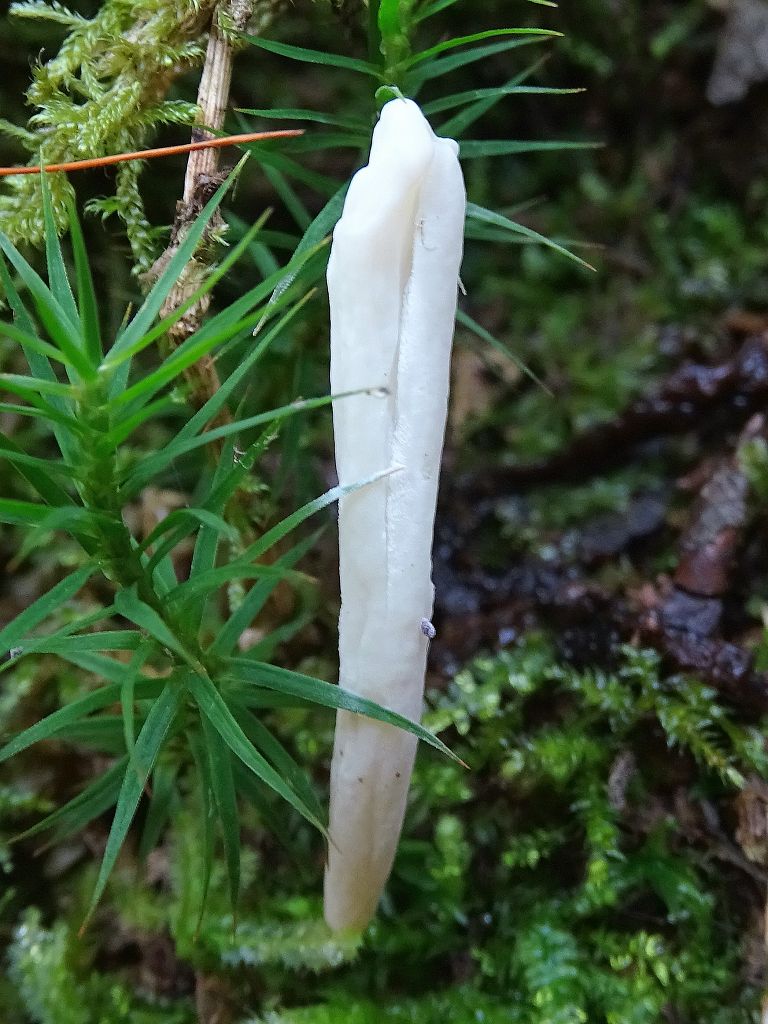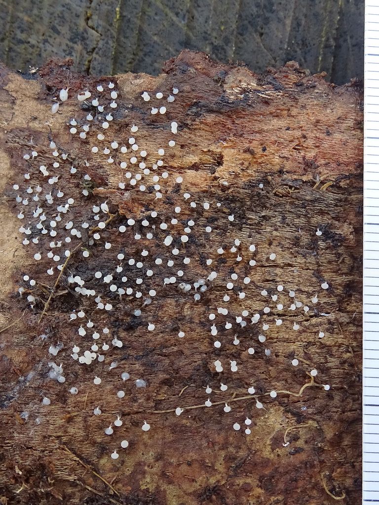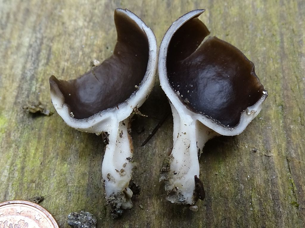 Lamellen: weißlich, schmal angewachsen, eng stehend, mit Zwischenlamellen, Schneiden glatt (Lupe).