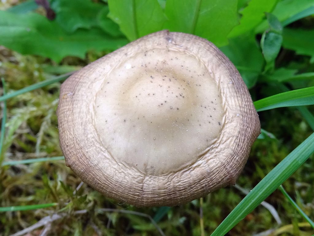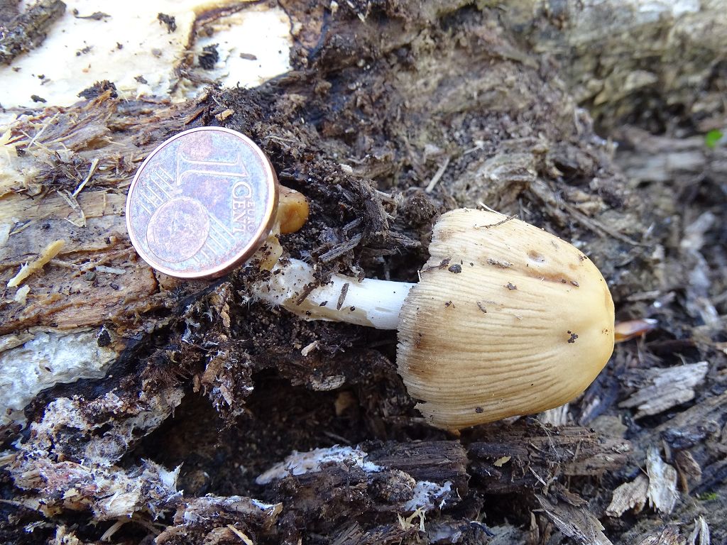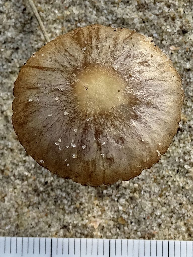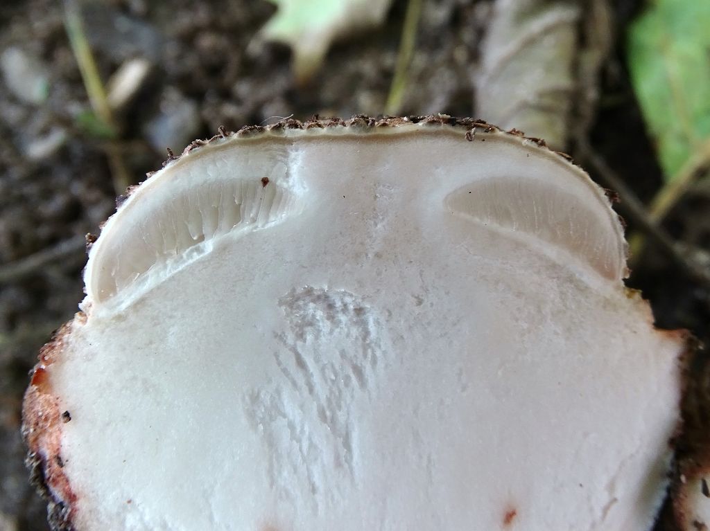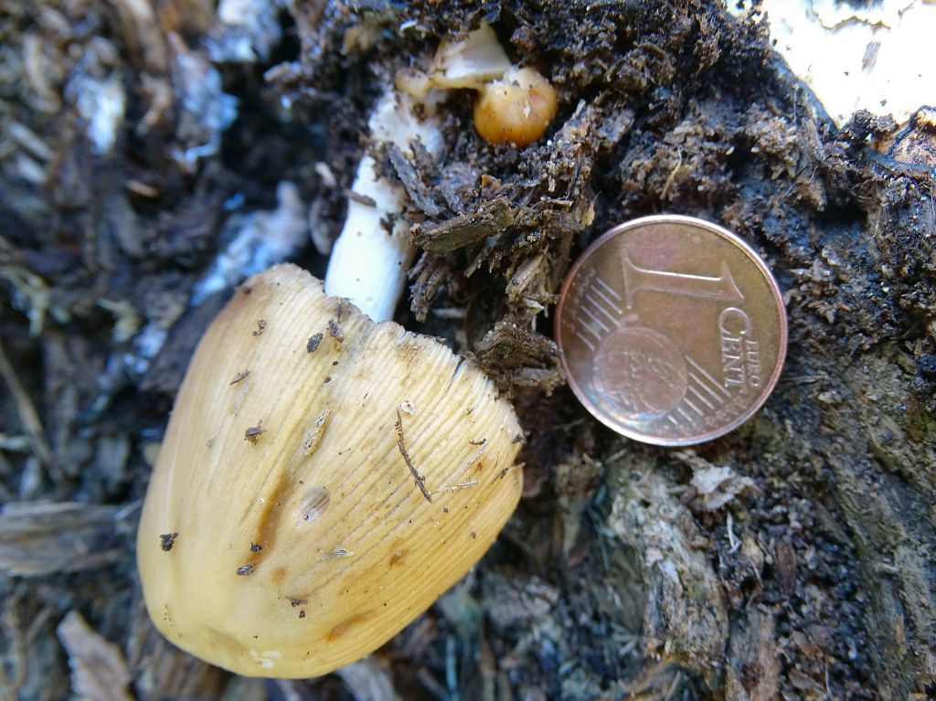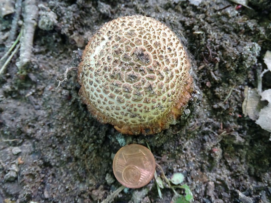 Hut: beige, glatt, matt, Mitte dunkler, großflächig mit Velumresten bedeckt, Rand leicht gerieft, Huthaut abziehbar.